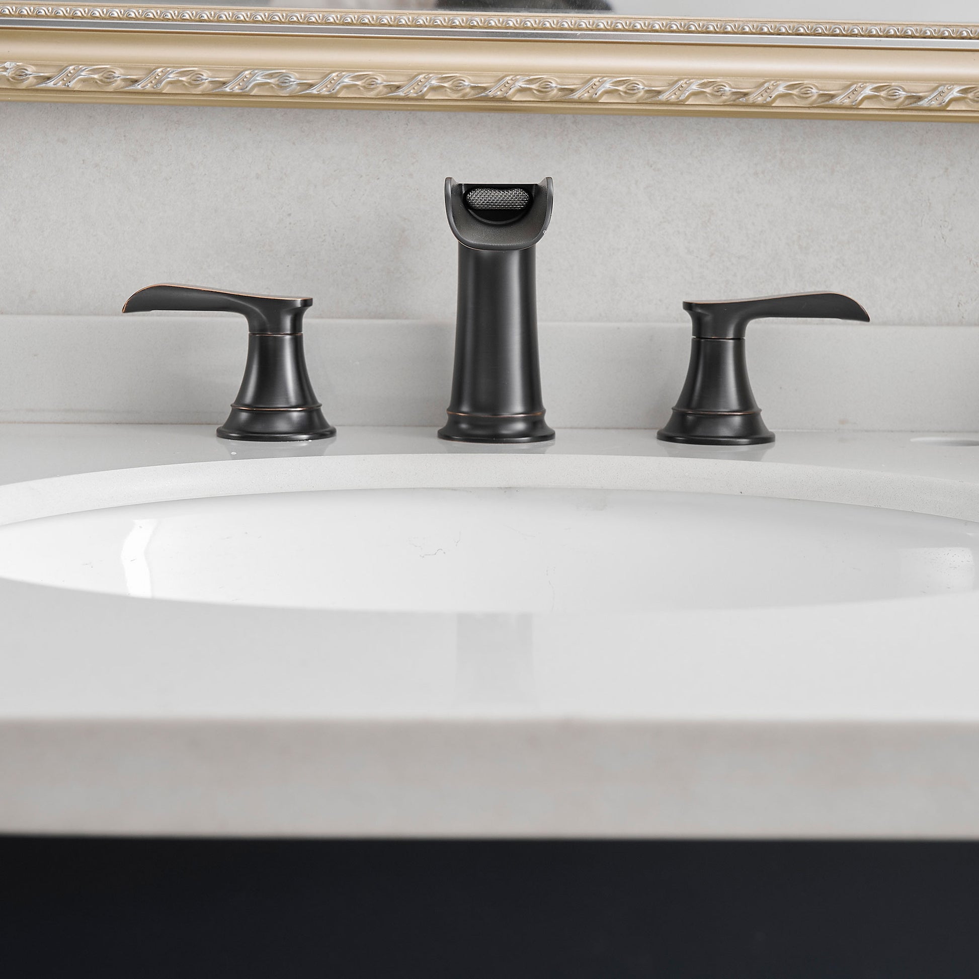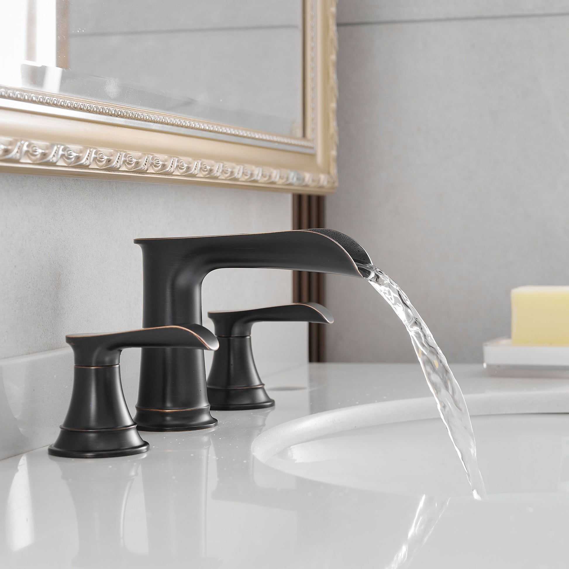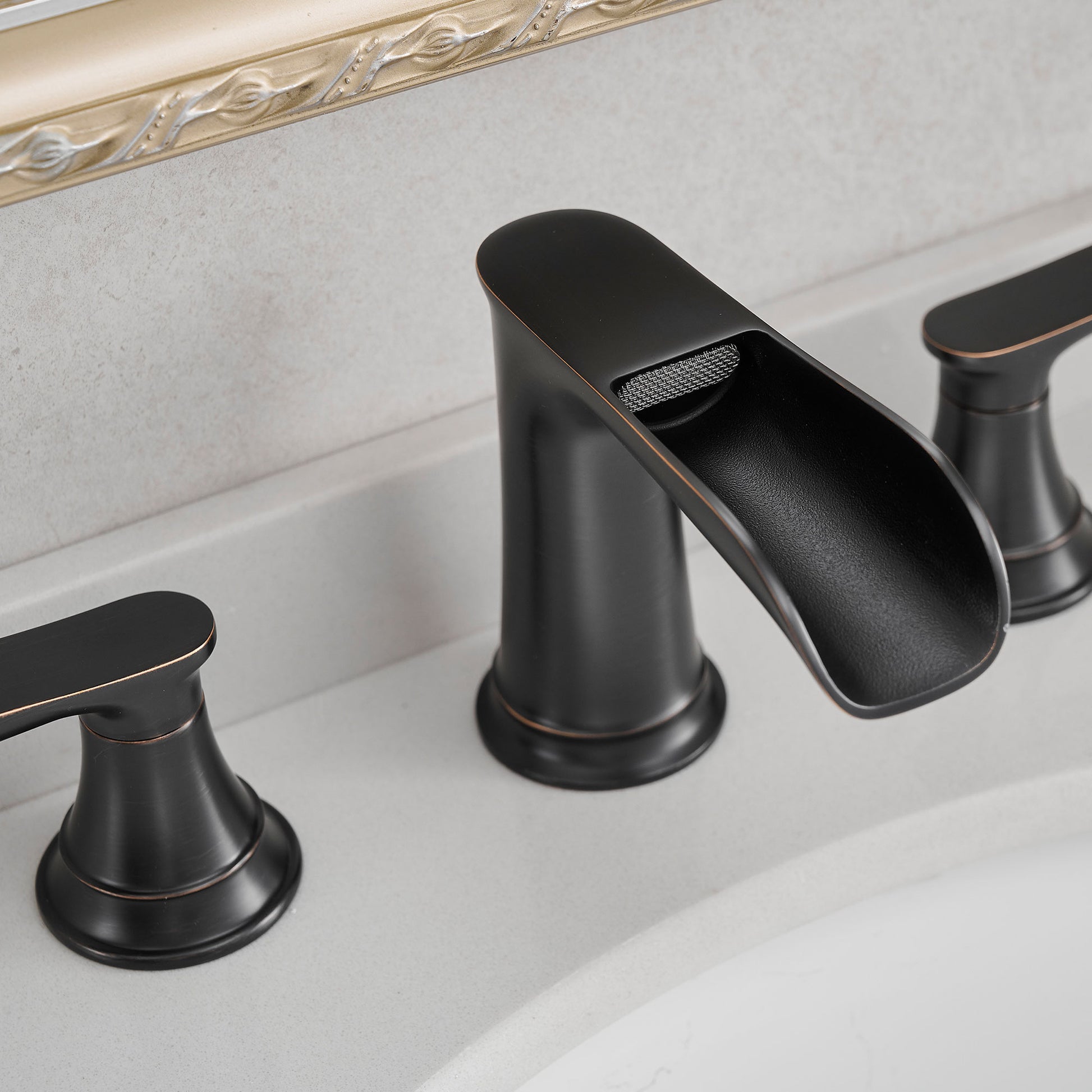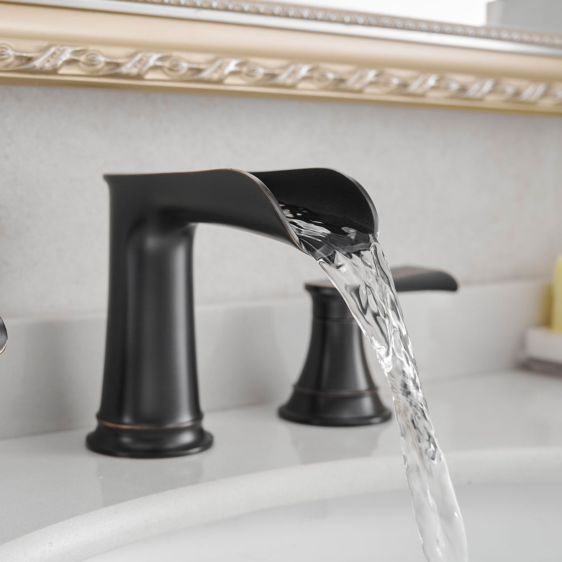 The 8 Inch Widespread Double Handle Brass Bathroom Faucet in Oil Rubbed Bronze features dual handles with clear hot and cold markers for effortless control of water flow and temperature. Equipped with durable ceramic disc cartridges that exceed industry longevity standards, it ensures smooth, leak-free operation for the lifetime of the faucet. Its unique spout design provides full-range washing access with an aerated stream, ideal for brushing teeth, washing hands, or rinsing your face. Advanced plating and high-quality materials make the finish tarnish- and corrosion-resistant, maintaining its vibrant look and long-term durability. A soft-flow bubbler prevents splashing, conserves water, and enhances comfort. Designed for easy DIY installation, it fits 3-hole widespread sinks (5–16 in.) and includes a quick-connect hose for fast, secure setup. After-sales support is available within 24 hours.