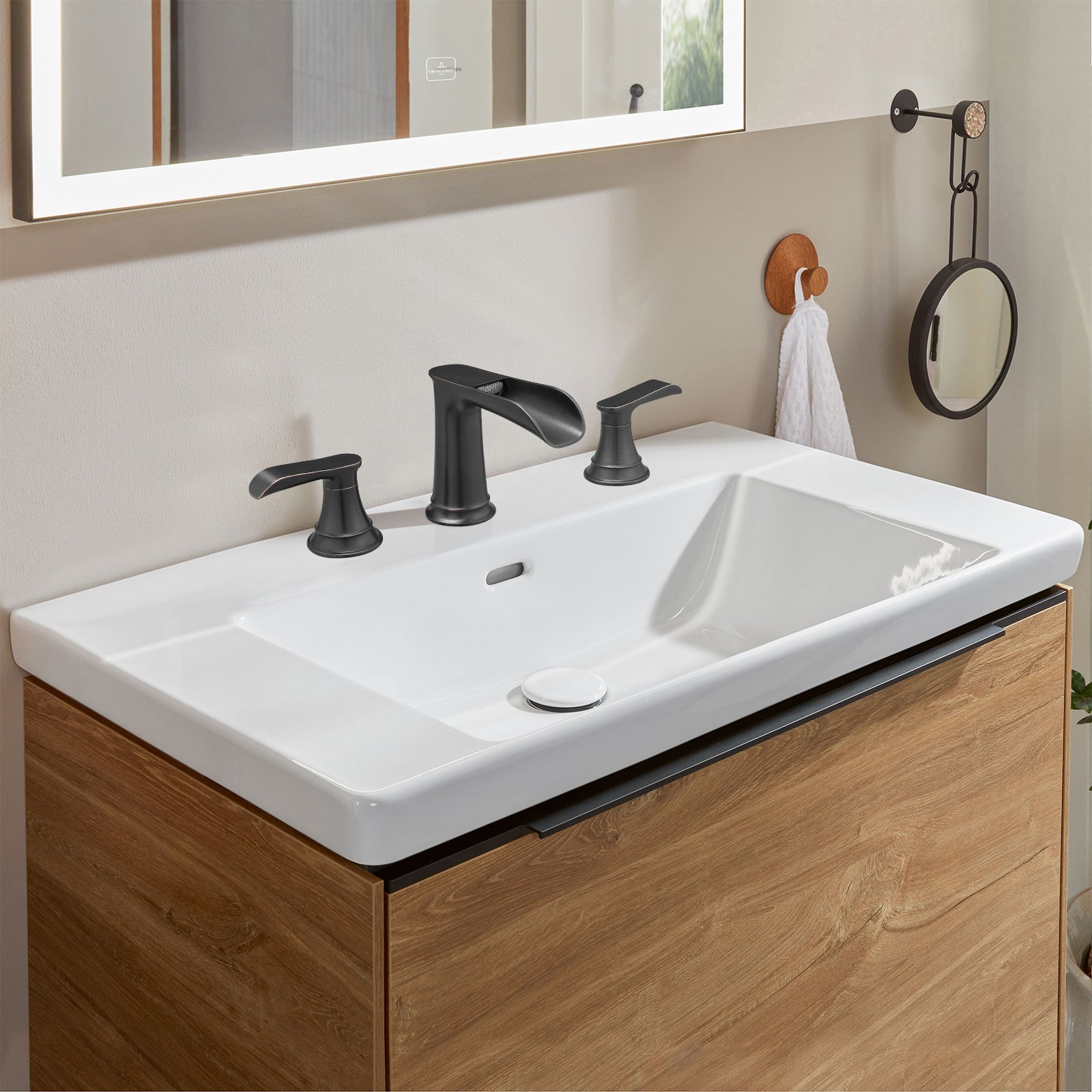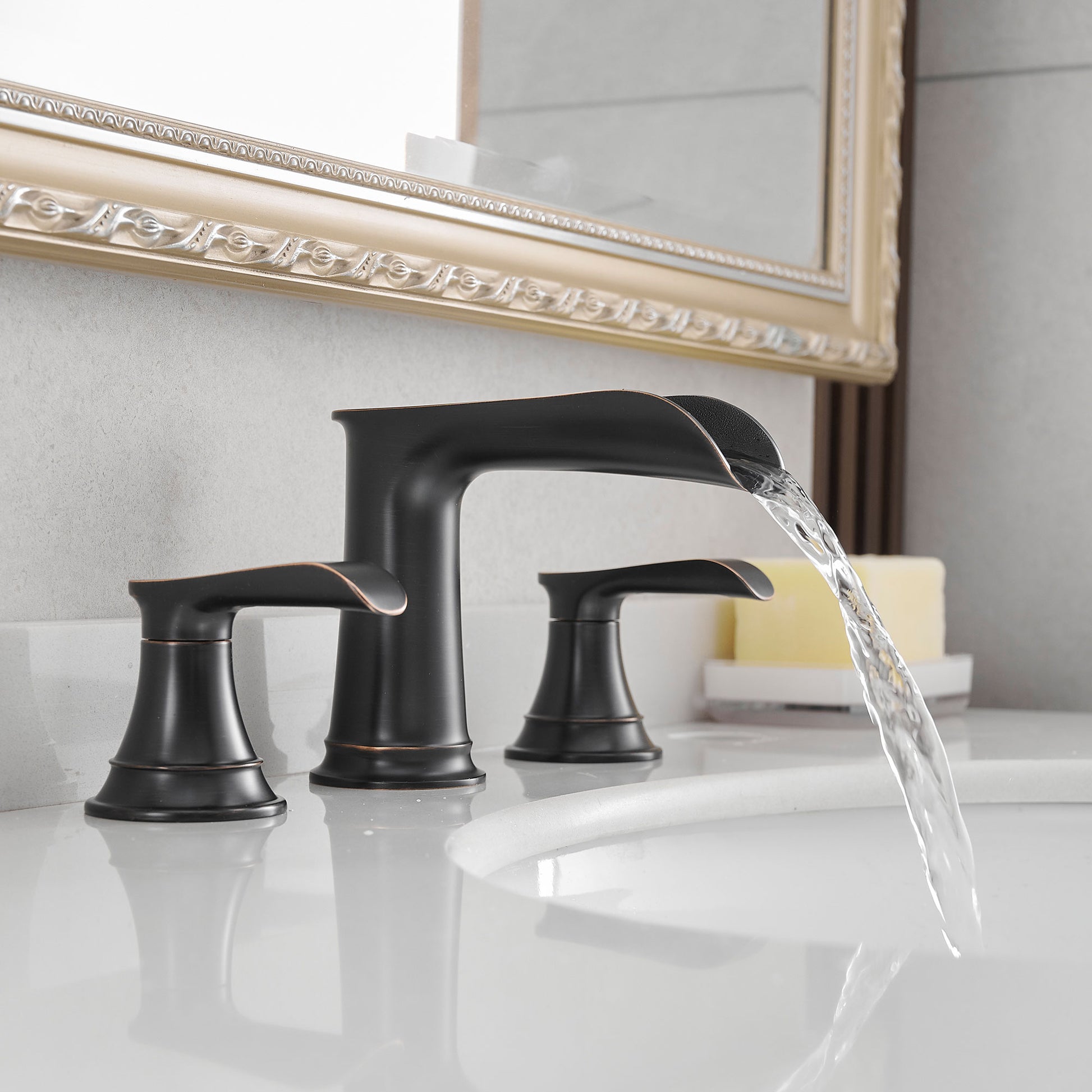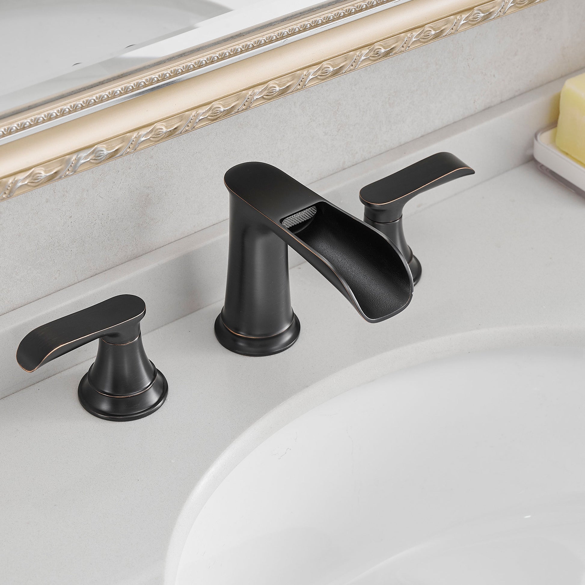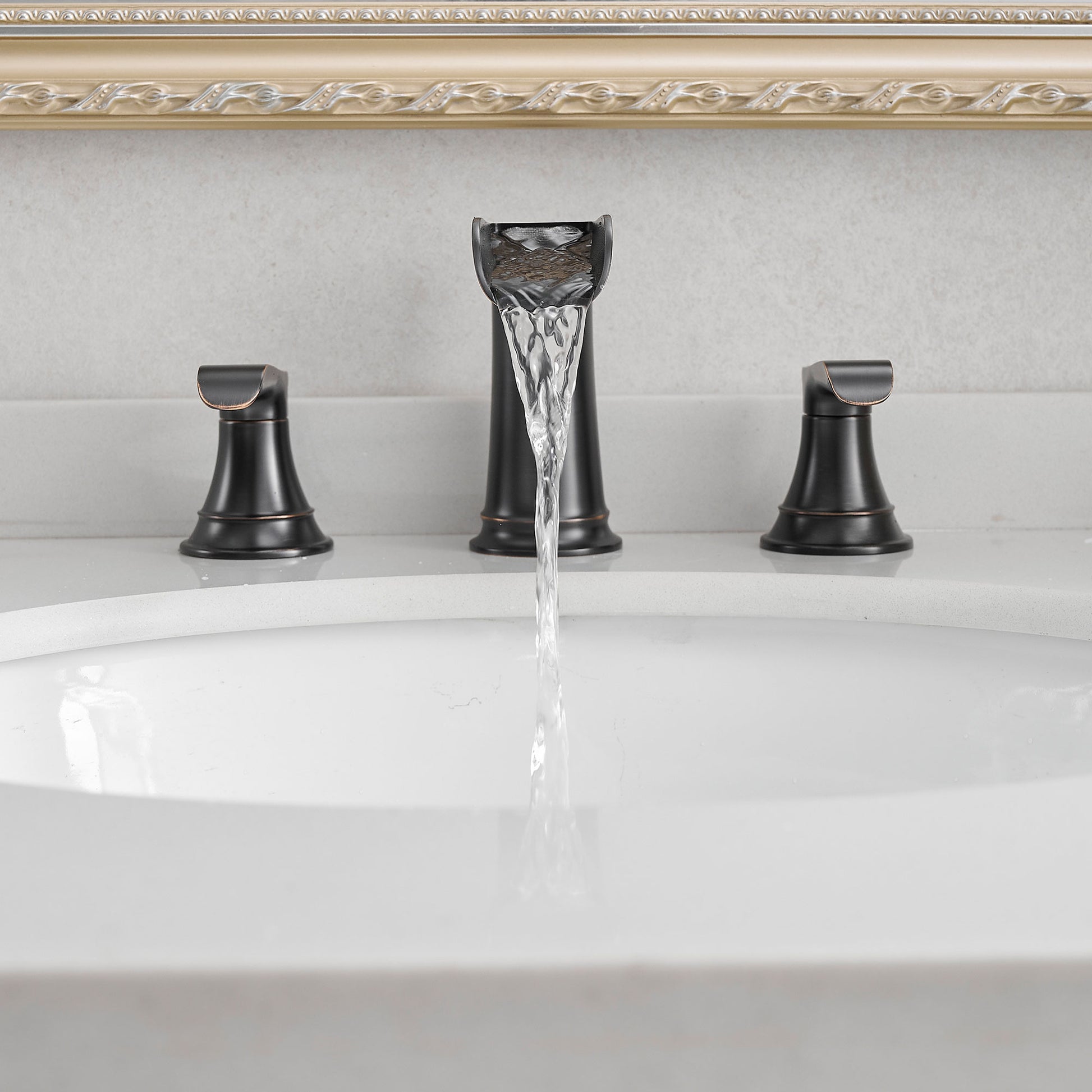 The 8 Inch Widespread Double Handle Brass Bathroom Faucet in Oil Rubbed Bronze features dual handles with clear hot and cold markers for effortless control of water flow and temperature. Equipped with durable ceramic disc cartridges that exceed industry longevity standards, it ensures smooth, leak-free operation for the lifetime of the faucet. Its unique spout design provides full-range washing access with an aerated stream, ideal for brushing teeth, washing hands, or rinsing your face. Advanced plating and high-quality materials make the finish tarnish- and corrosion-resistant, maintaining its vibrant look and long-term durability. A soft-flow bubbler prevents splashing, conserves water, and enhances comfort. Designed for easy DIY installation, it fits 3-hole widespread sinks (5–16 in.) and includes a quick-connect hose for fast, secure setup. After-sales support is available within 24 hours.