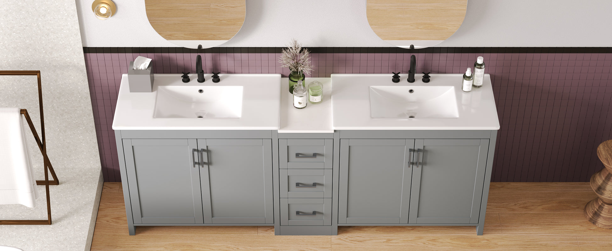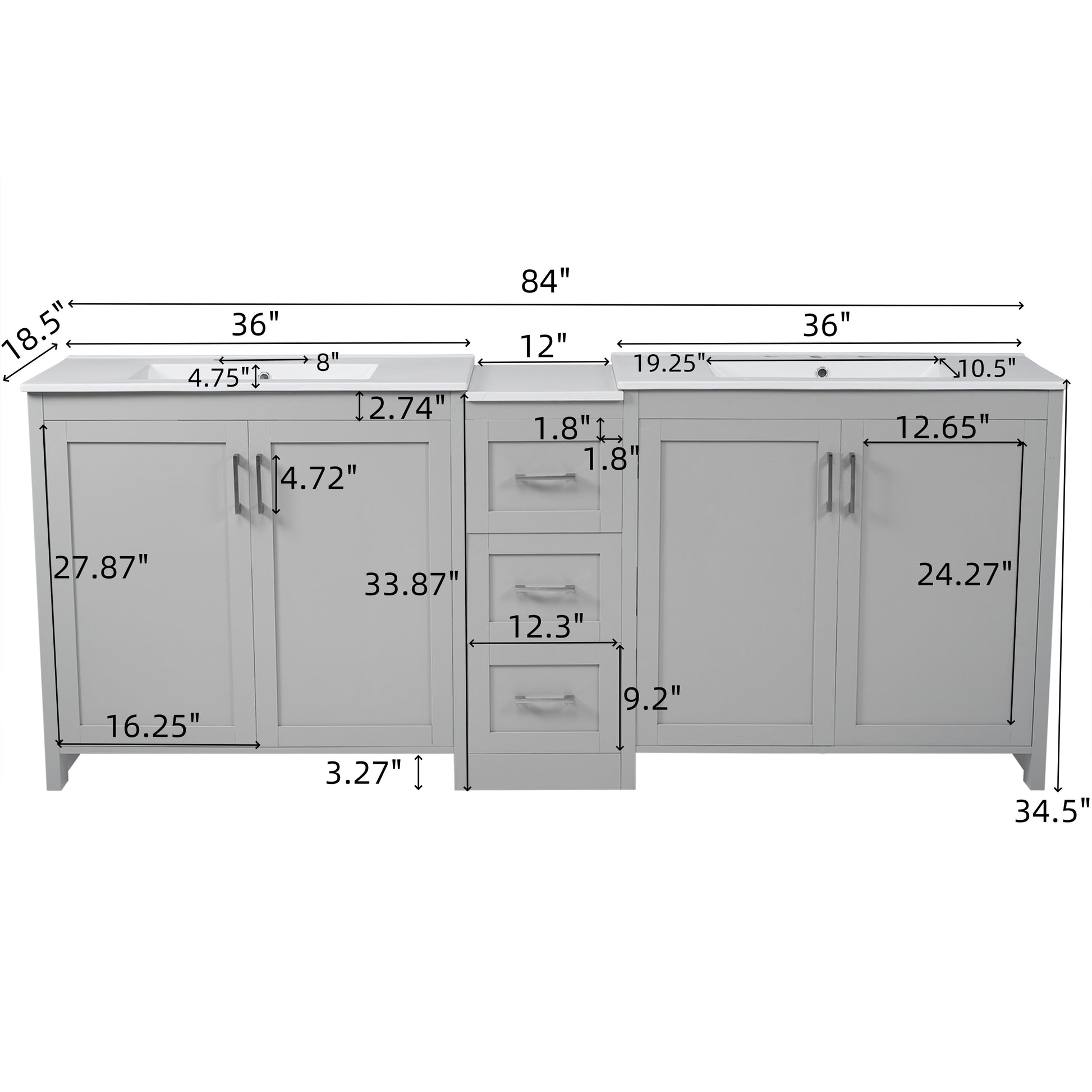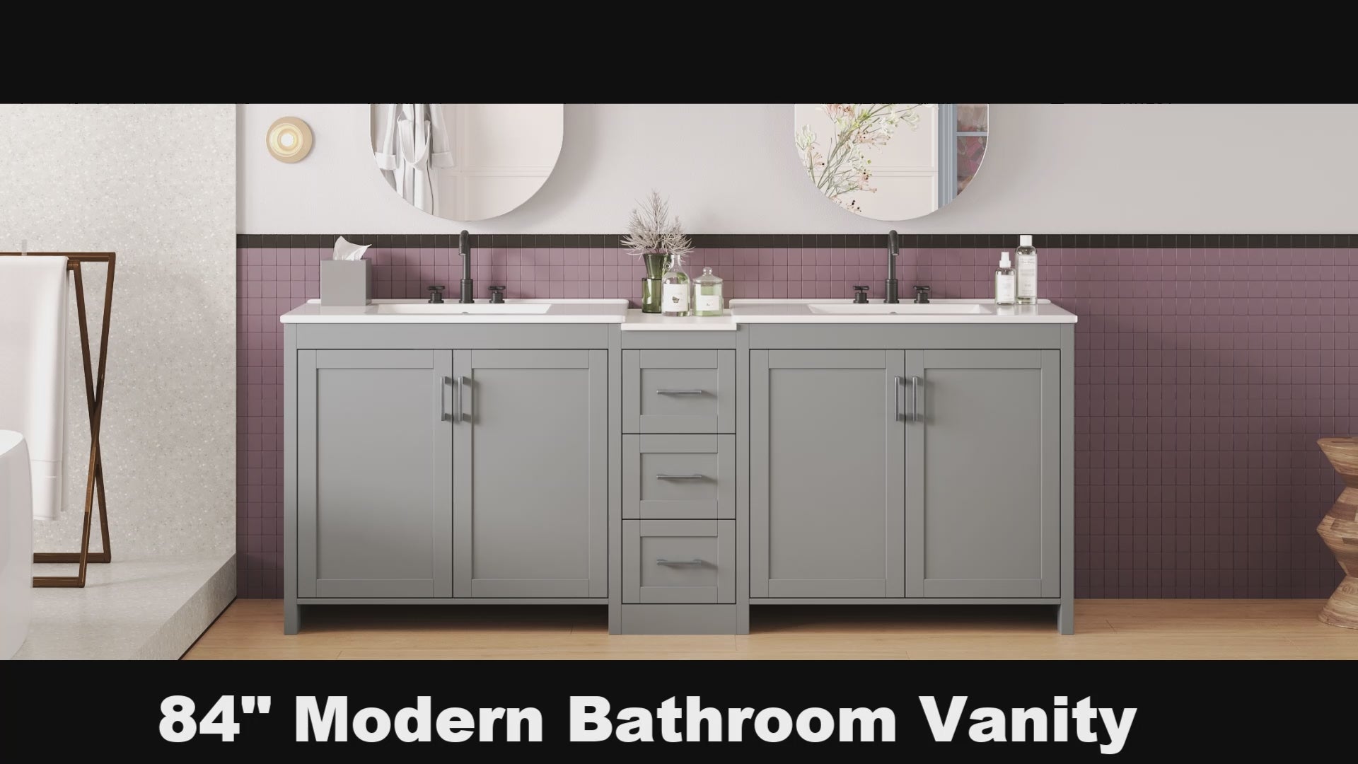 This 84-inch double-sink bathroom vanity combines functionality, durability, and modern style, making it ideal for shared bathrooms. It features two ceramic sinks with a durable quartz countertop that resists scratches, stains, water, and heat, ensuring long-lasting performance and easy cleaning. The vanity is constructed from moisture-resistant MDF for cost-effective sturdiness and comes with three deep drawers, adjustable shelves, and large storage compartments for flexible organization. Soft-close hinges and rounded silver metal handles enhance comfort and usability while reducing noise. With a sleek, versatile design, this vanity suits modern, transitional, or industrial bathrooms. Measuring 84"L × 18.5"W × 34.5"H, with a total weight of 222.11 lbs and a 400 lbs capacity, it ships in three boxes for self-assembly and includes pre-drilled faucet holes, anti-spill design, and spacious 4.75" depth basins for practical daily use.