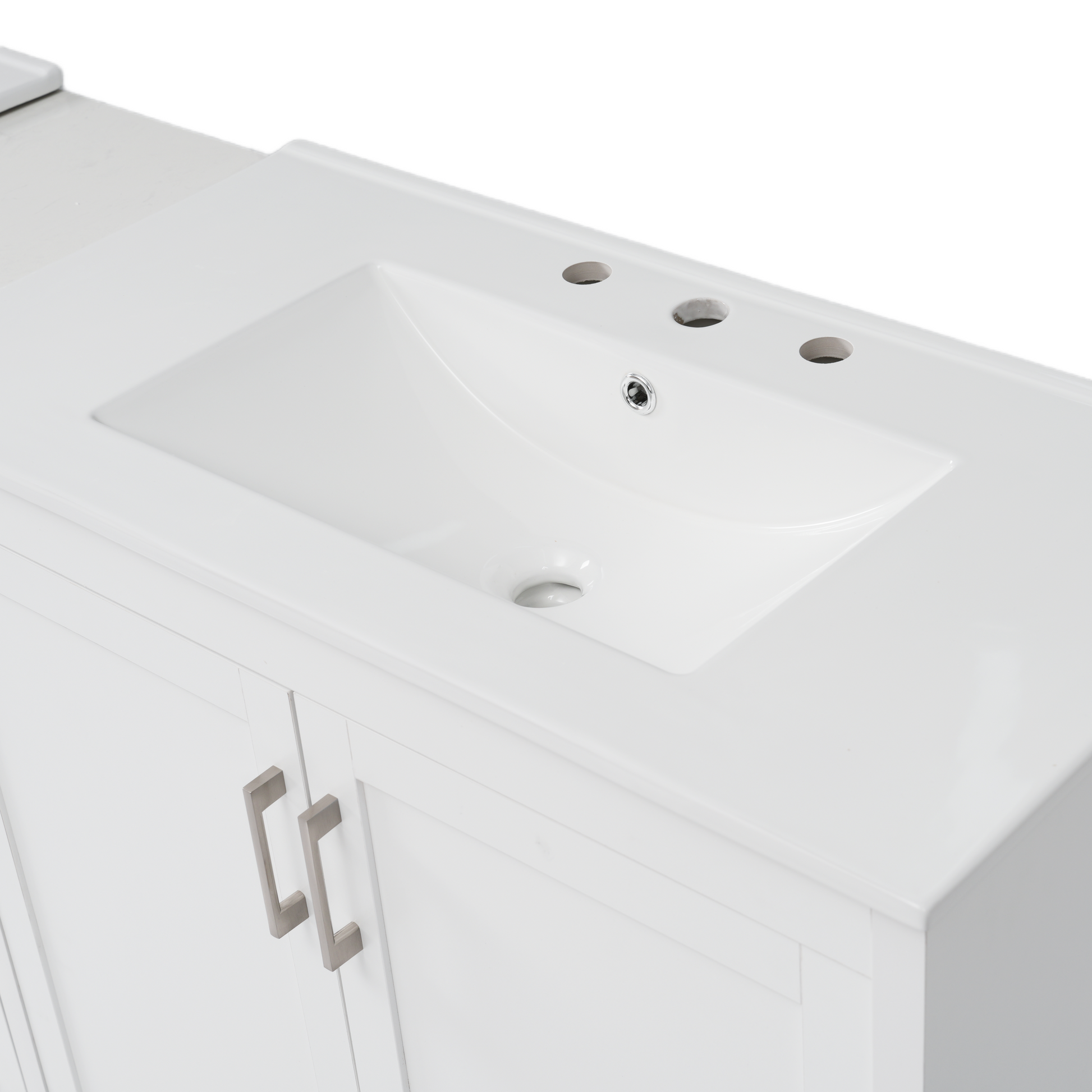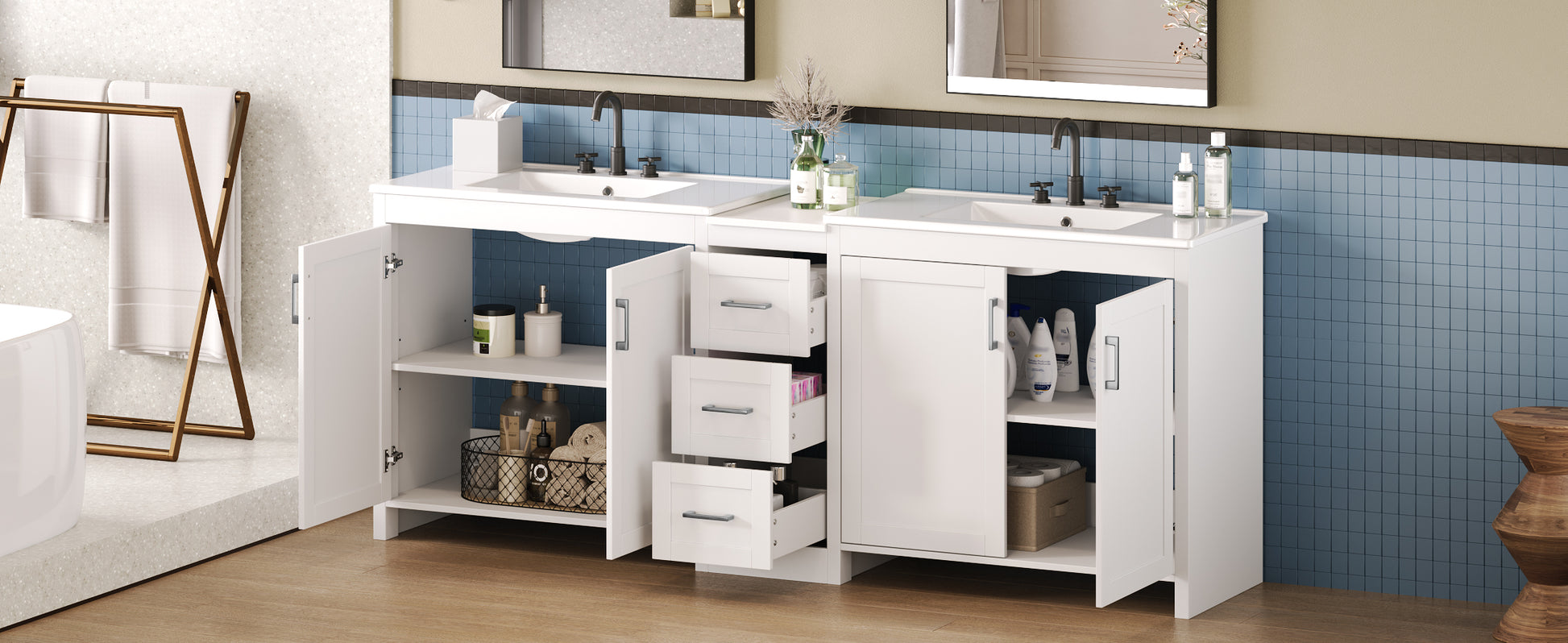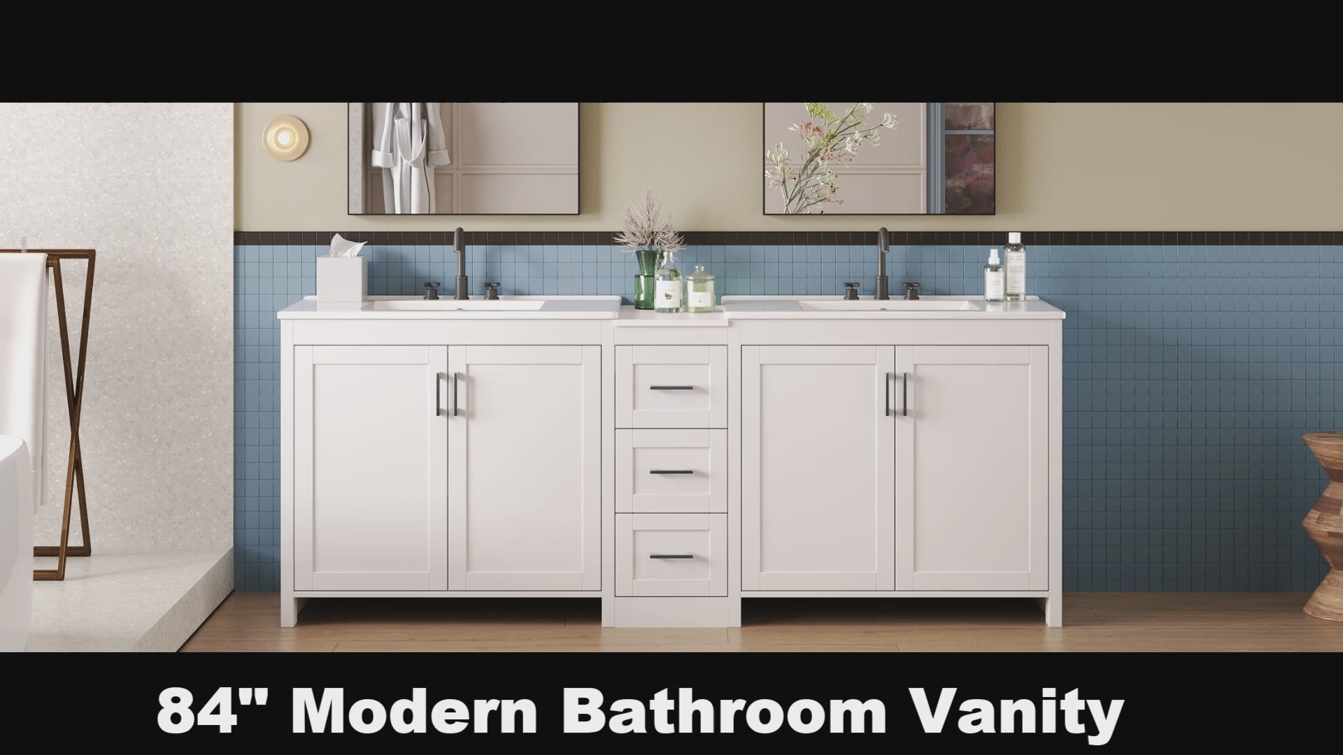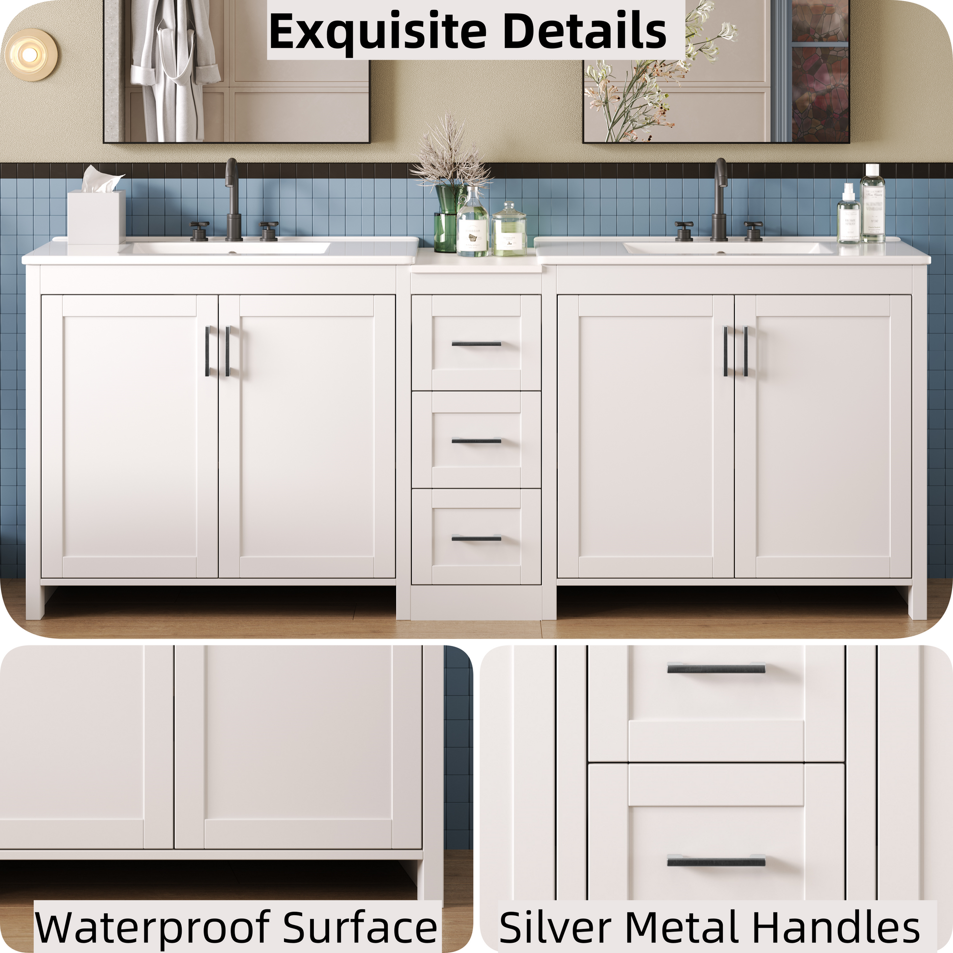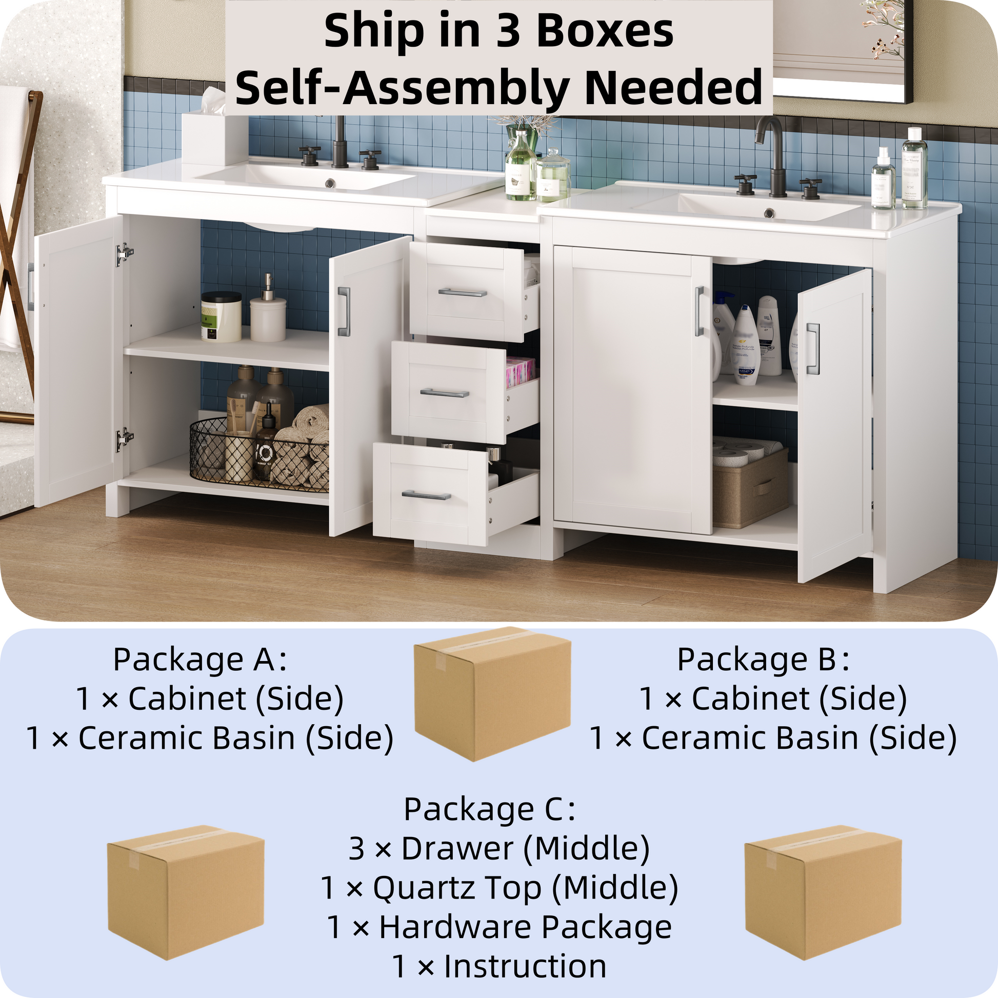 This 84-inch double-sink bathroom vanity features ceramic sinks with a durable quartz countertop, offering a stylish and practical solution for shared bathrooms. Built with moisture-resistant MDF, it combines strength with cost-effectiveness. The vanity includes three deep drawers, adjustable shelves, and large storage compartments to keep toiletries, towels, and essentials neatly organized. Premium details such as soft-close hinges and corrosion-resistant silver handles enhance daily use with quiet and comfortable operation. The glossy quartz surface resists scratches, stains, water, and common bathroom chemicals, ensuring long-lasting durability and easy cleaning. Measuring 84"L × 18.5"W × 34.5"H, with a total weight of 222.11 lbs and a 400 lbs load capacity, this freestanding vanity comes in 3 boxes for self-assembly. It includes pre-drilled faucet holes, anti-spill design, and spacious 4.75" depth sinks, making it both functional and visually appealing for modern or transitional bathrooms.