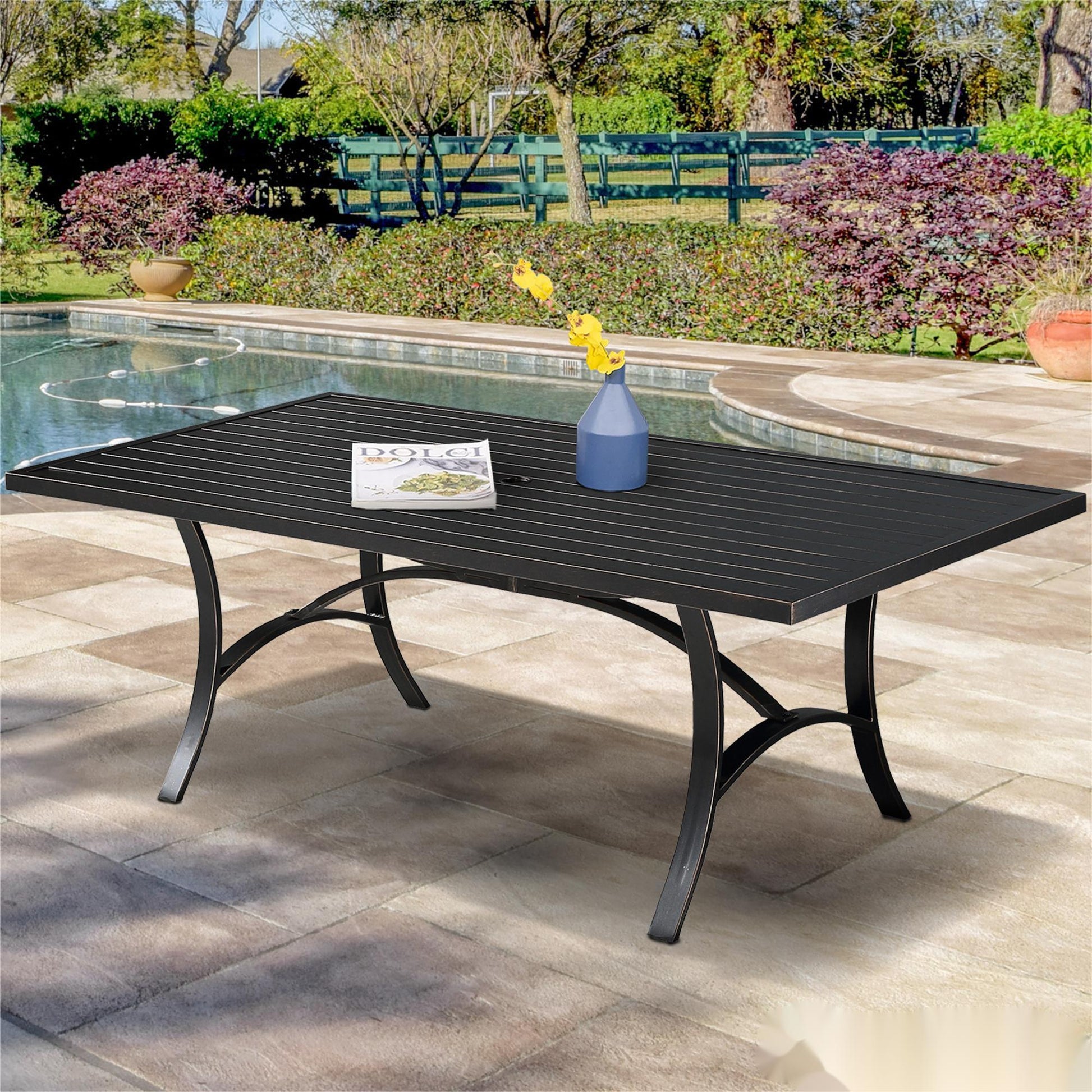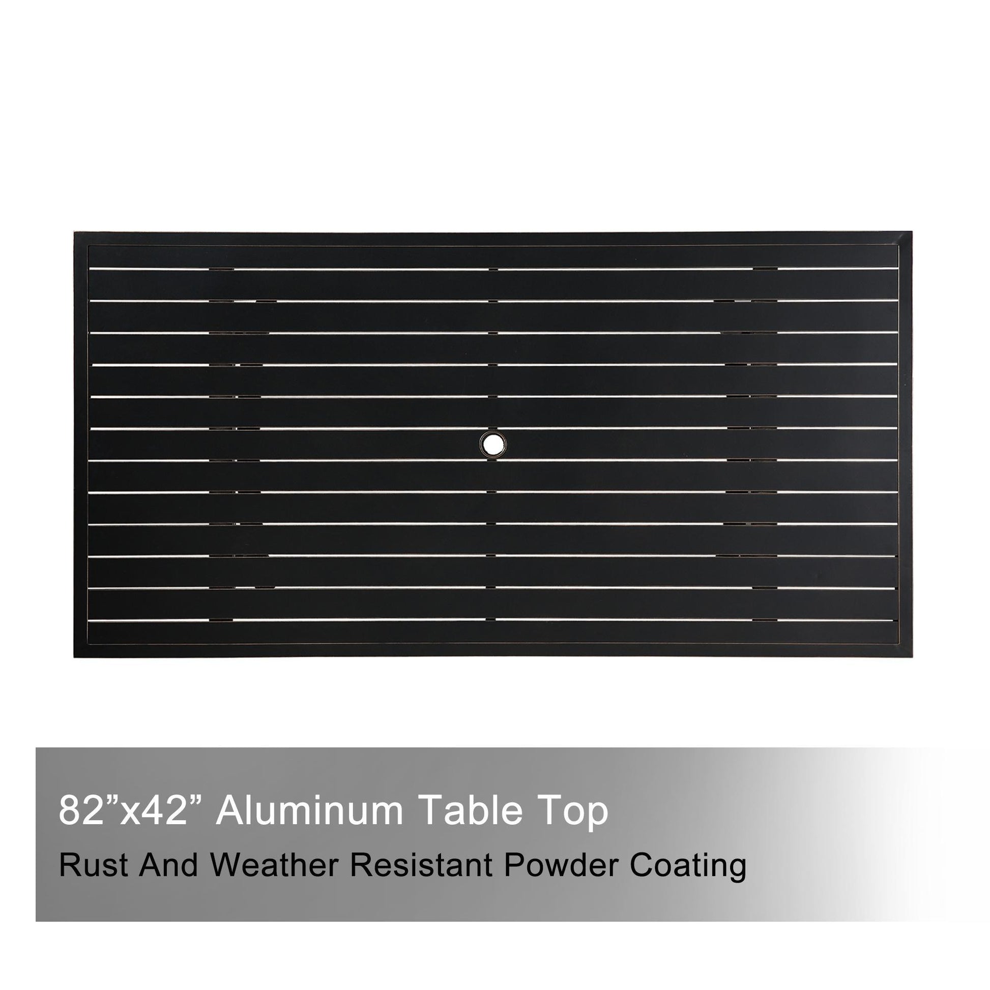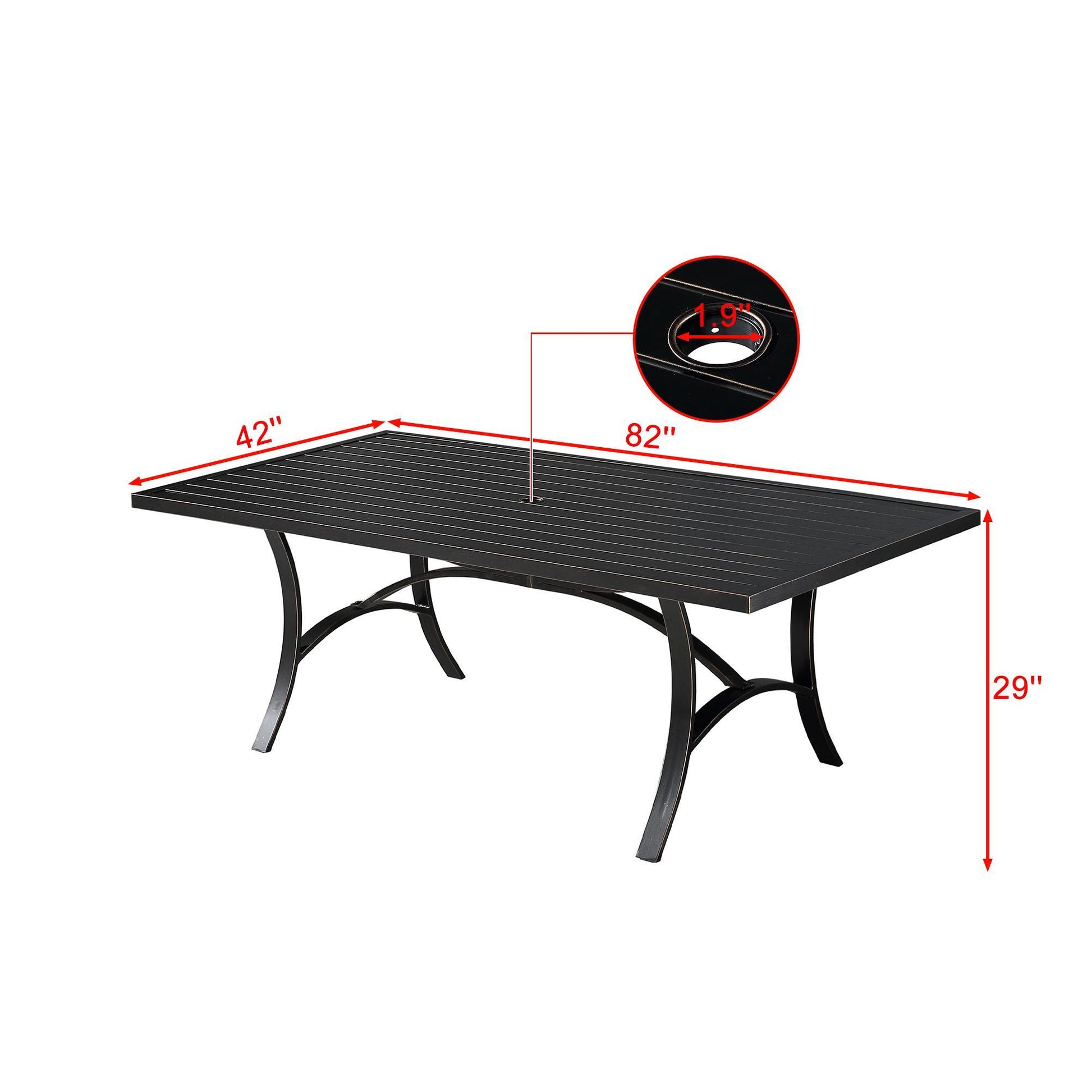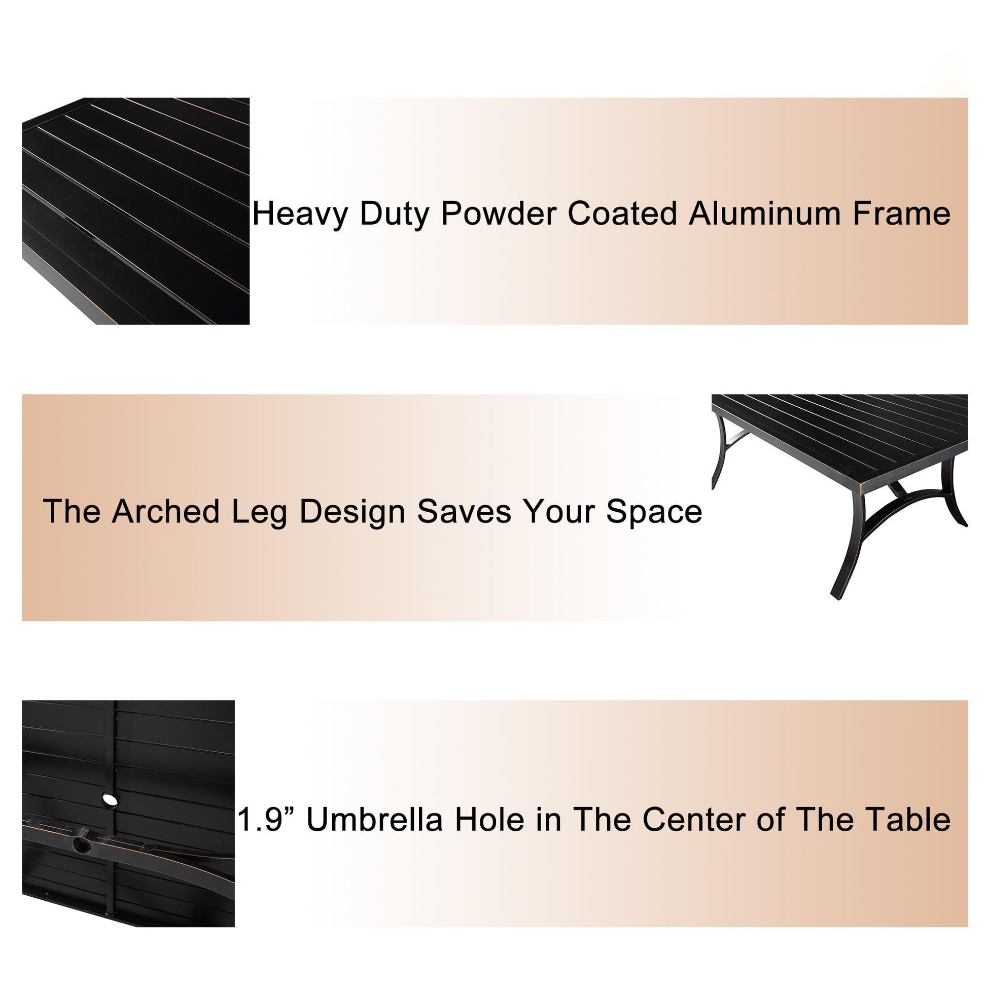 This Aluminum outdoor dining table boasts durable rust-resistant construction ideal for patio and garden use the table top has a 1.9-inch umbrella hole to fit various outdoor umbrellas shielding you from UV rays while enjoying outdoor moments plus it enables simple quick installation to save time and effort and our after-sales team provides professional support if any installation issues occur