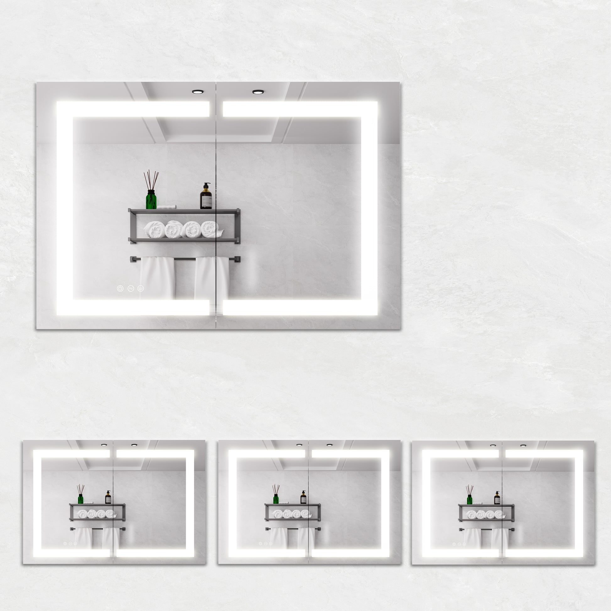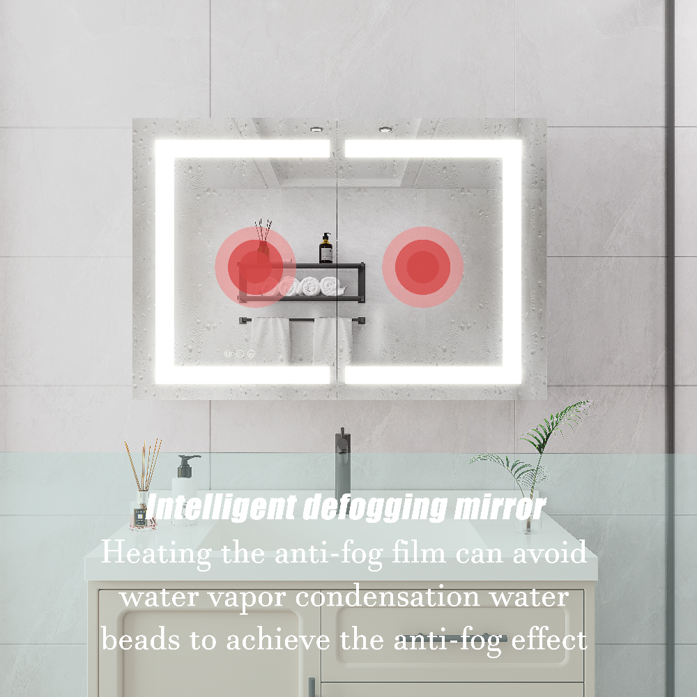 This bathroom mirror cabinet features double doors with double sided mirror design and a frosted mirror edge adding elegance and practicality to any modern bathroom. It is equipped with three smart touch switches that separately control the main light the anti fog function and the adjustment of brightness and color temperature. The brightness and color temperature can be freely adjusted between 3000K and 6000K with CRI greater than 90 and both settings have a memory function to restore the previous use. The anti fog function is activated with a defogging button which heats the mirror surface and automatically shuts down after 30 minutes keeping the mirror clear. Made of high grade aluminum alloy with two layers of 8mm thick glass the cabinet is waterproof rustproof and dustproof ensuring durability and safety. It operates on AC110 to 120V with UL drive and meets ETL certification providing reliable performance.