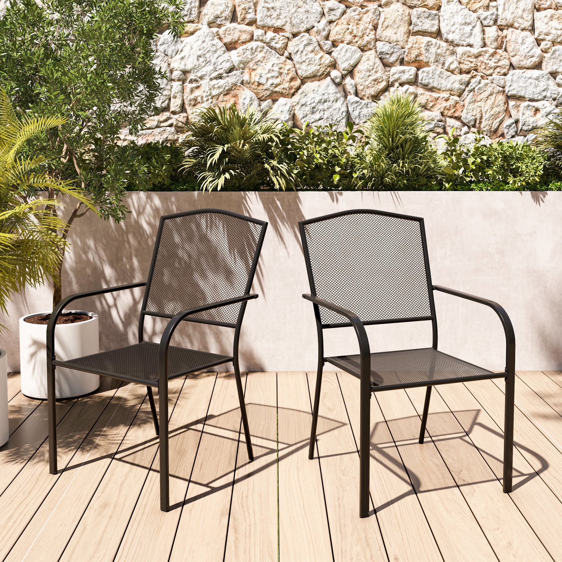 Introducing our sturdy, breathable Metal Patio Outdoor Dining Chair 2-Piece Set. Experience ultimate comfort and durability in your outdoor seating with this high quality chair set. Not only is this chair set perfect for outdoor spaces such as gardens, patios, decks, balconies, and poolside areas, but it also complements indoor environments with its simple, eco-friendly design.