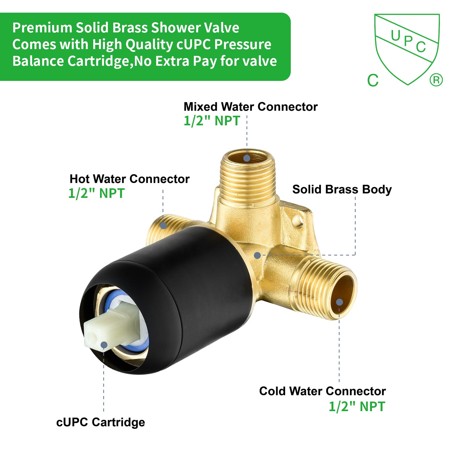 Safe showering with this black shower mixer pressure balance valve dual handle 500k cycle tested SUS304 rustproof 3-layer coating.