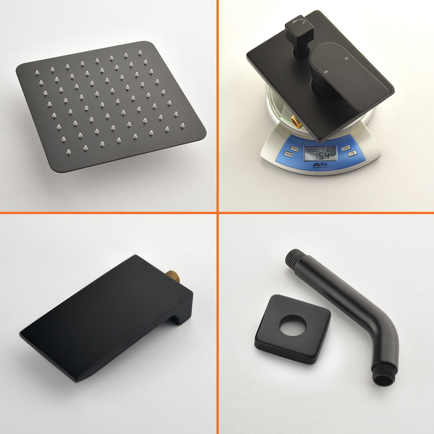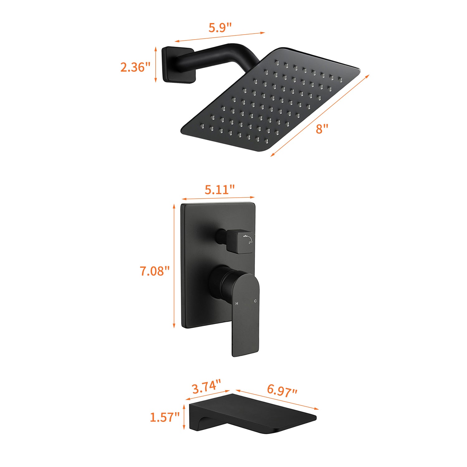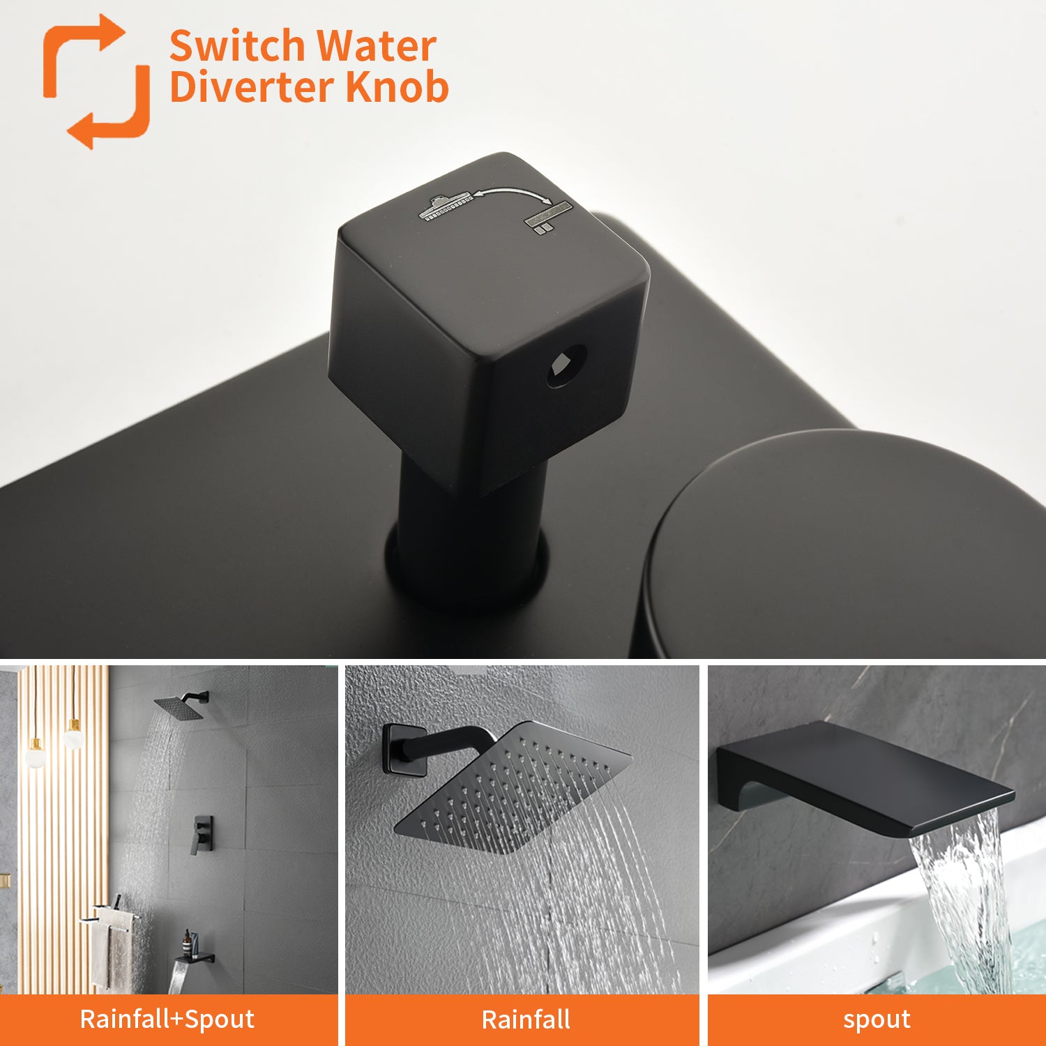 Black Shower Set 2-Function Brass Pressure Balance Valve cUPC 8 Inch SUS304 Top Spray Waterfall Spout Dual Water Outlet