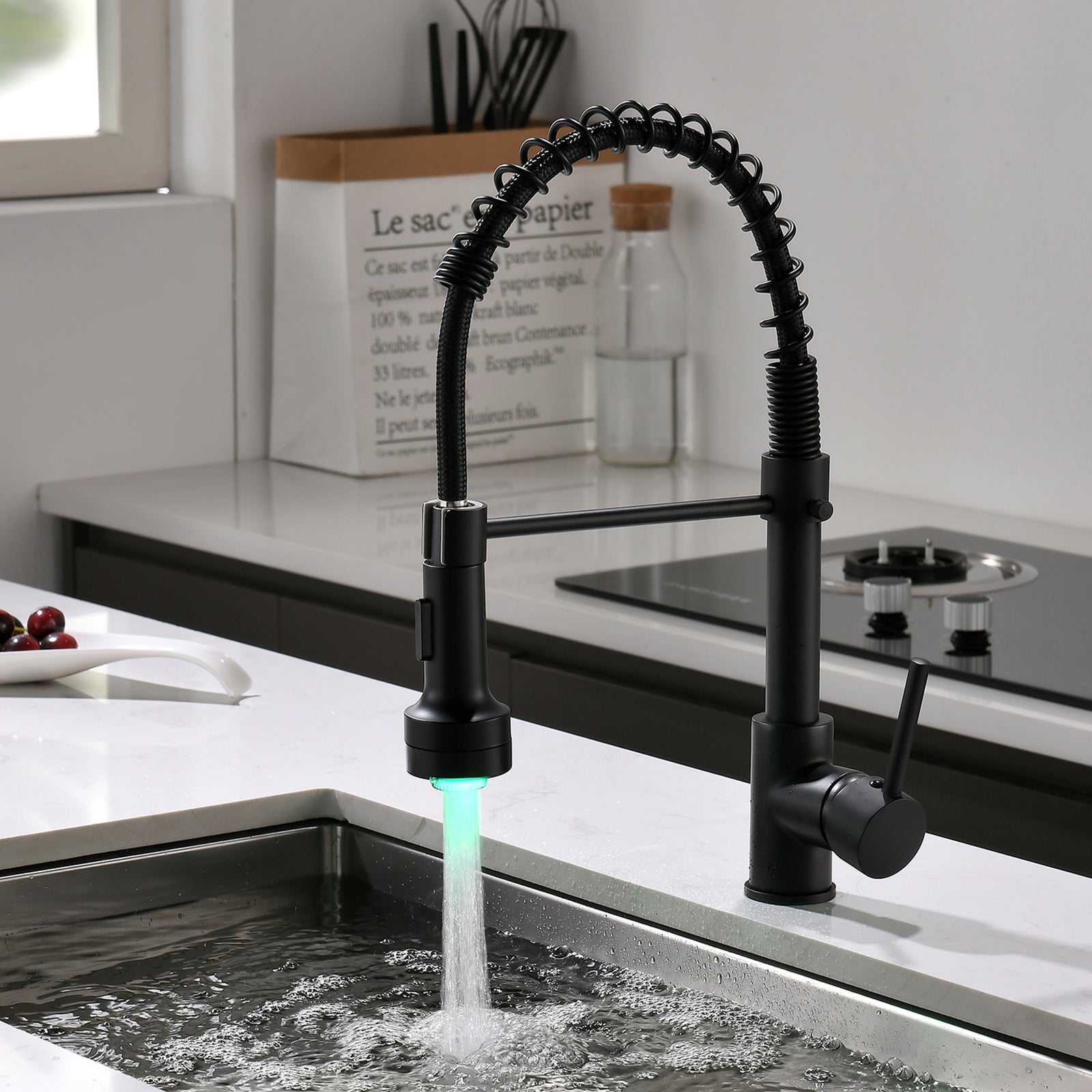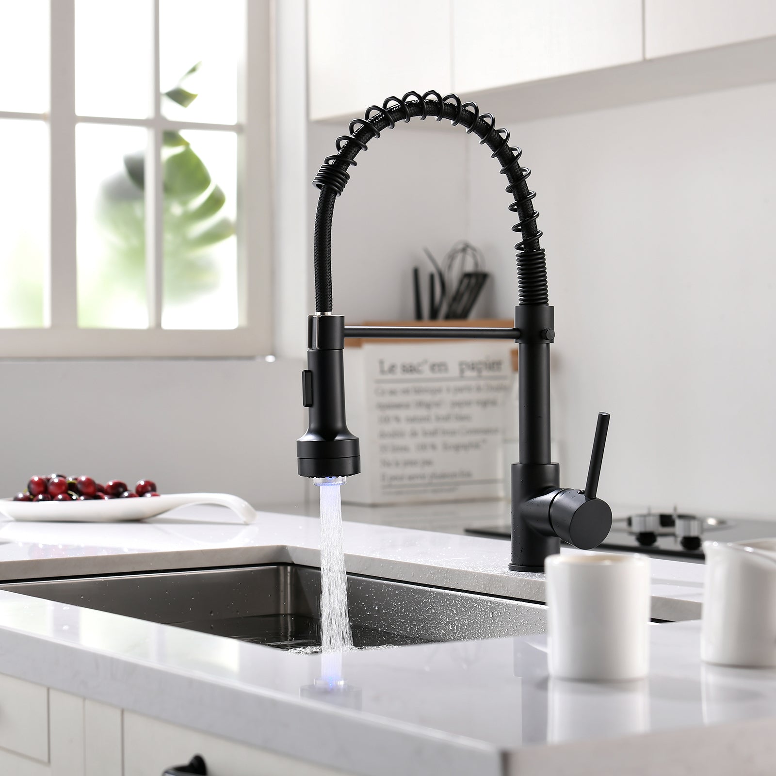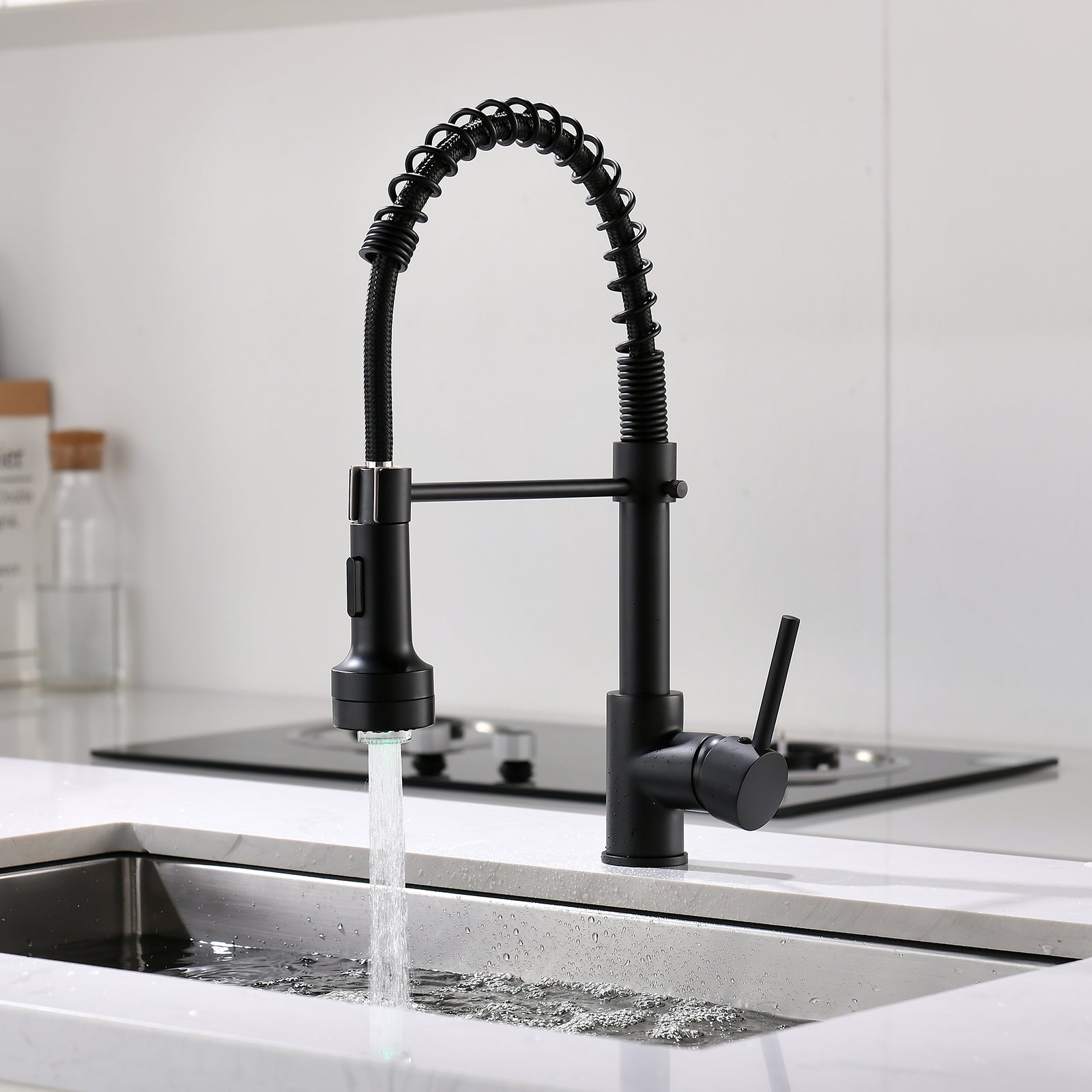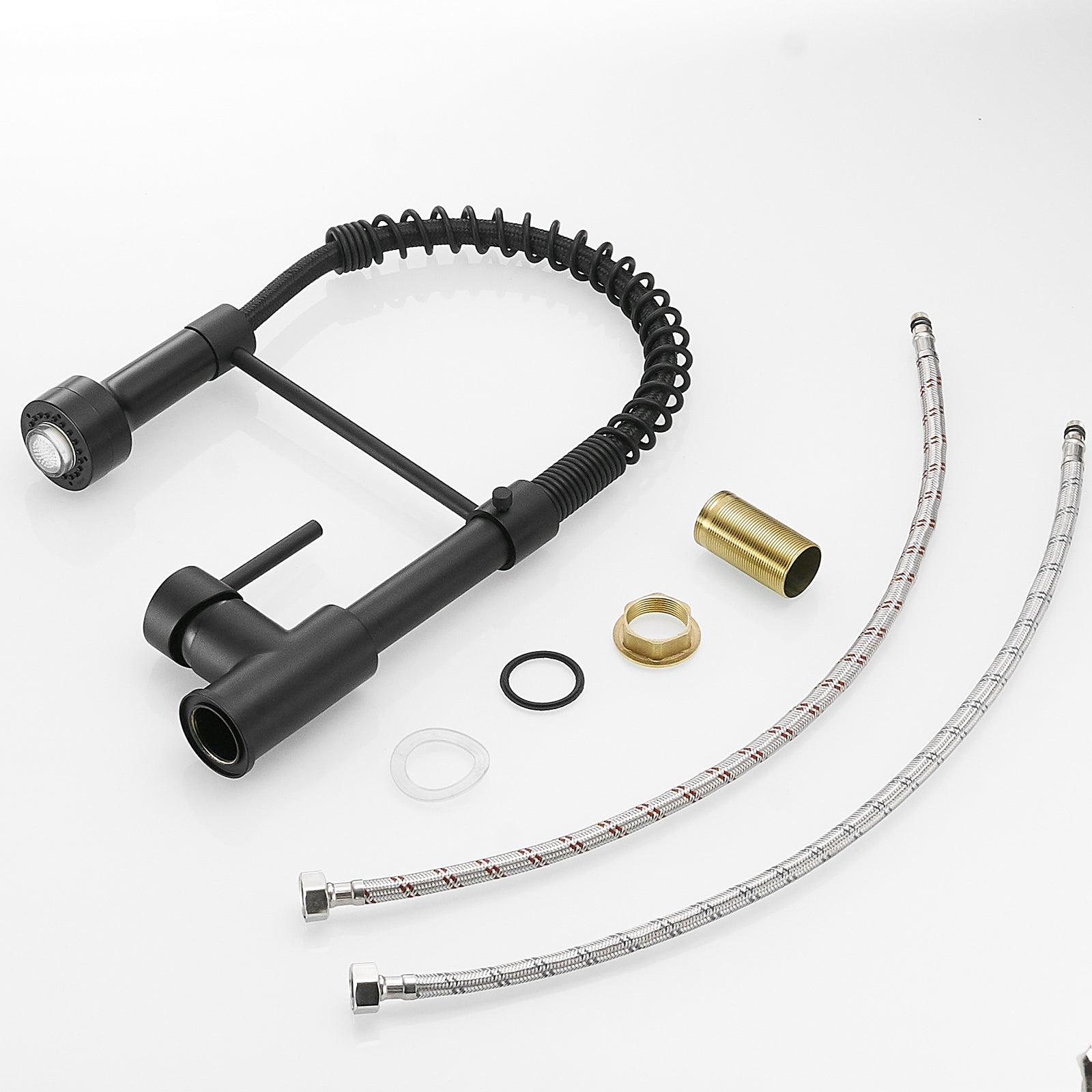 The Stainless Steel Black Single-Handle Pull-Down Sprayer Kitchen Faucet features a lead-free construction with a superior rust-resistant finish, a single lever design for effortless water flow control, and a preinstalled pull-down hose and water line to save time during installation. Its premium corrosion- and tarnish-resistant finish ensures long-lasting durability, it requires no plumber for installation and can be completed as a DIY project in less than 35 minutes, and the faucet has passed rigorous salt spray testing for quality assurance.