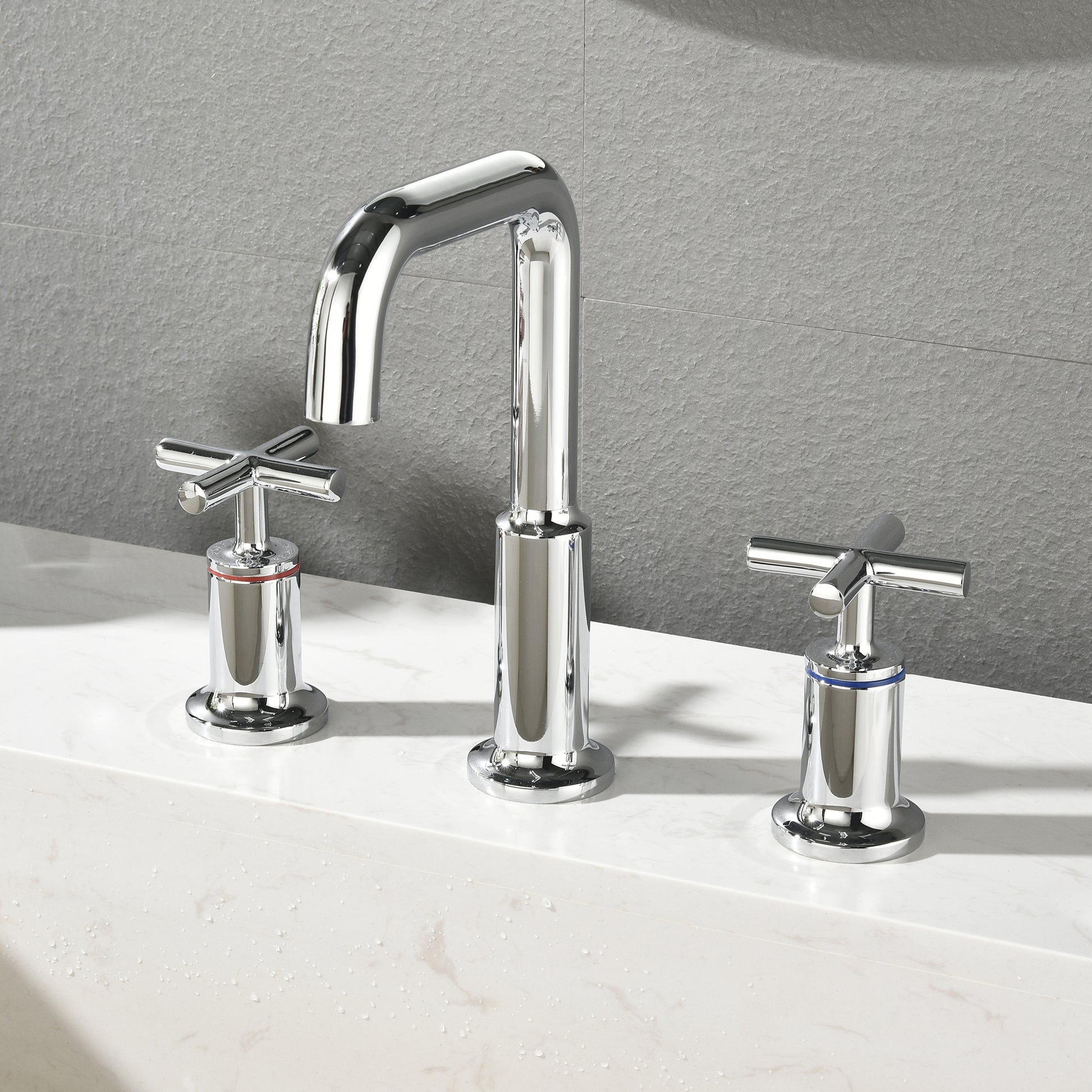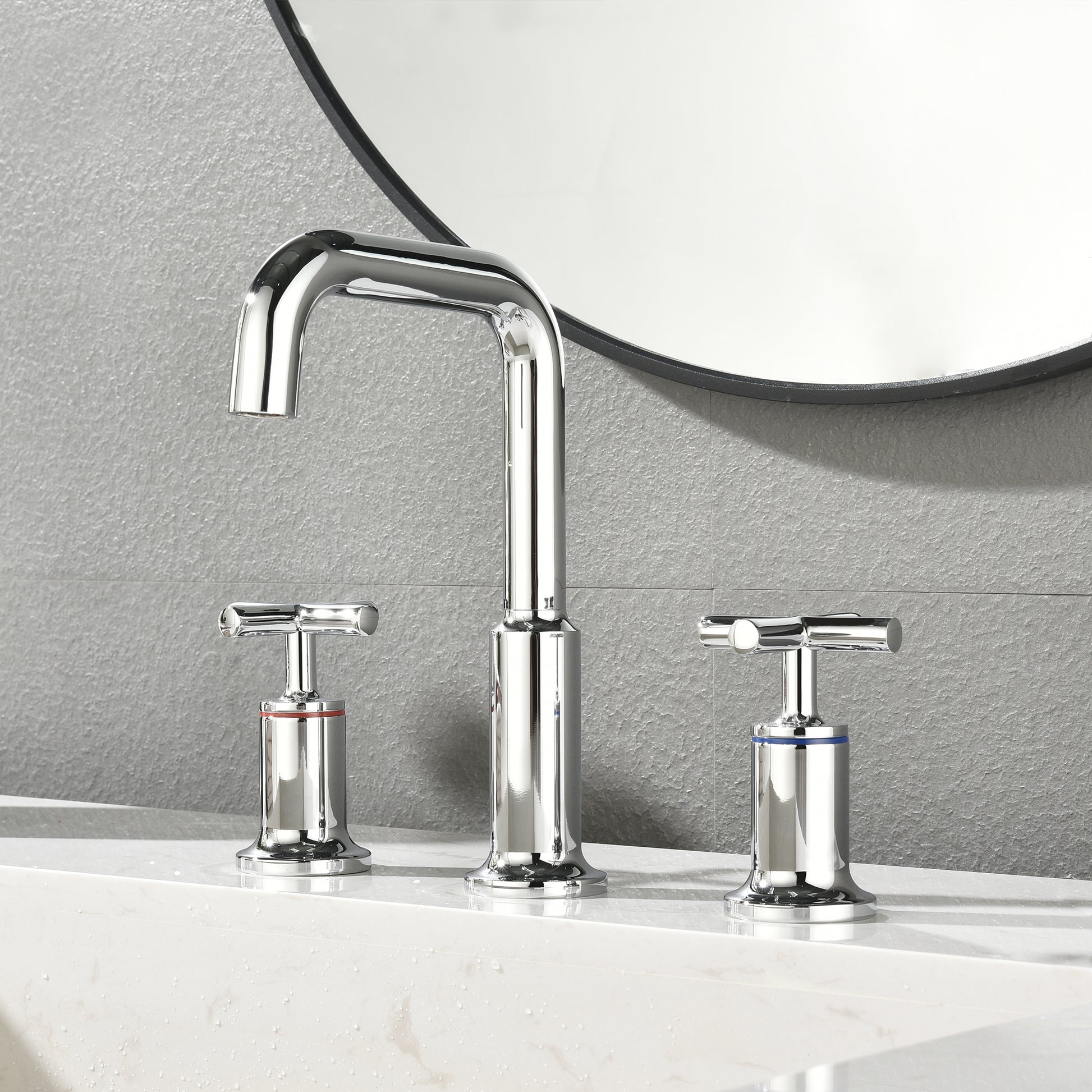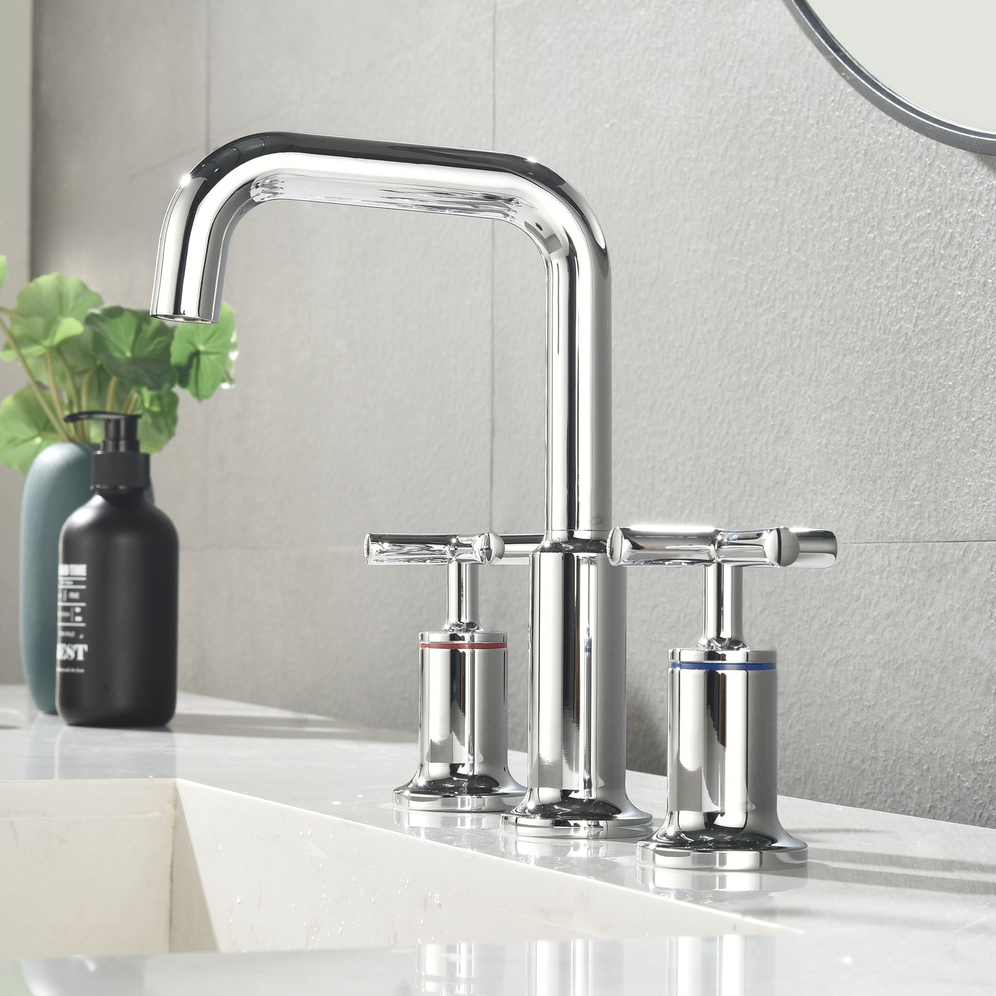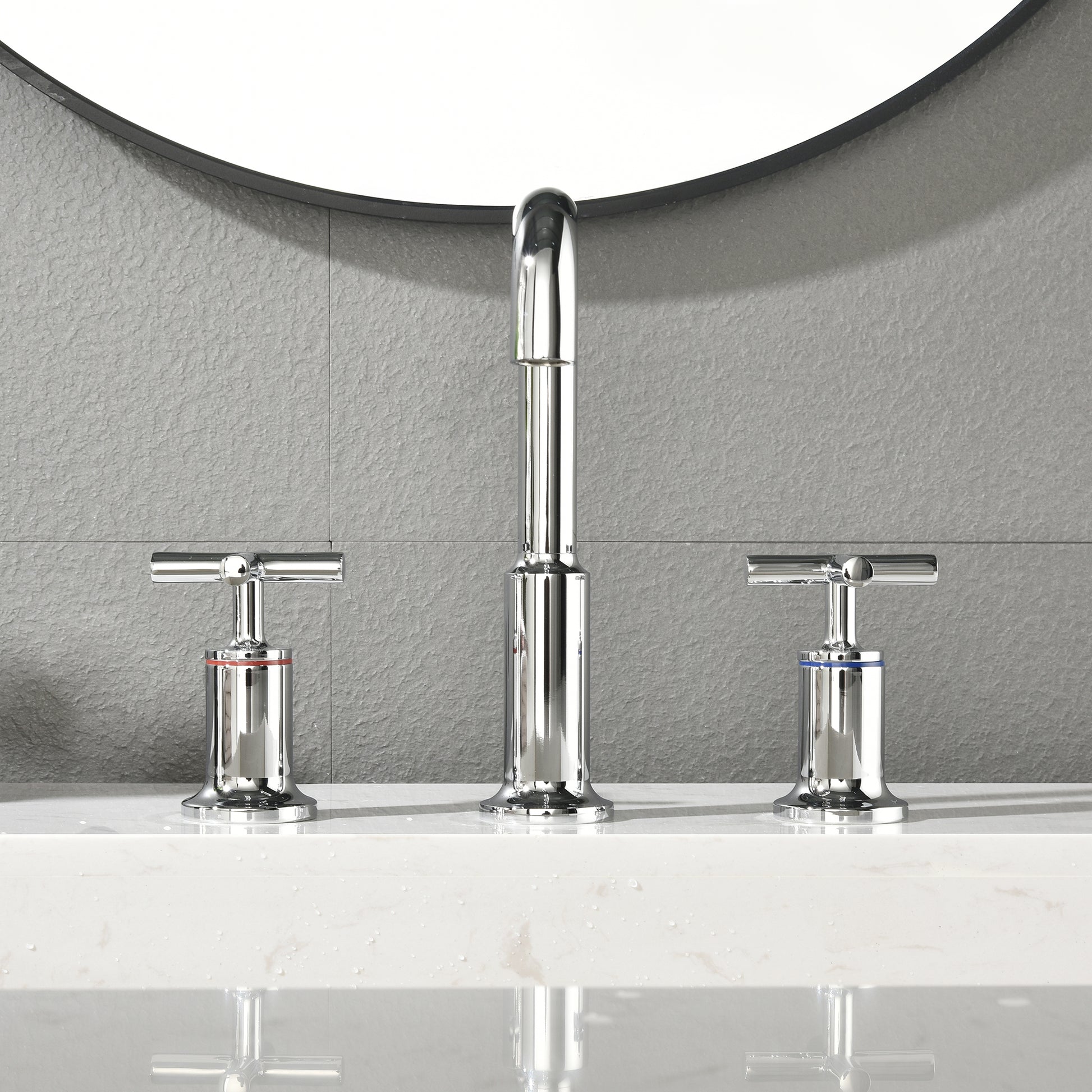 Crafted from high-purity solid brass, this 1.8 GPM 8 in. widespread bathroom faucet features a built-in ceramic cartridge for superior durability, rust resistance, and leak-free performance. The 360° swivel spout provides full sink coverage, while the ergonomic double-handle design allows precise control of water flow and temperature. Equipped with a high-performance ceramic cartridge tested for 500,000 cycles, it ensures long-lasting use. The chrome finish, treated with advanced electroplating, resists scratches, fingerprints, and tarnish, maintaining a sleek modern look. Designed for standard 3-hole sinks, it includes hot and cold water supply hoses with quick-connect fittings for hassle-free DIY installation in just 20 minutes.