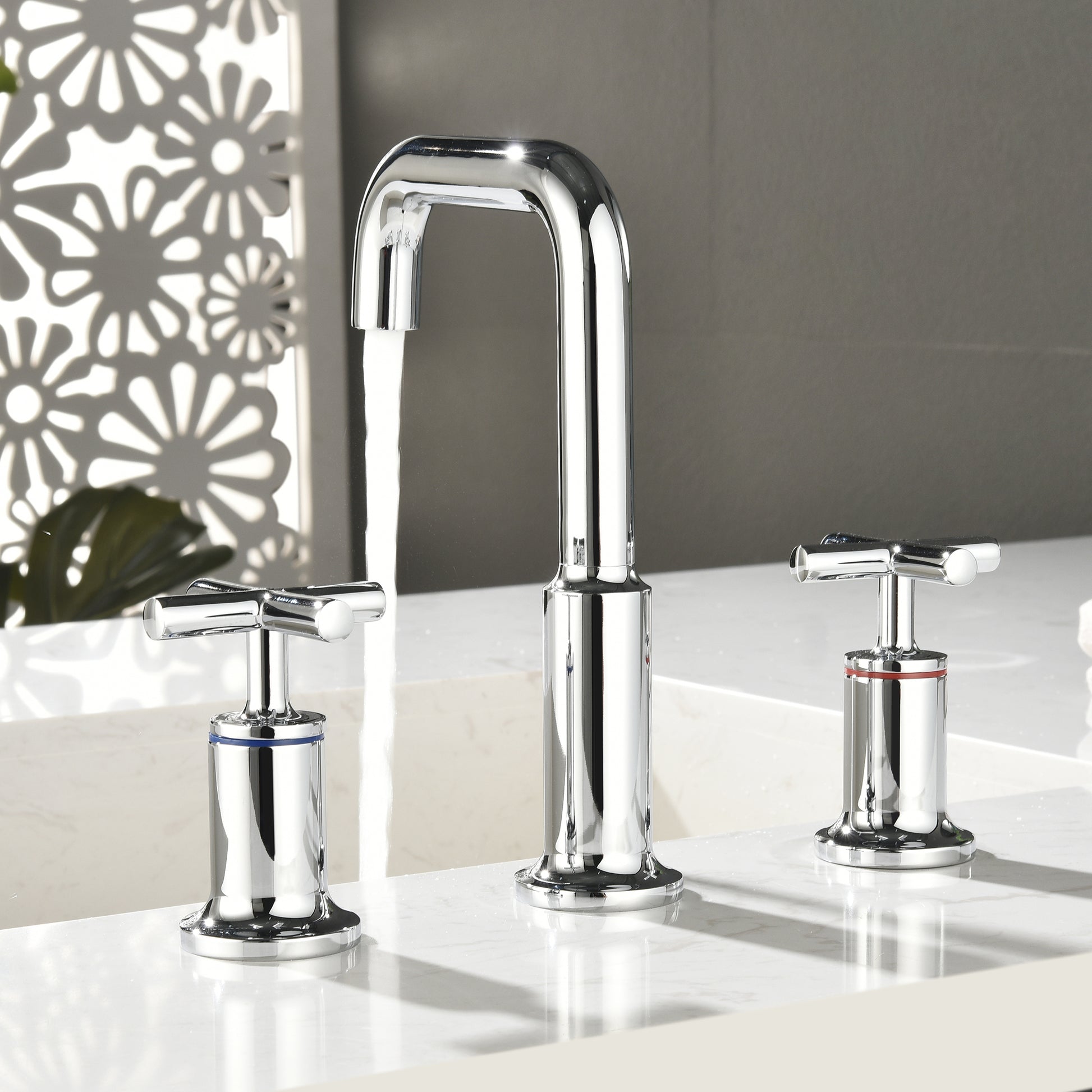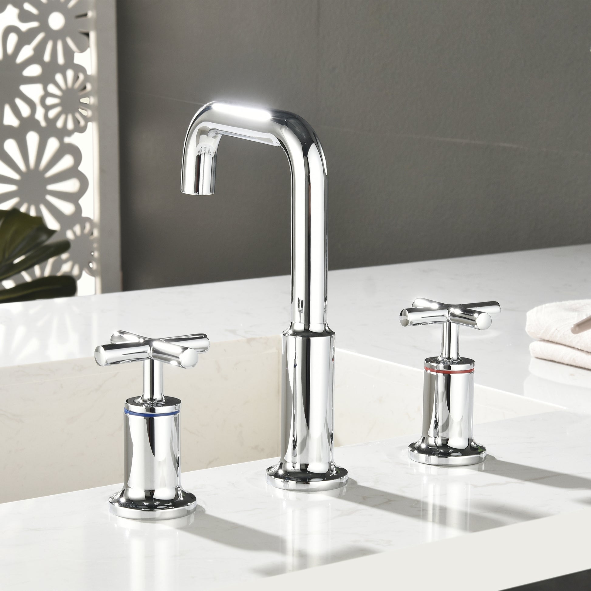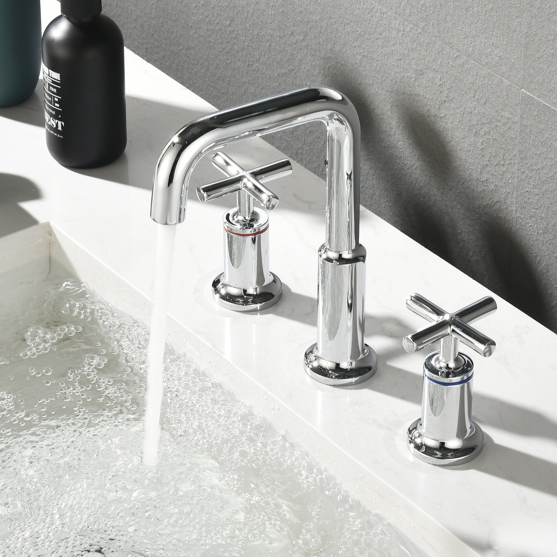 Crafted from high-purity solid brass, this 1.8 GPM 8 in. widespread bathroom faucet features a built-in ceramic cartridge for superior durability, rust resistance, and leak-free performance. The 360° swivel spout provides full sink coverage, while the ergonomic double-handle design allows precise control of water flow and temperature. Equipped with a high-performance ceramic cartridge tested for 500,000 cycles, it ensures long-lasting use. The chrome finish, treated with advanced electroplating, resists scratches, fingerprints, and tarnish, maintaining a sleek modern look. Designed for standard 3-hole sinks, it includes hot and cold water supply hoses with quick-connect fittings for hassle-free DIY installation in just 20 minutes.