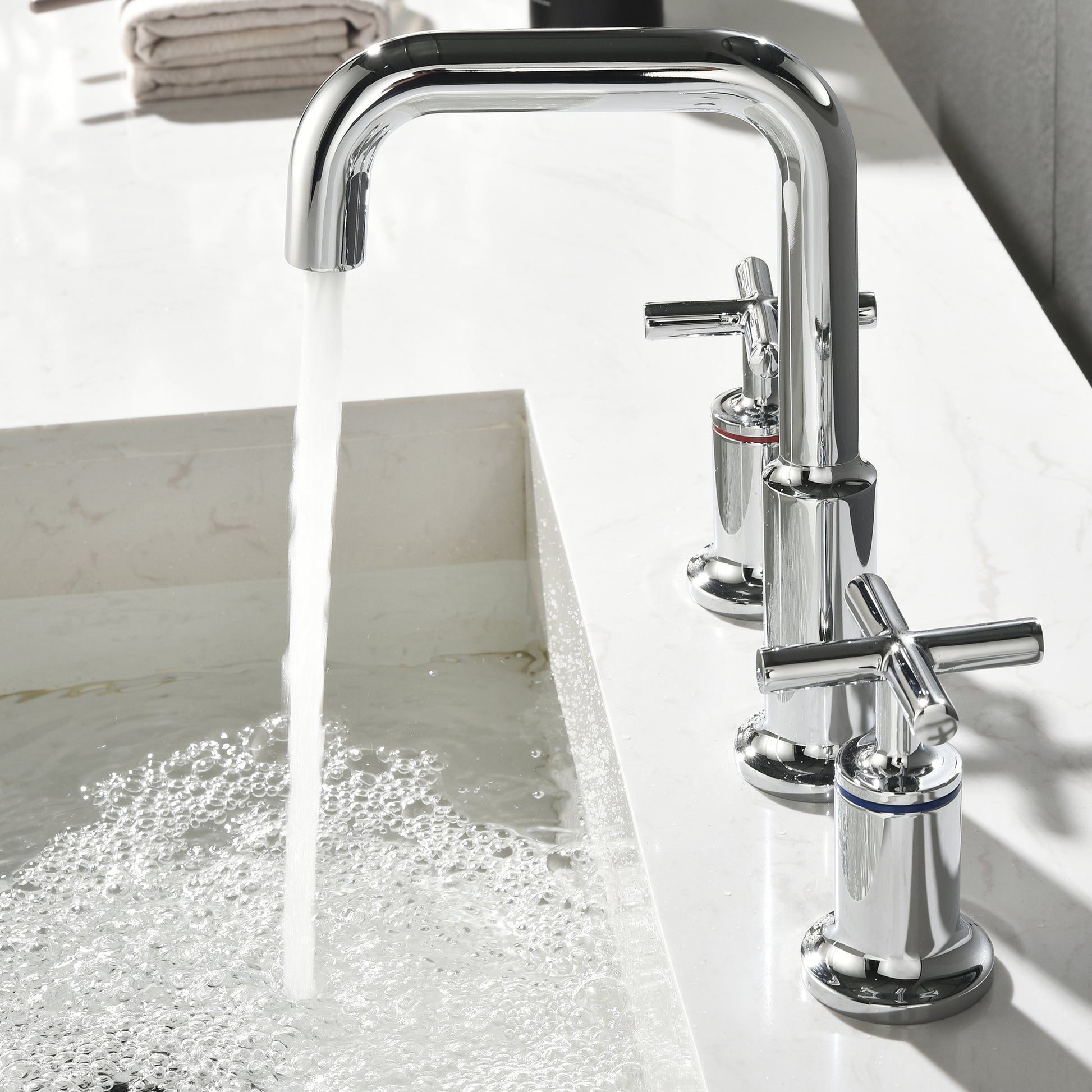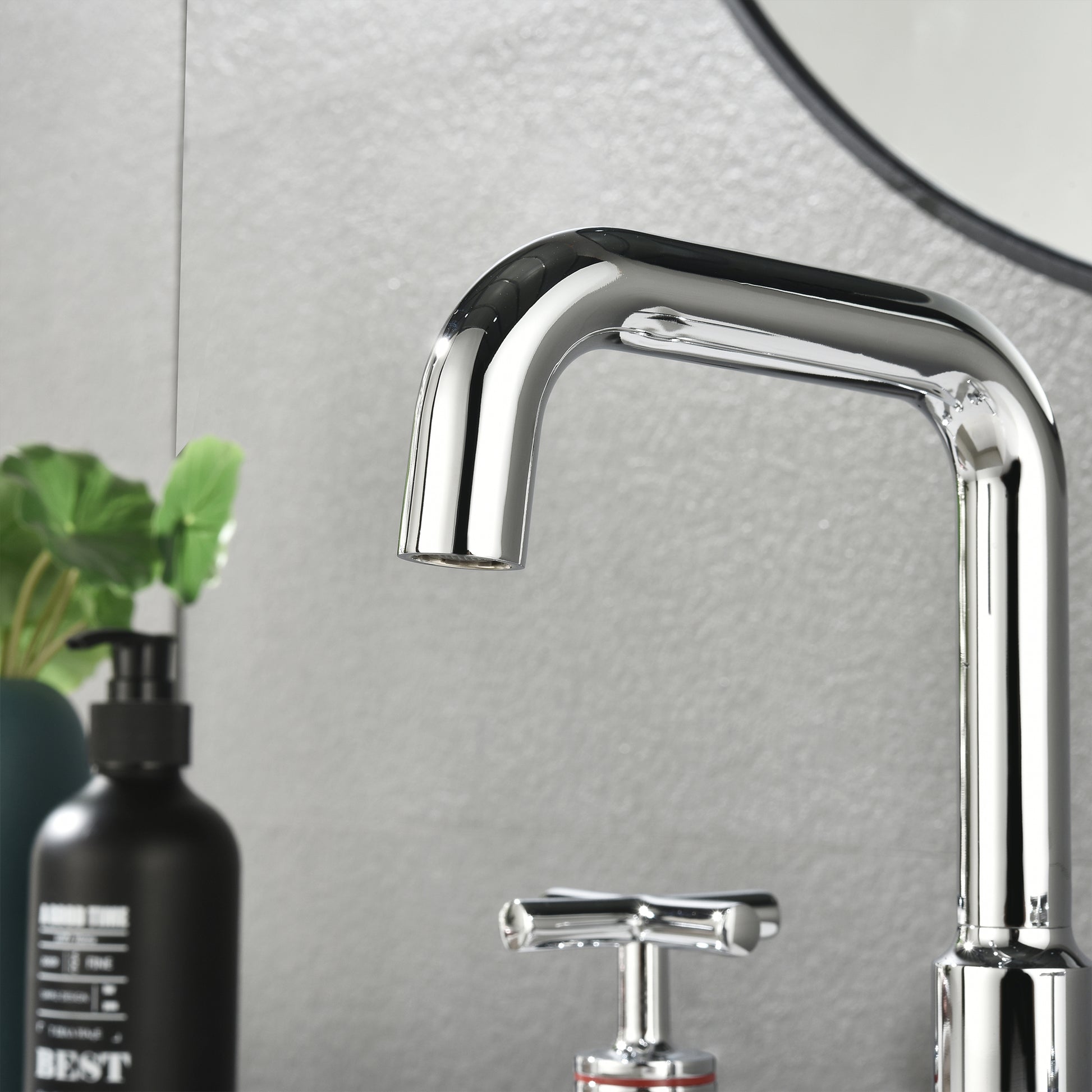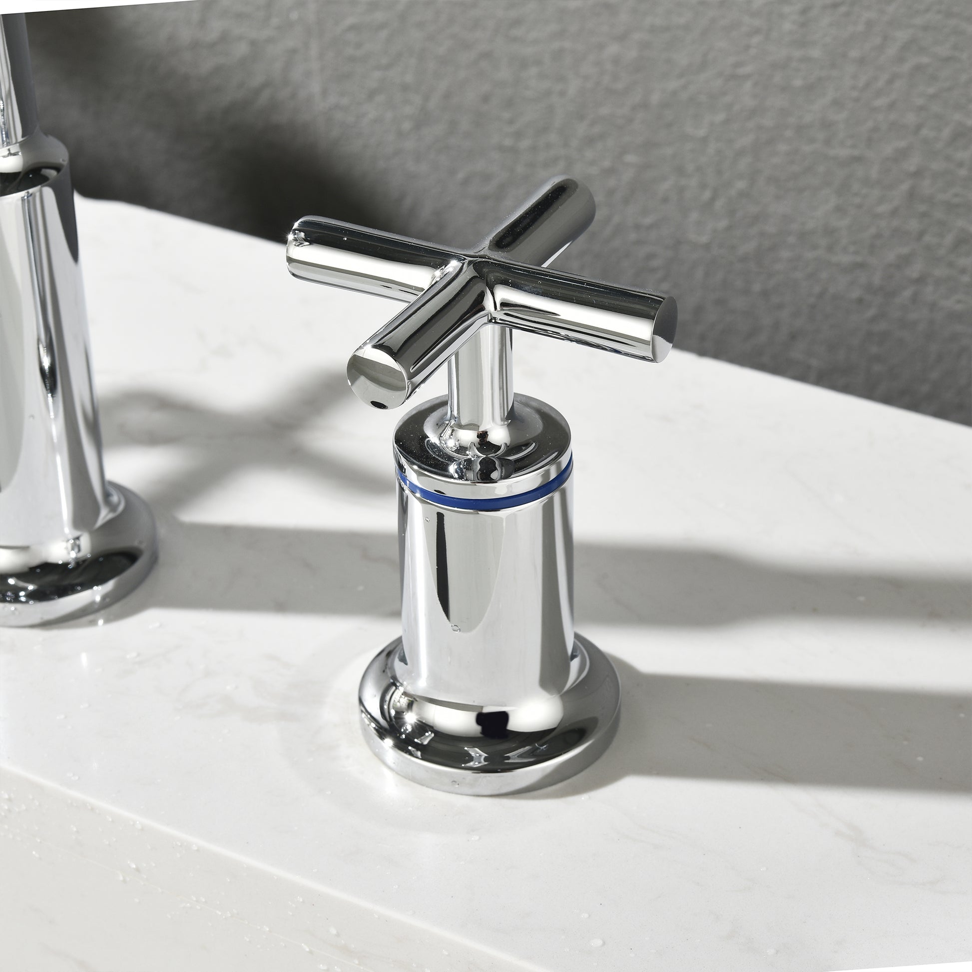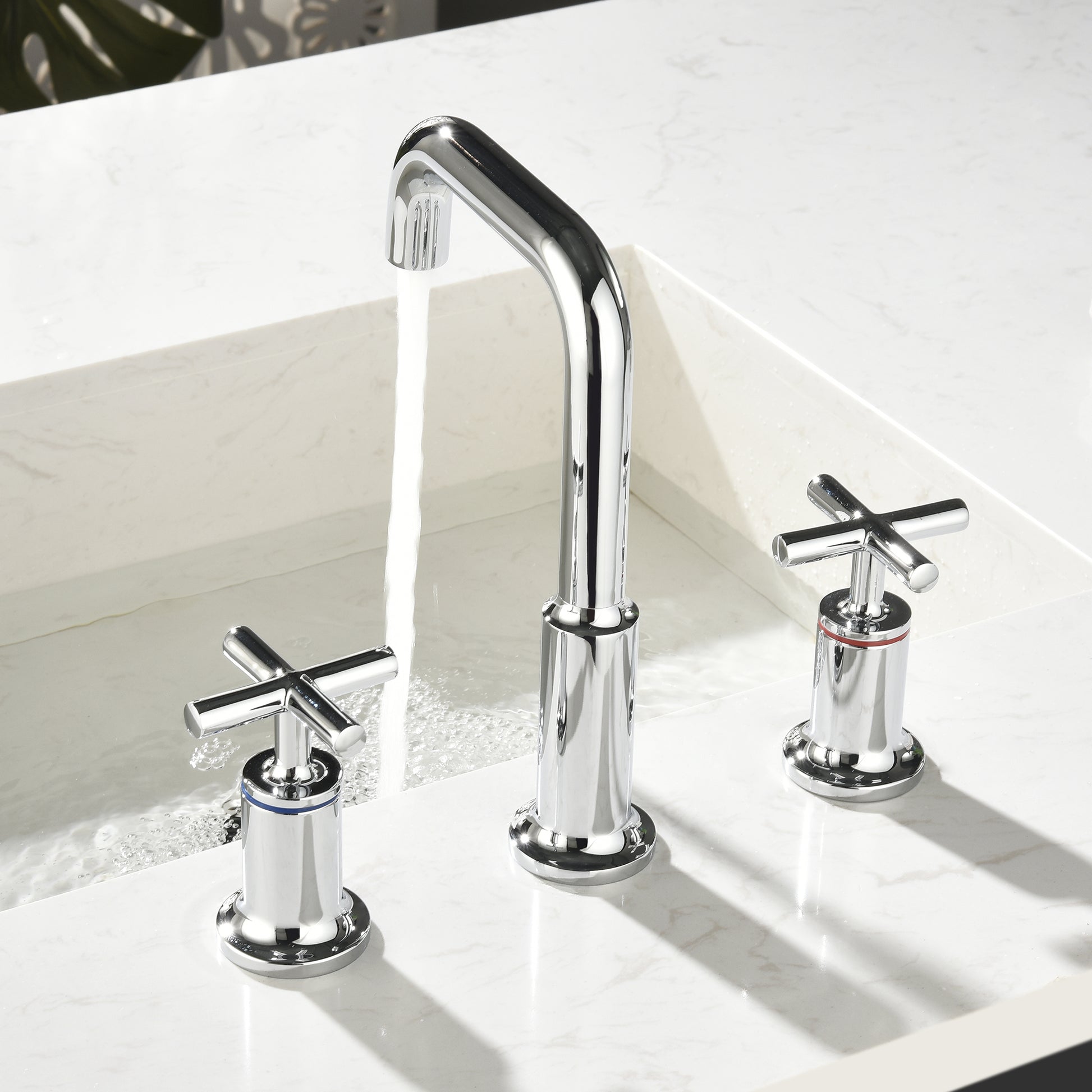 Crafted from high-purity solid brass, this 1.8 GPM 8 in. widespread bathroom faucet features a built-in ceramic cartridge for superior durability, rust resistance, and leak-free performance. The 360° swivel spout provides full sink coverage, while the ergonomic double-handle design allows precise control of water flow and temperature. Equipped with a high-performance ceramic cartridge tested for 500,000 cycles, it ensures long-lasting use. The chrome finish, treated with advanced electroplating, resists scratches, fingerprints, and tarnish, maintaining a sleek modern look. Designed for standard 3-hole sinks, it includes hot and cold water supply hoses with quick-connect fittings for hassle-free DIY installation in just 20 minutes.