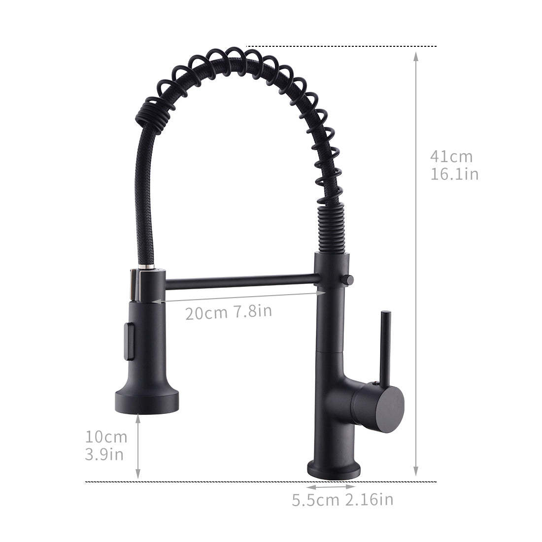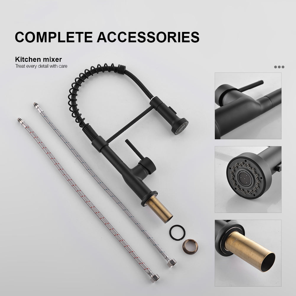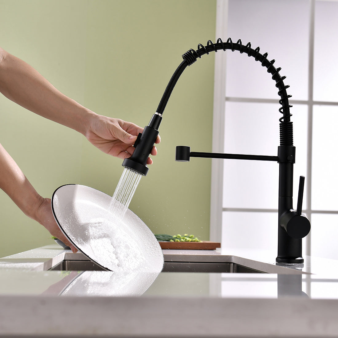 The Kitchen Faucet Brass Single-Handle Pull-Down Sprayer in Matte Black features a three-function sprayer head with STREAM, SPRAY, and PAUSE settings, allowing stable water pressure and making cleanup easier. Its retractable hose provides smooth maneuverability for maximum efficiency when completing kitchen tasks. Constructed from lead-free brass with a superior rust-resistant finish, this faucet combines durability and safety. The modern matte black finish resists tarnishing and peeling caused by corrosion. This faucet comes with a lifetime warranty and 100% money-back guarantee for complete satisfaction. The contemporary single-handle design with swivel pull-down sprayer and spout offers extreme flexibility, making rinsing cookware and kitchenware easier and more