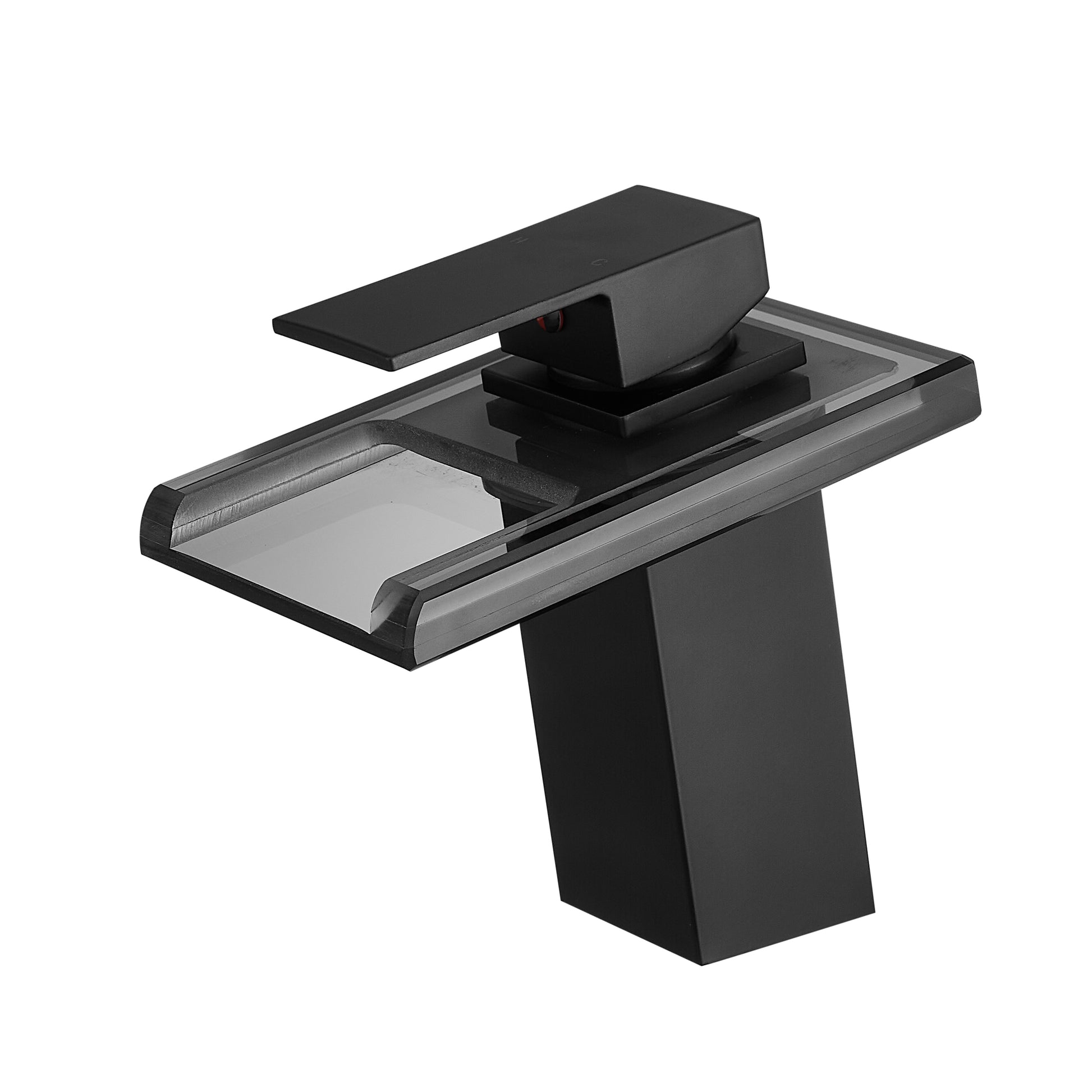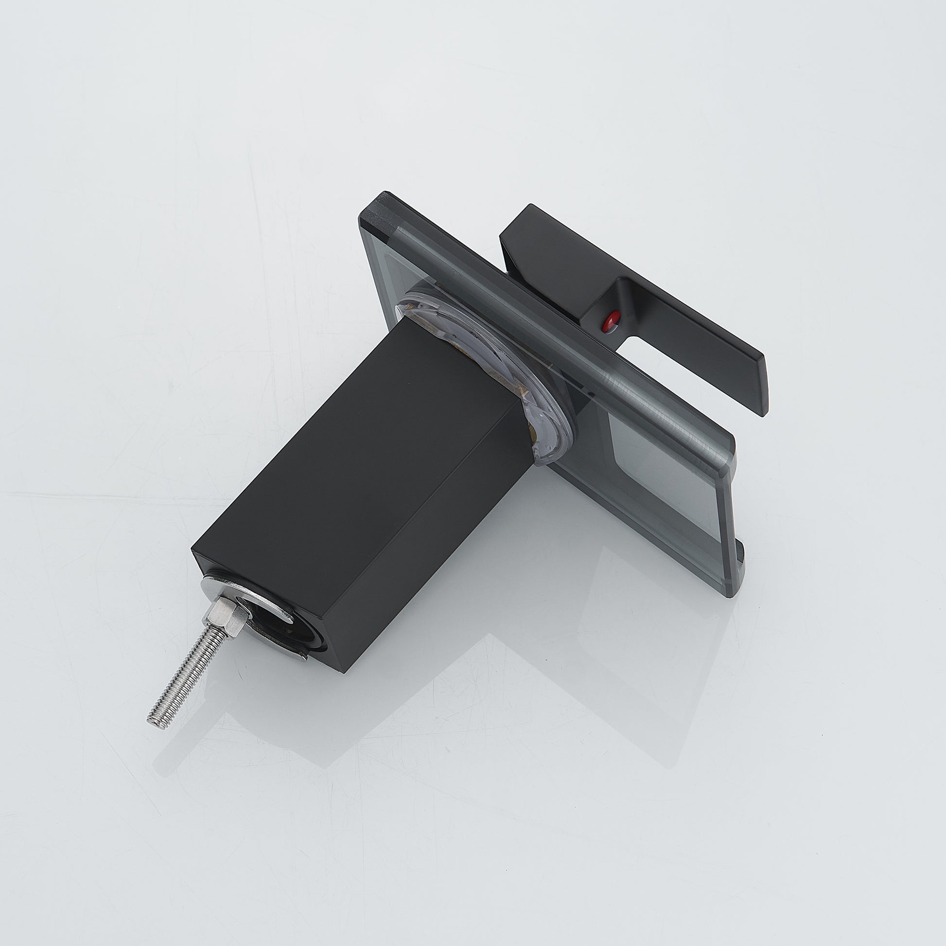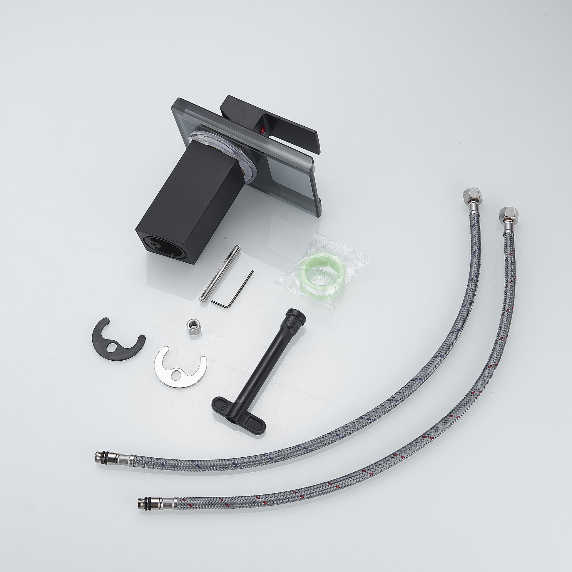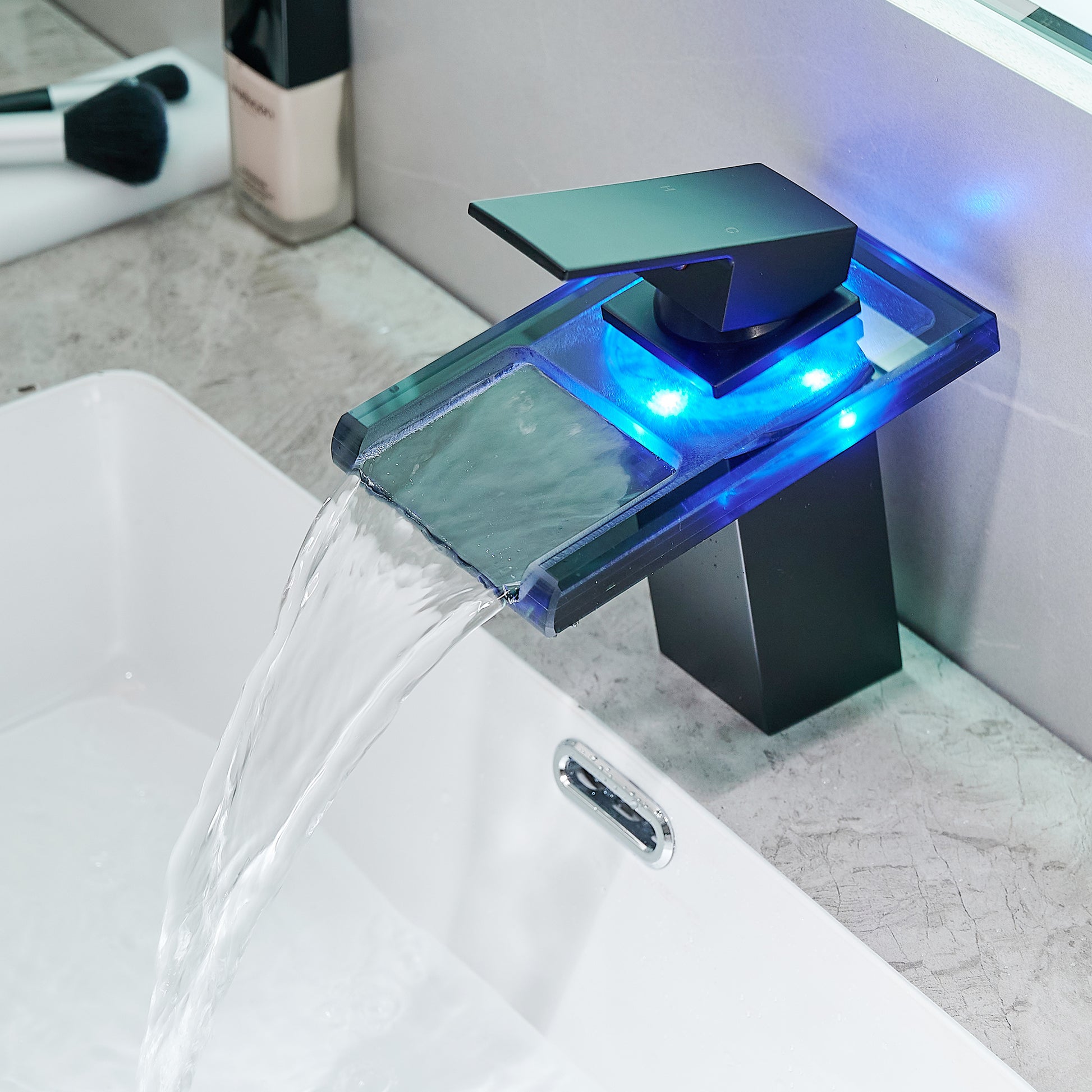This matte black single-hole, single-handle bathroom faucet is made of high-quality solid brass to resist corrosion and rust for long-lasting performance. The built-in LED temperature sensor light changes color with water temperature, powered by water flow with no batteries, protecting your family from hot and cold water. The delicate waterfall spout filters some impurities and provides smooth cascading water for a comfortable washing experience. Equipped with a high-performance ceramic cartridge tested for 500,000 cycles, ensuring low leakage and lifetime drip-free use. Ergonomic single handle allows precise control of water flow and temperature. Conforms to US standard 1-hole installation, with all necessary parts included for easy DIY installation.
