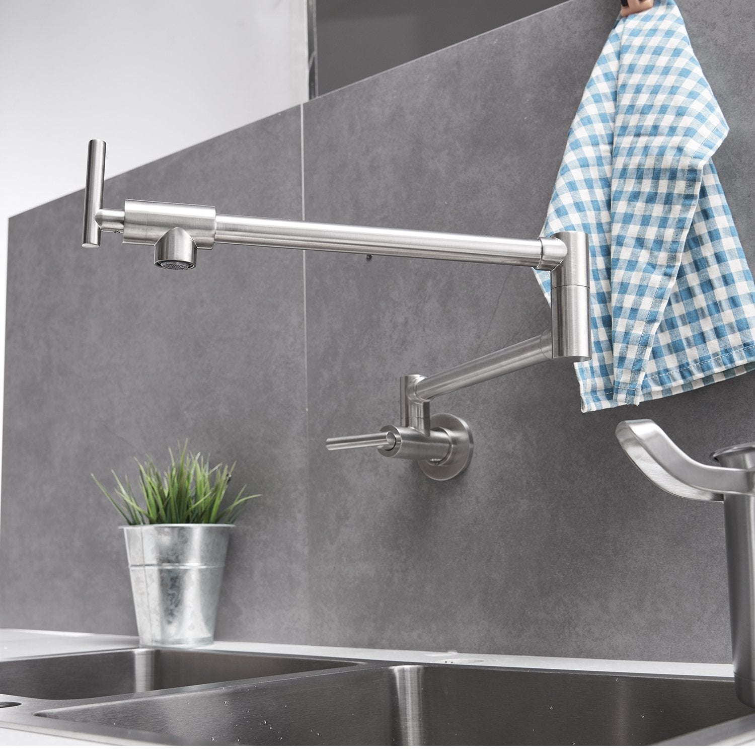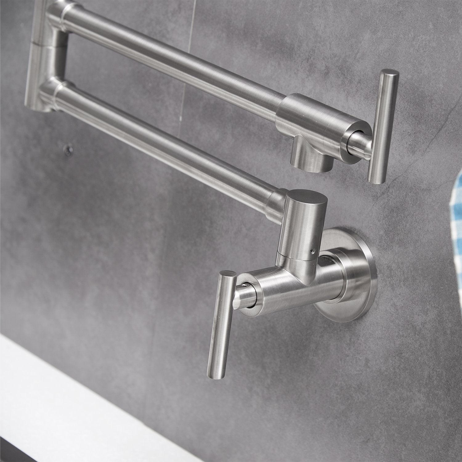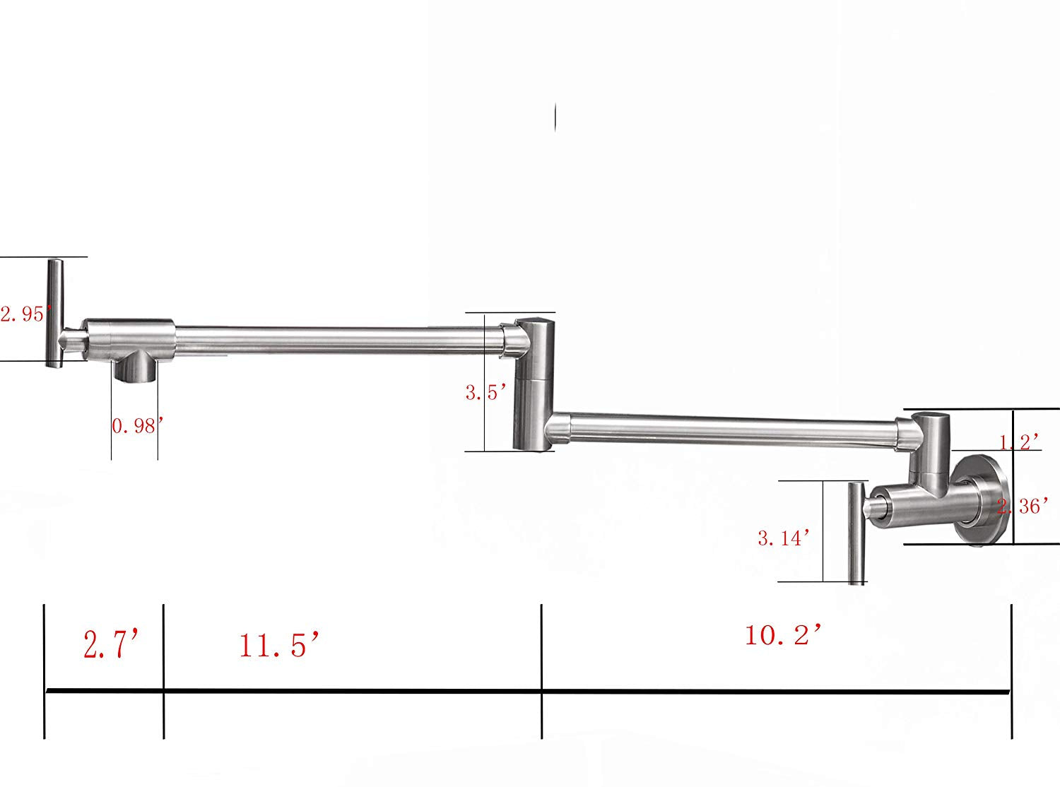This wall mount pot filler faucet is made of solid brass for durability and long lasting use. Designed to be installed above your stove or cooktop, it provides the convenience of filling pots directly. The brushed nickel finish offers a warm metallic look that is corrosion and scratch resistant, and easy to clean. Featuring dual handles with a double jointed swing spout, it extends up to approximately 26.3 inches and rotates 360 degrees for maximum flexibility. With standard 1 2 inch NPT or NPSM U.S. connections, it installs quickly and easily. Equipped with a ceramic disc cartridge, this pot filler ensures drip free performance for reliable daily use.