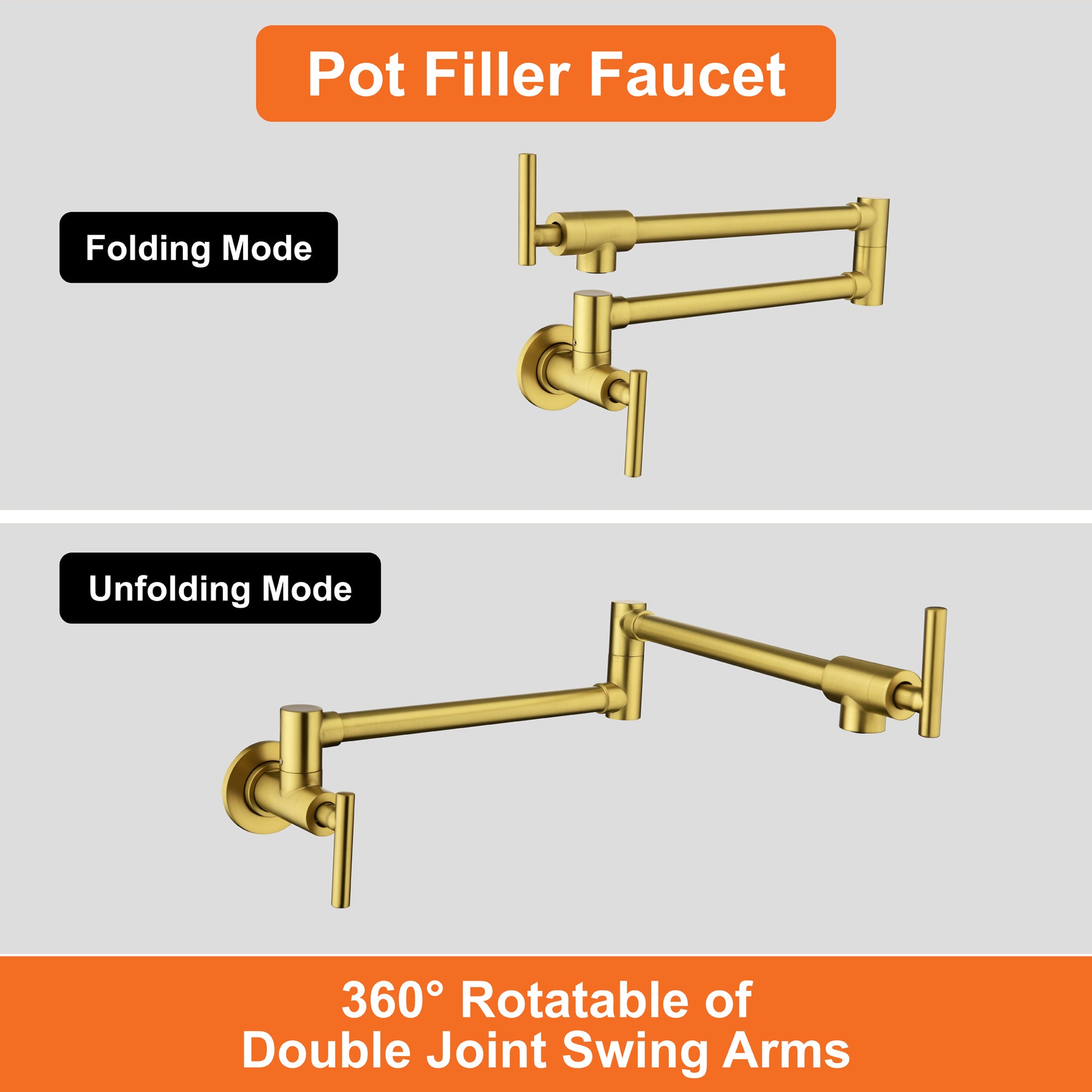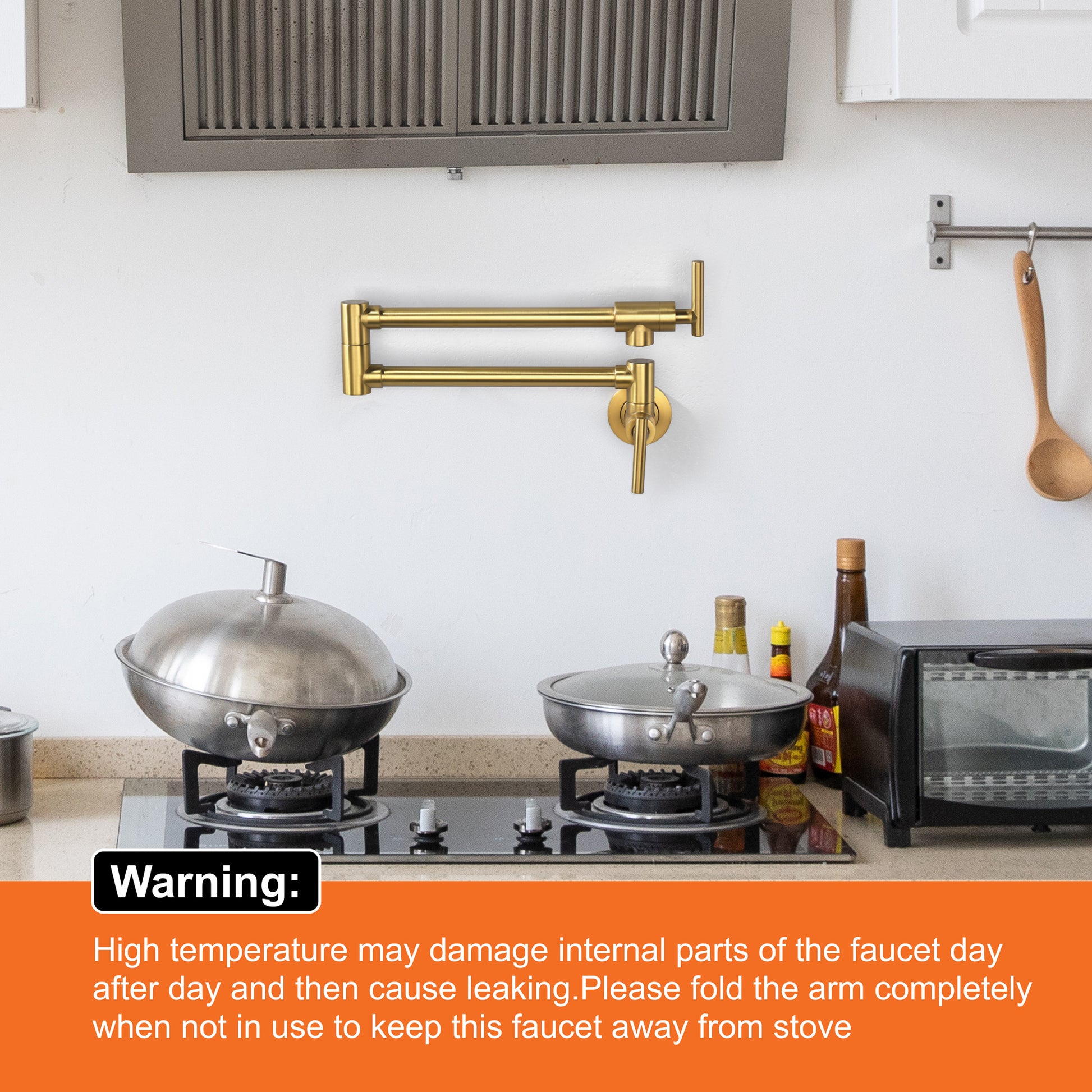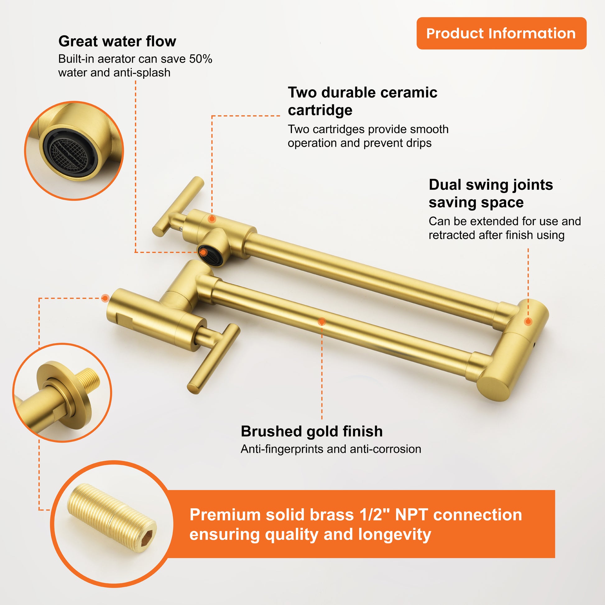 The Wall Mounted Double Handle 1.8 GPM Pot Filler in Brushed Gold features a unique anti-fingerprint glazed finish that adds elegance and style to your kitchen. A built-in aerator delivers powerful water flow while saving up to 50% water and preventing splashes. Equipped with two durable ceramic cartridges, it ensures smooth operation and drip-free performance. Dual swing joints allow the faucet to extend when in use and retract to save space—please turn off both handles after use. For safety, keep the faucet folded away from the stove when not in use to avoid heat damage over time. Crafted from premium solid brass, the main body resists corrosion and offers lasting durability, heavier and stronger than zinc alloy or thin brass faucets, ensuring superior quality.