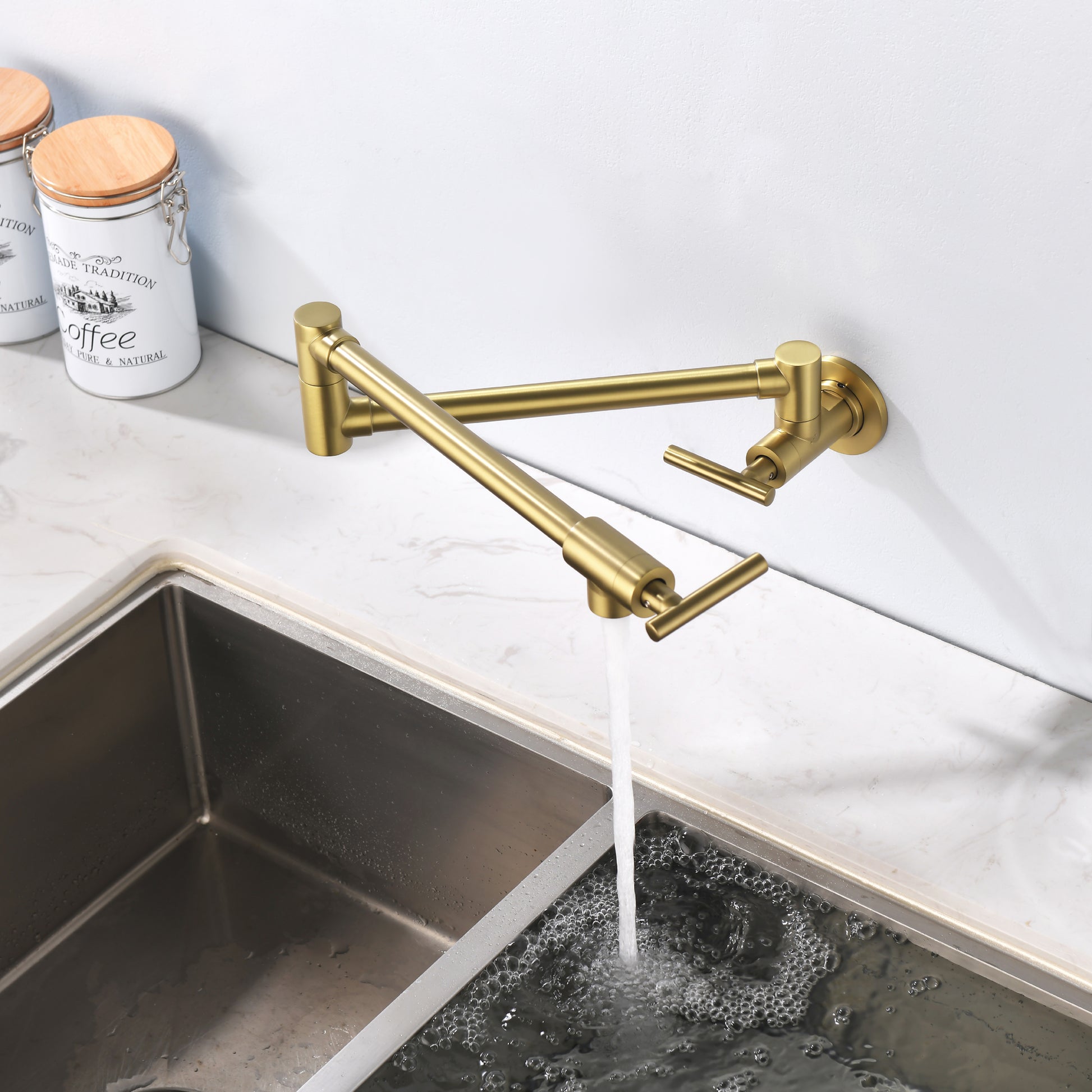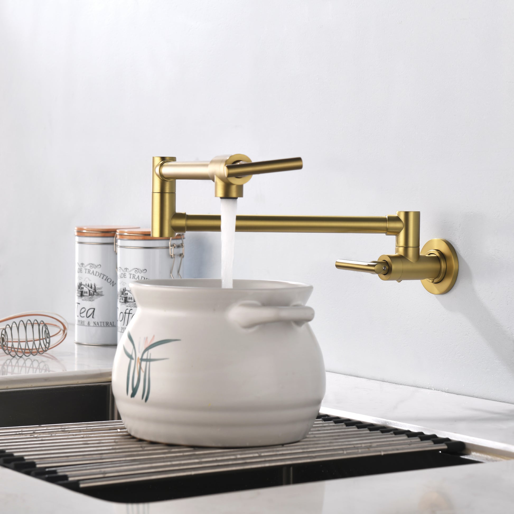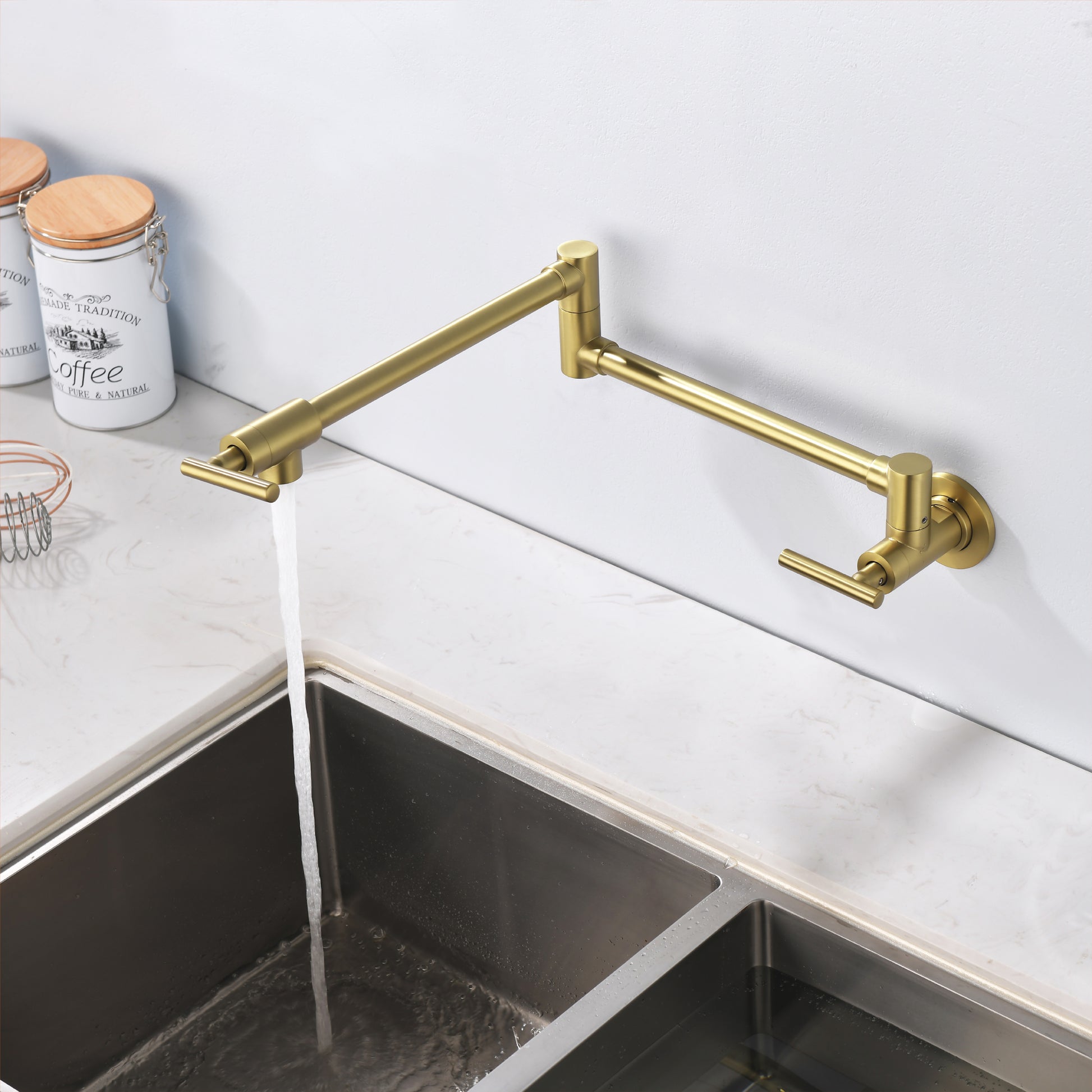 The Wall Mounted Double Handle 1.8 GPM Pot Filler in Brushed Gold features a unique anti-fingerprint glazed finish that adds elegance and style to your kitchen. A built-in aerator delivers powerful water flow while saving up to 50% water and preventing splashes. Equipped with two durable ceramic cartridges, it ensures smooth operation and drip-free performance. Dual swing joints allow the faucet to extend when in use and retract to save space—please turn off both handles after use. For safety, keep the faucet folded away from the stove when not in use to avoid heat damage over time. Crafted from premium solid brass, the main body resists corrosion and offers lasting durability, heavier and stronger than zinc alloy or thin brass faucets, ensuring superior quality.