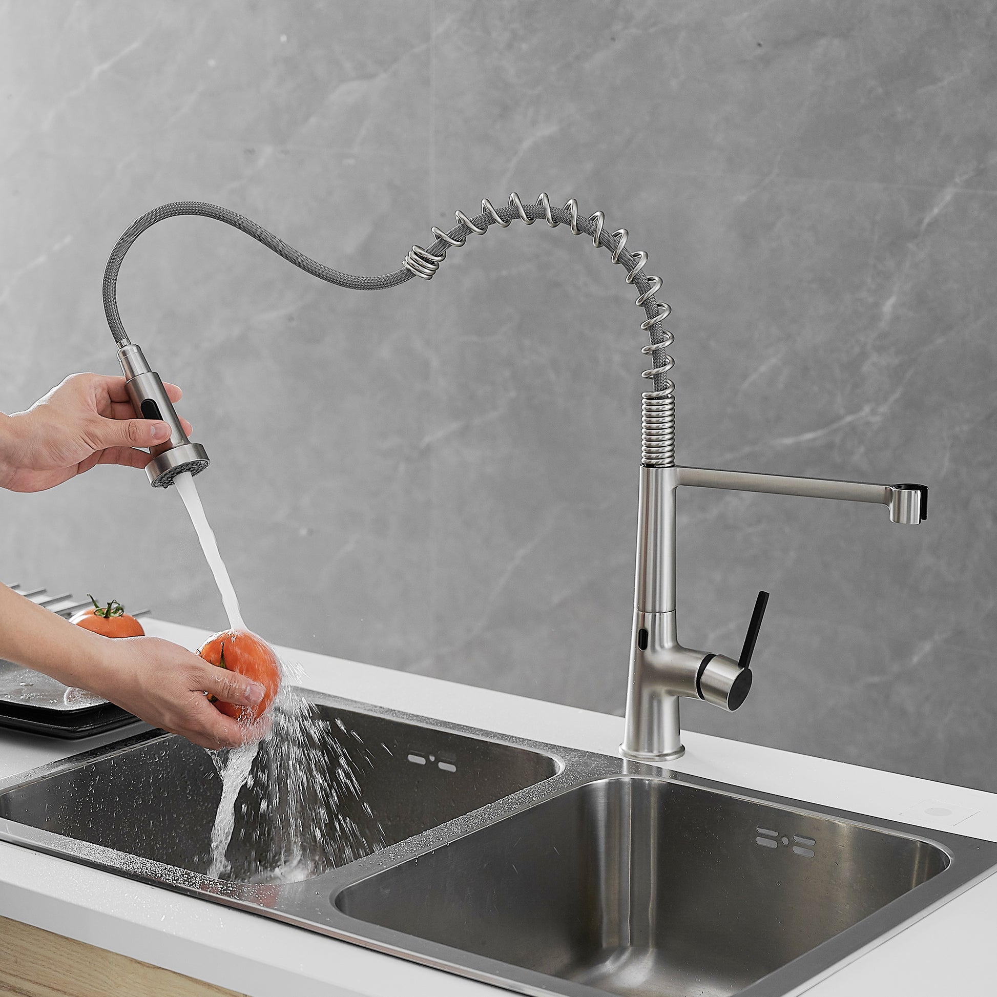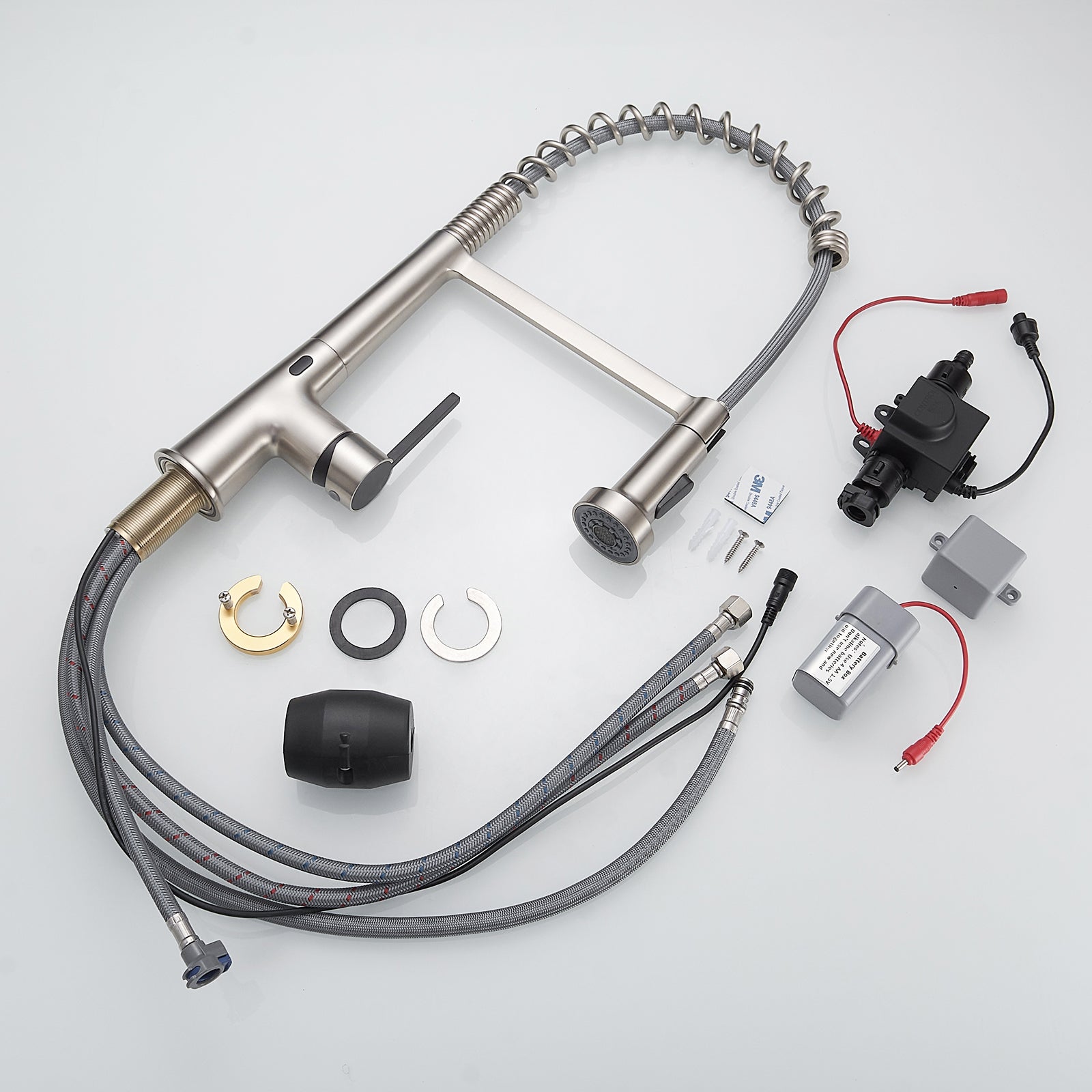 The 1.8 GPM Single Handle Touchless Pull Down Sprayer Kitchen Faucet in Brushed Nickel features a high-arch spout and two spray patterns: a steady stream for water filling and a powerful spray for rinsing. Touchless operation allows you to activate or stop the water flow with a simple hand motion near the sensor, and water automatically stops after 3 minutes if no motion is detected, helping to reduce water waste and prevent fingerprints and stains. The durable ceramic cartridge has passed multiple open-and-close tests, ensuring long-lasting performance. Its high-quality brushed finish resists rust, corrosion, and discoloration, making cleaning easier. Easy DIY installation is supported with pre-packaged accessories and instructions. The sensor works with 4 AA batteries (not included) and requires no external power source.