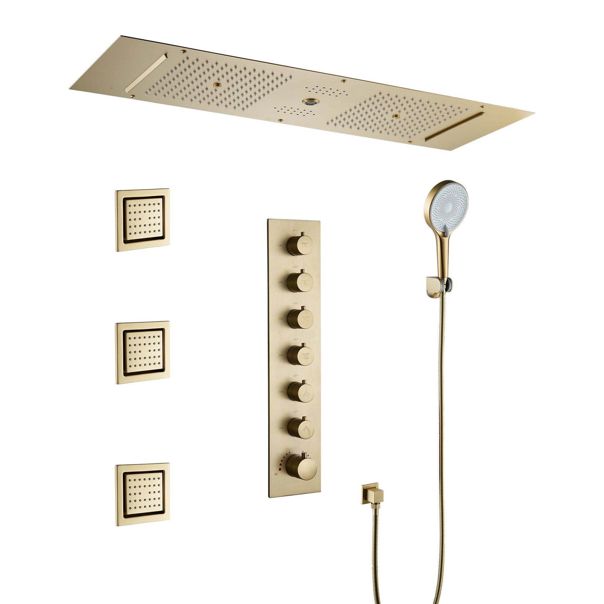 Ceiling Mounted Thermostatic Shower System with Body Jets, LED Rainfall Shower, Bluetooth Speakers and Touch Control, Brushed Gold