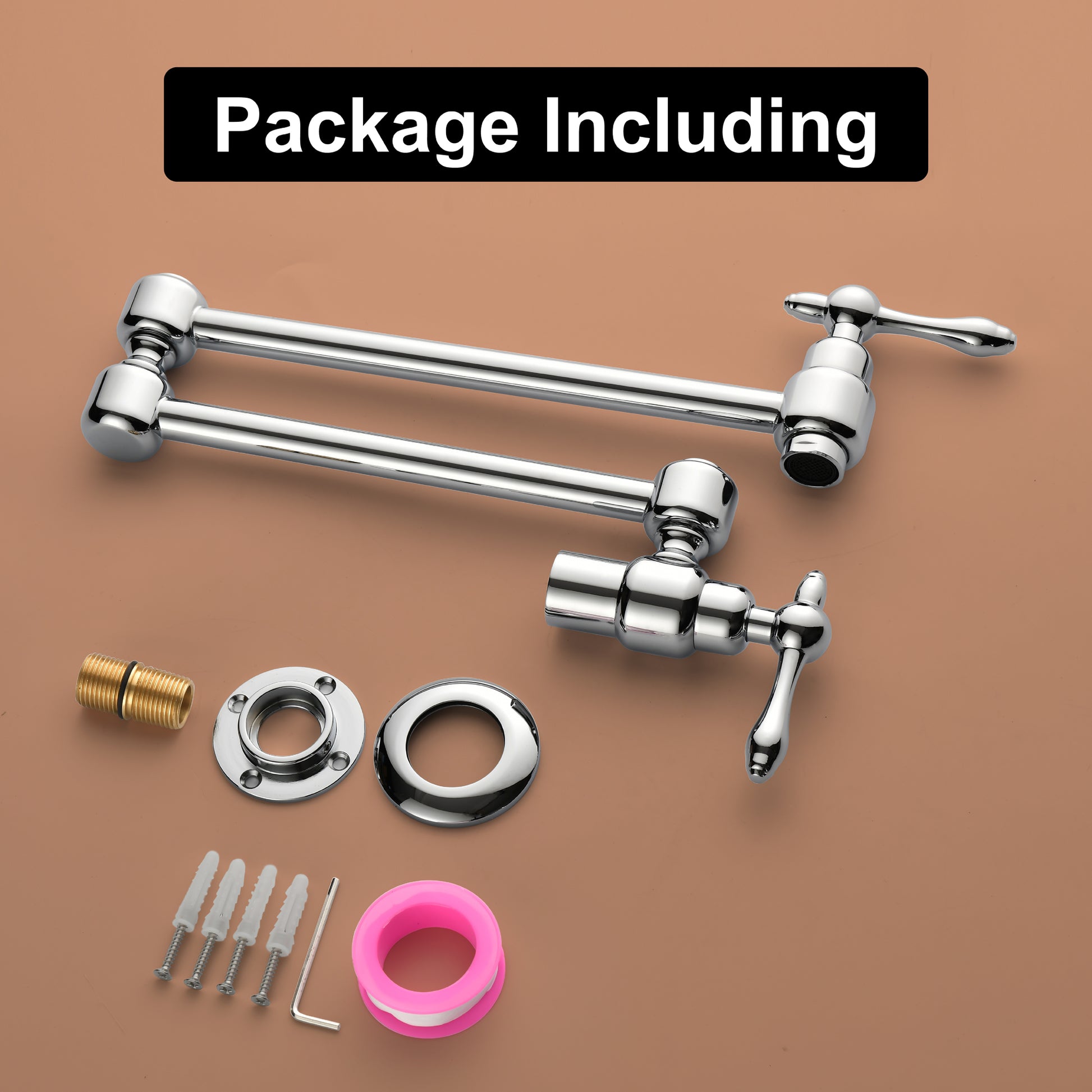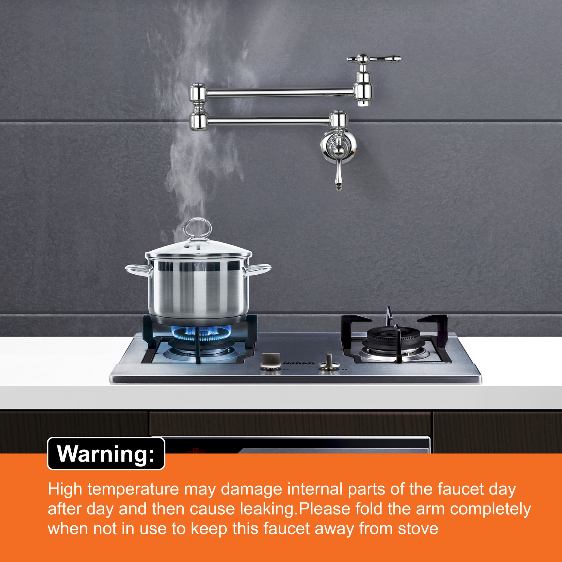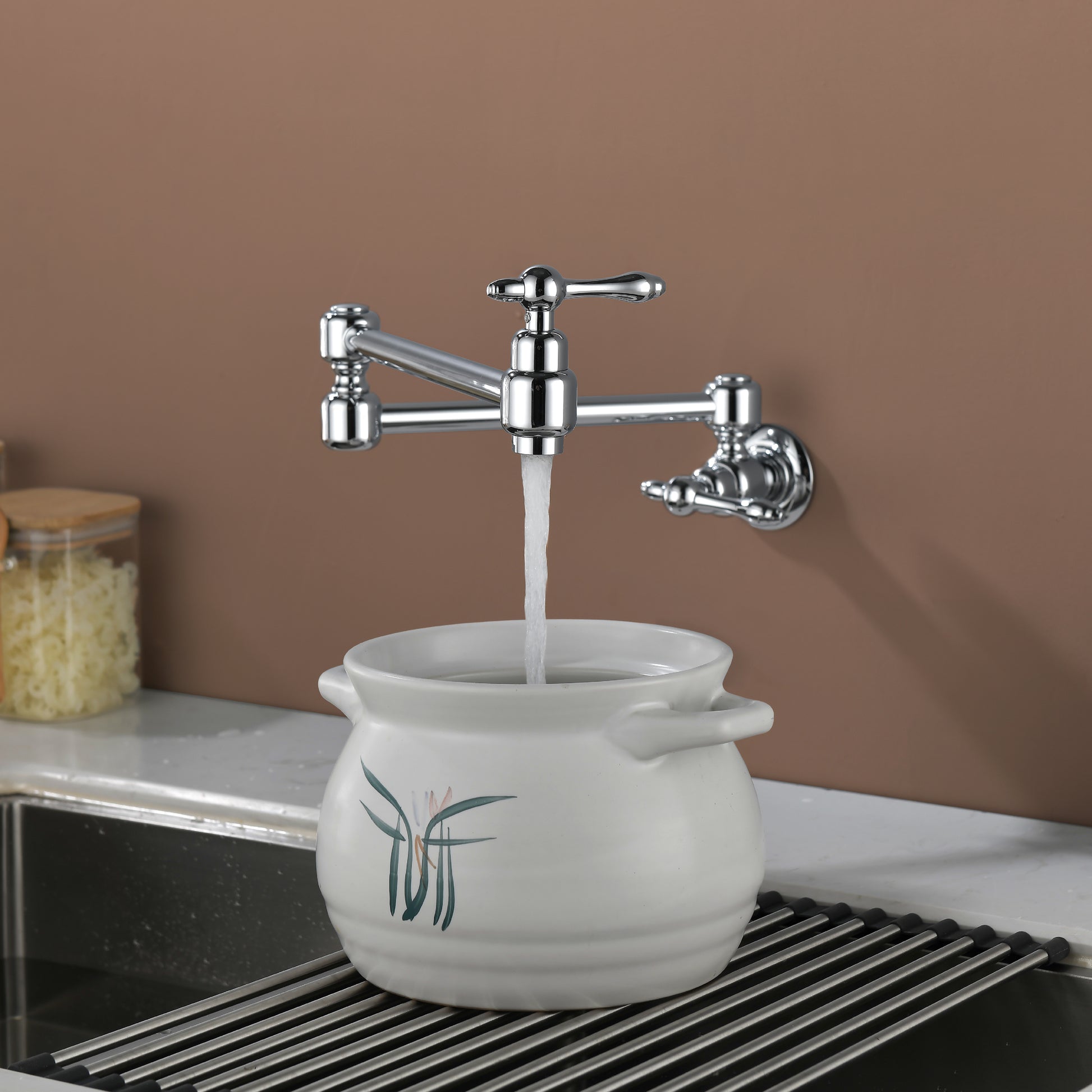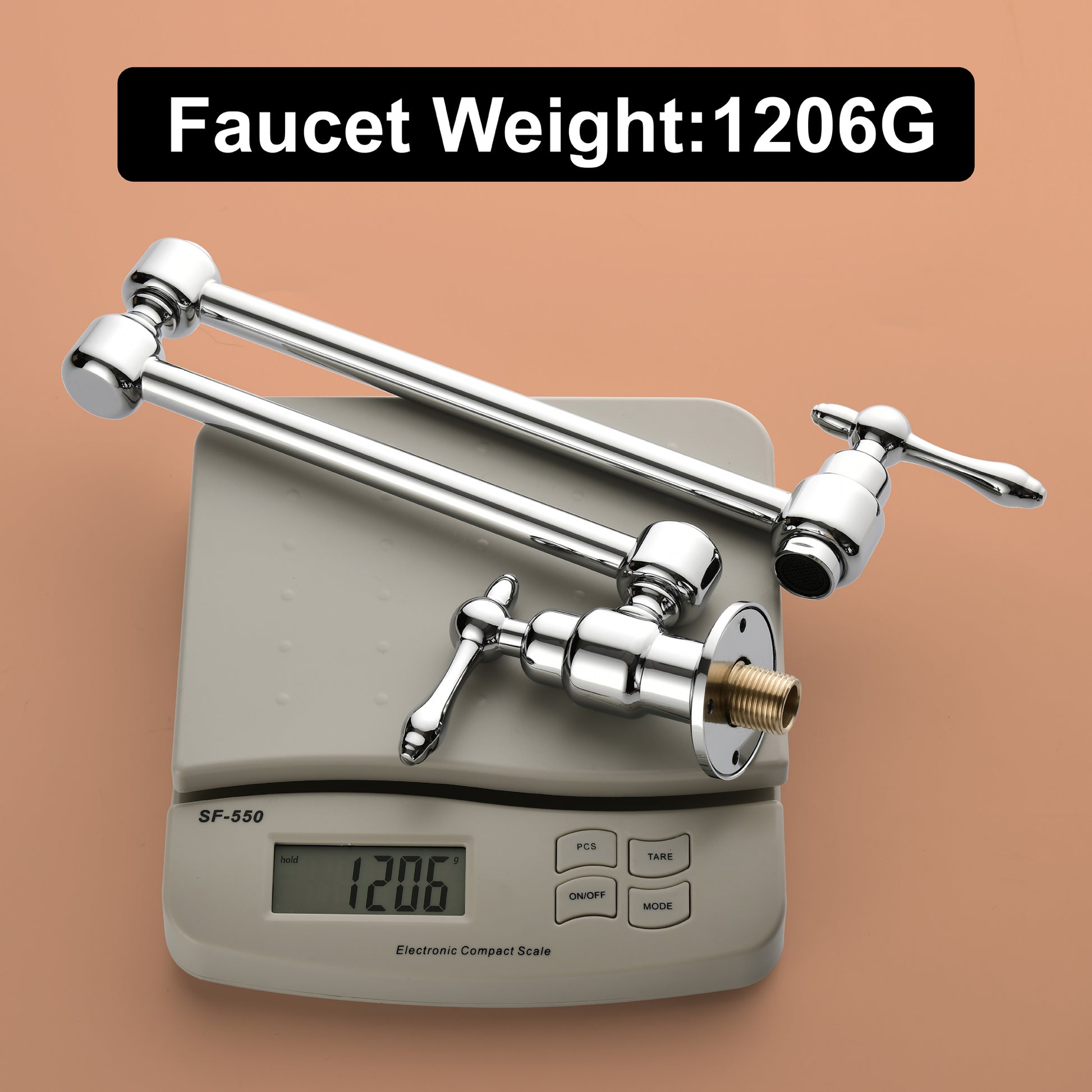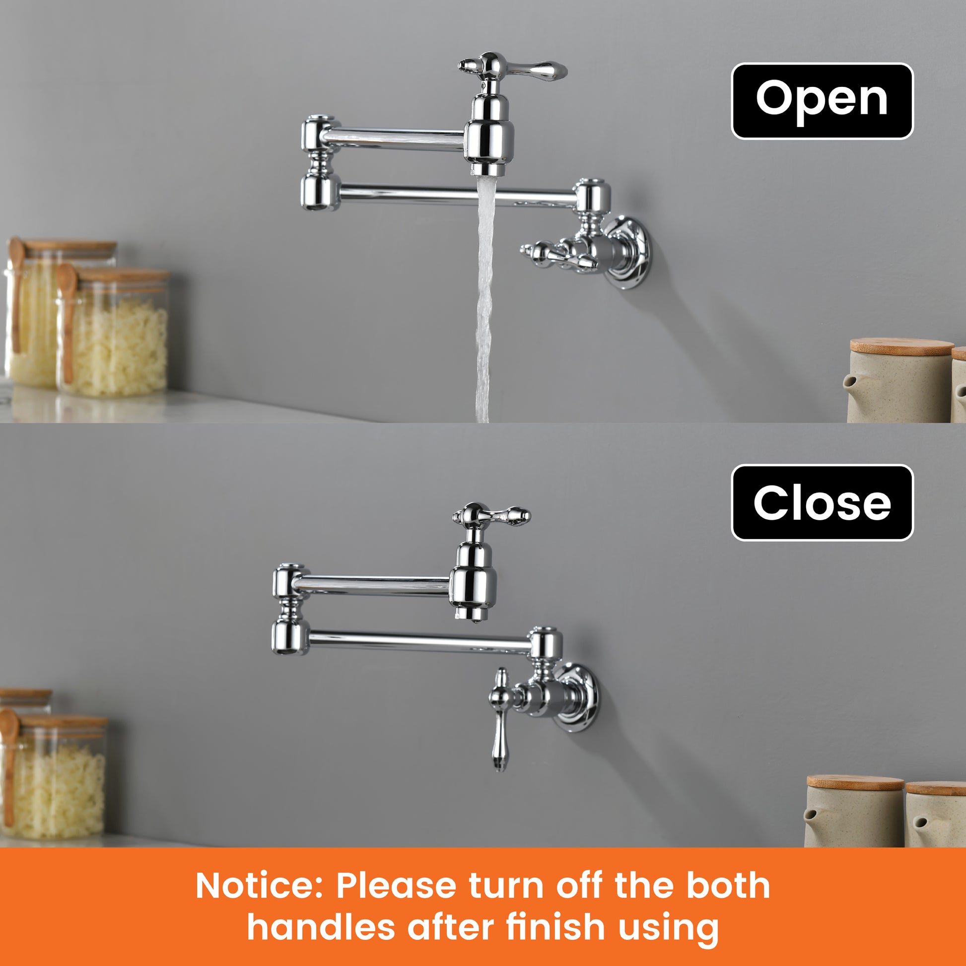The Wall Mounted Double Handle 1.8 GPM Pot Filler in Chrome Plated features a bright chrome surface that will brighten up your kitchen, the built-in aerator ensures great water flow while saving up to 50% water and preventing splashes, equipped with two durable ceramic cartridges it provides smooth operation and drip-free performance, the dual swing joints extend easily during use and retract after finishing to save space, please make sure to turn off both handles after each use and fold the faucet completely away from the stove to prevent heat from damaging the internal parts over time, constructed from premium solid brass the faucet is corrosion-resistant and built for long-lasting durability, heavier and stronger than zinc alloy faucets or thin brass pipe models it delivers exceptional quality you can feel.