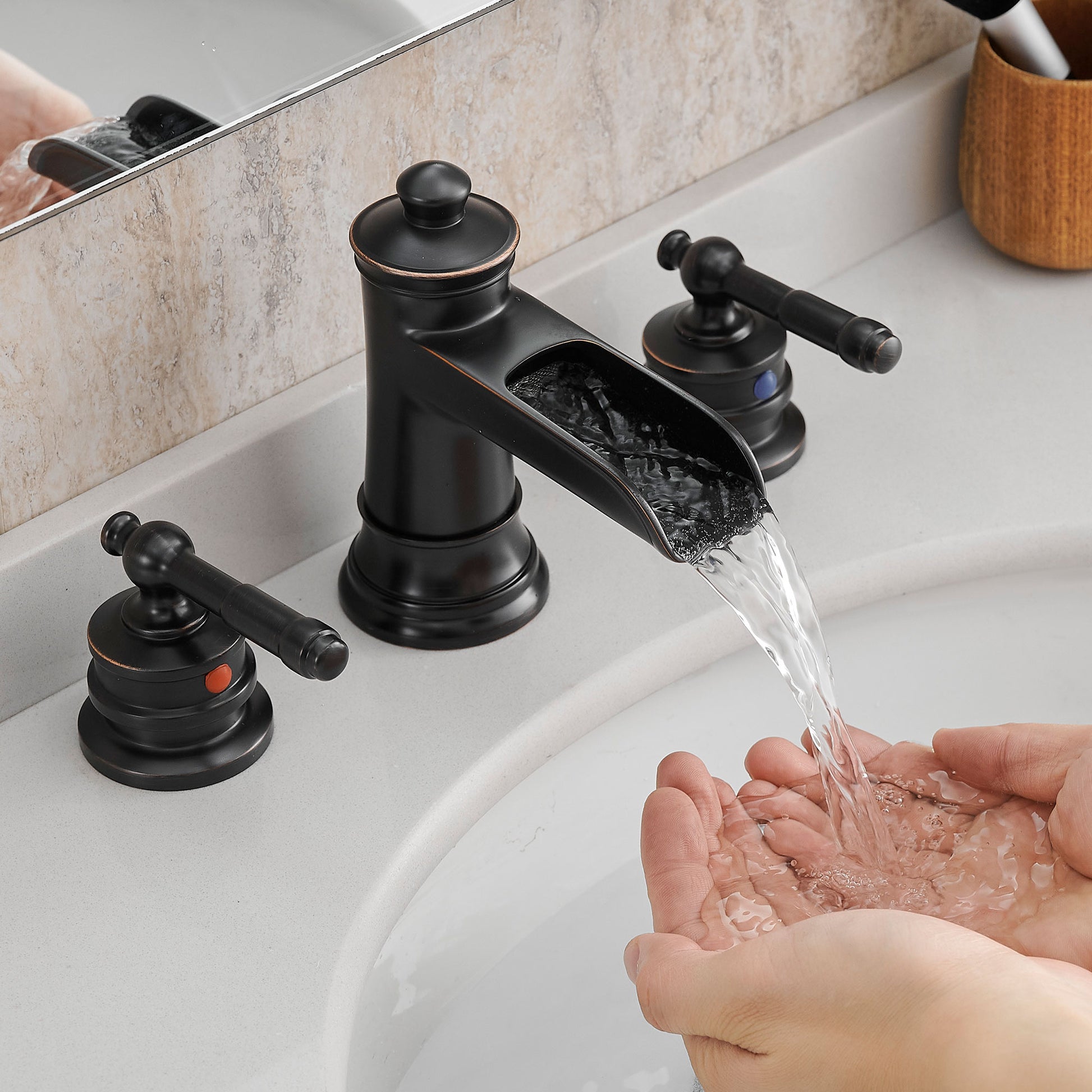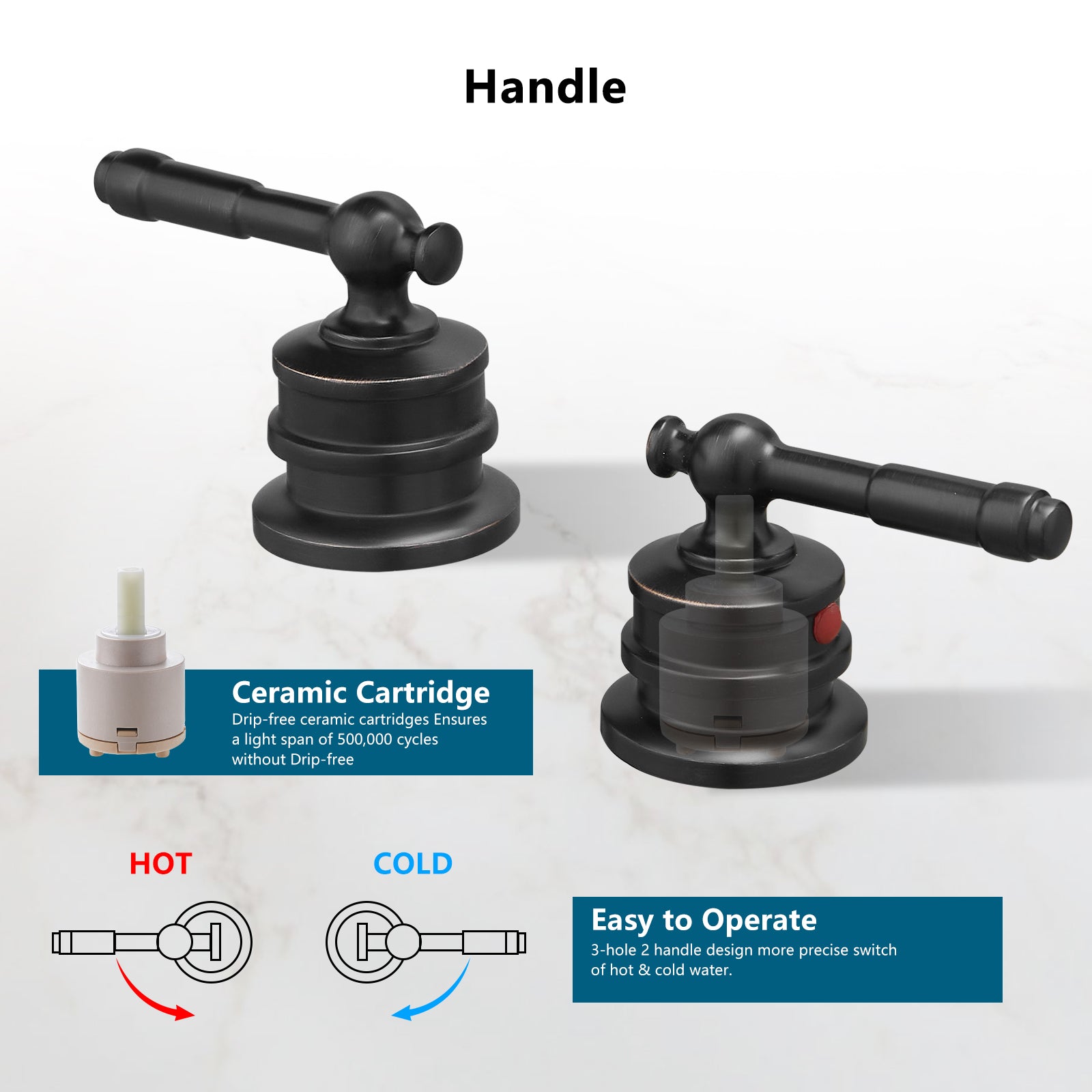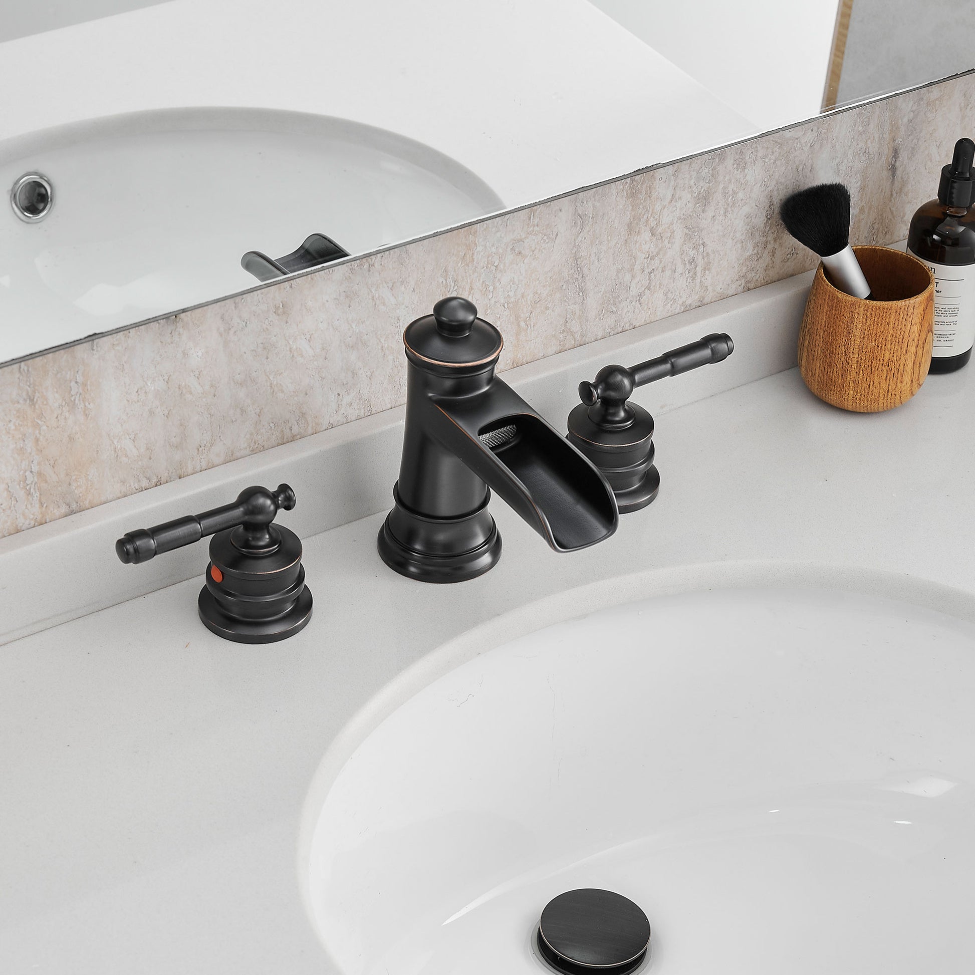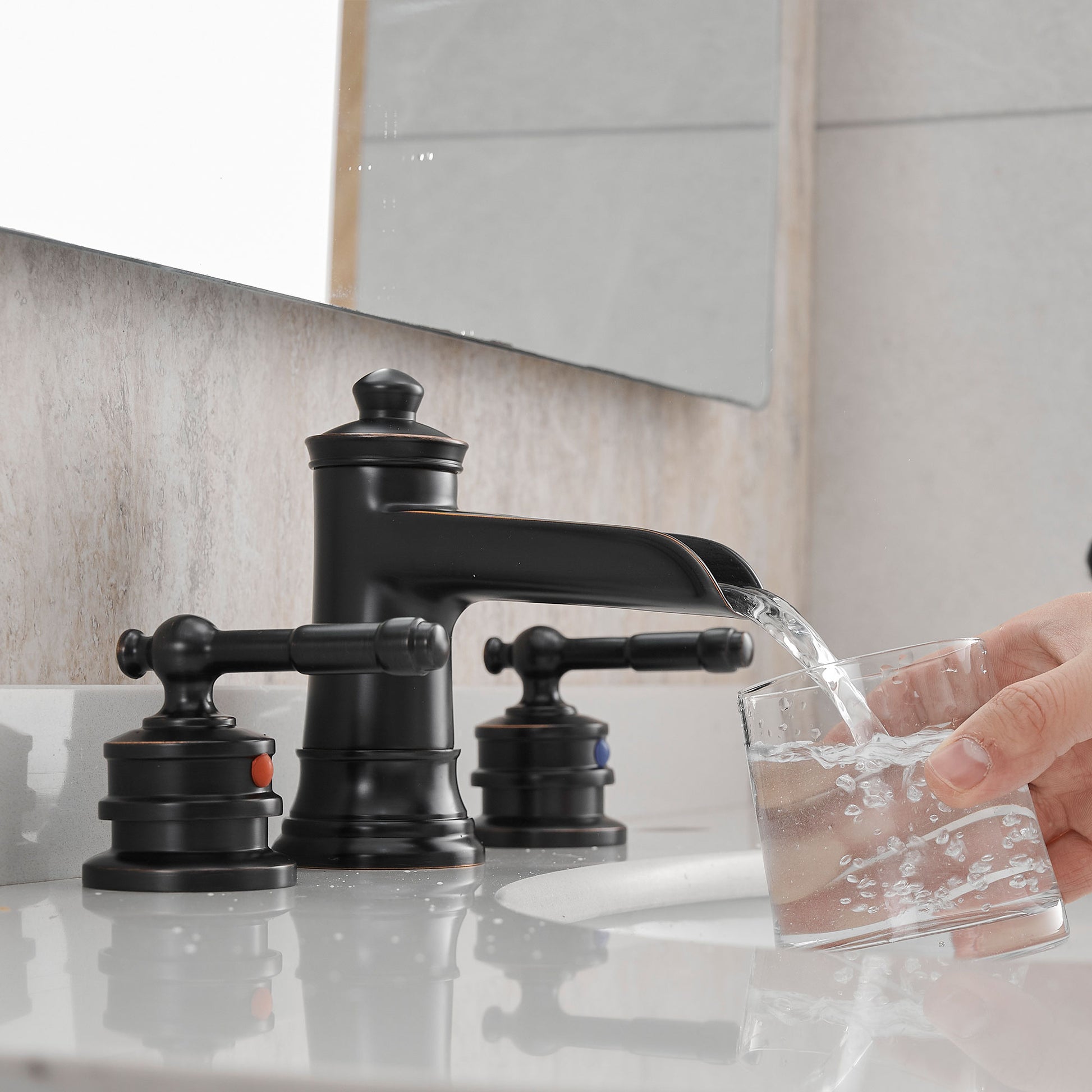 The Classic 8 Inch Widespread Double Handle Brass Bathroom Faucet in Oil Rubbed Bronze ensures utmost safety with CUPC-certified water supply hoses that meet IAPMO standards, and includes a matching pop-up drain with a convenient press-seal mechanism for seamless installation. Designed for 3-hole widespread sinks with adjustable 6–16 inch spacing, it features dual handles for precise control of hot and cold water and delivers a steady 1.8 GPM flow. Constructed from solid brass with ceramic disc cartridges tested for 500,000 open/close cycles, this faucet guarantees long-lasting, drip-free performance. Available in brushed nickel, matte black, oil-rubbed bronze, or brushed gold finishes, it includes professional installation instructions for a 30-minute setup, with after-sales support within 24 hours.