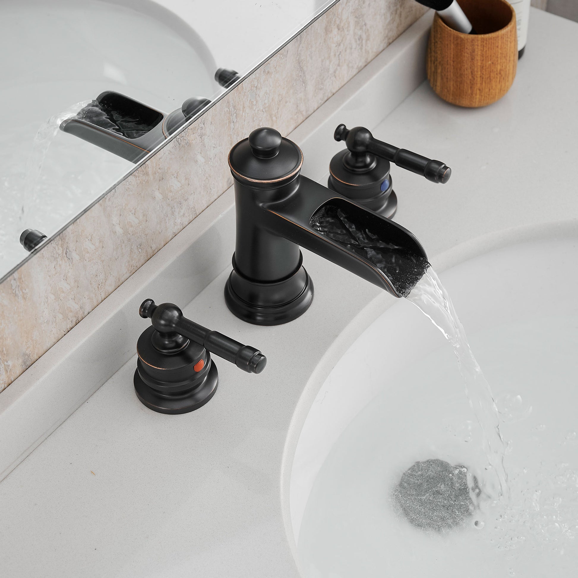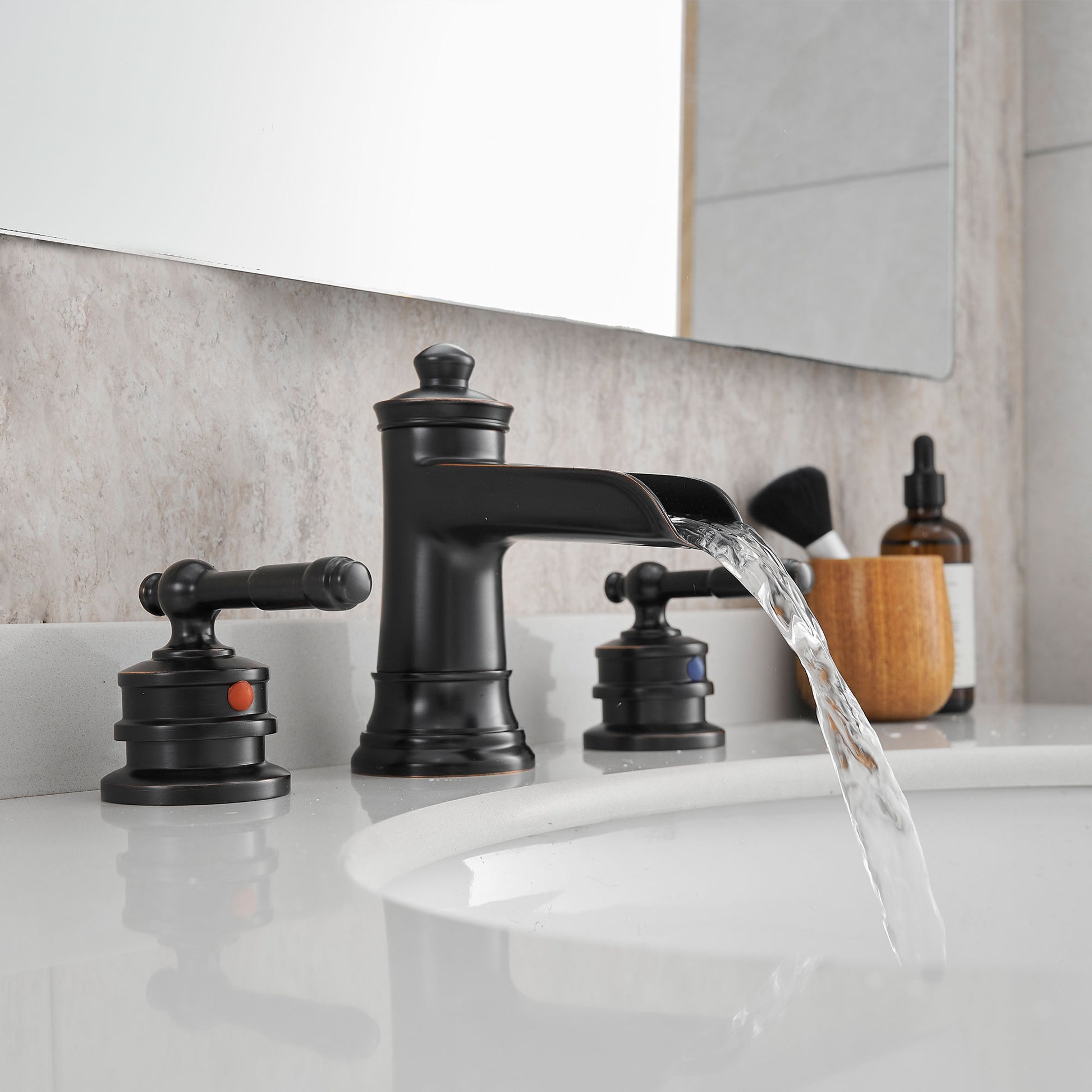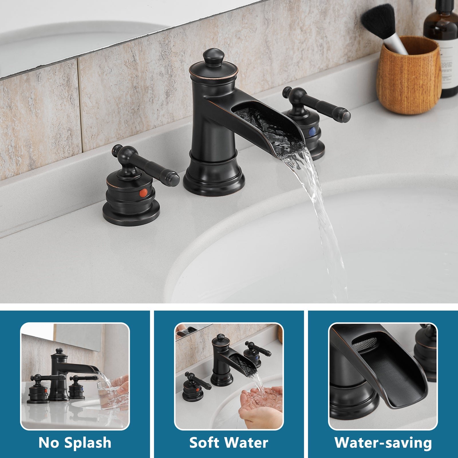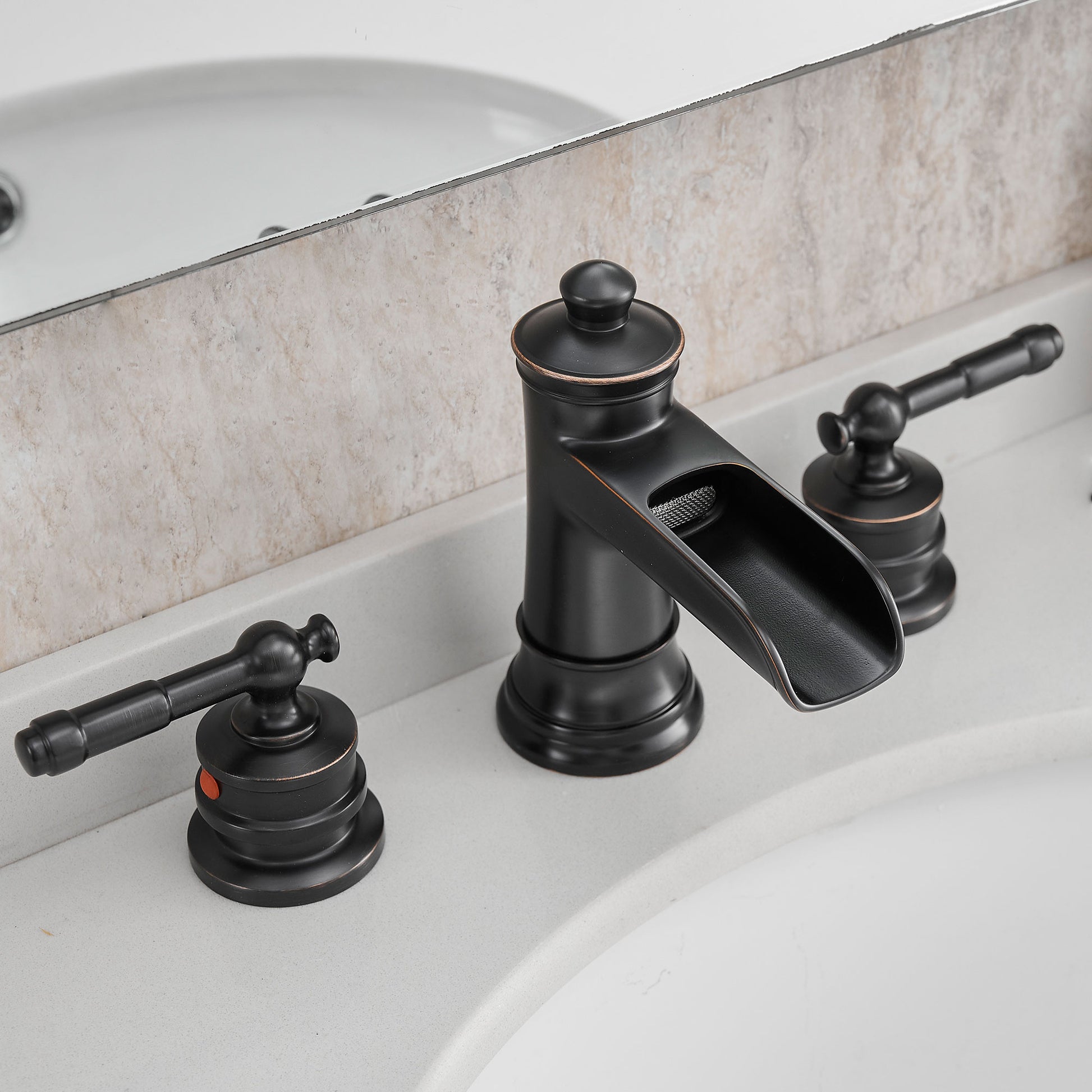The Classic 8 Inch Widespread Double Handle Brass Bathroom Faucet in Oil Rubbed Bronze ensures utmost safety with CUPC-certified water supply hoses that meet IAPMO standards, and includes a matching pop-up drain with a convenient press-seal mechanism for seamless installation. Designed for 3-hole widespread sinks with adjustable 6–16 inch spacing, it features dual handles for precise control of hot and cold water and delivers a steady 1.8 GPM flow. Constructed from solid brass with ceramic disc cartridges tested for 500,000 open/close cycles, this faucet guarantees long-lasting, drip-free performance. Available in brushed nickel, matte black, oil-rubbed bronze, or brushed gold finishes, it includes professional installation instructions for a 30-minute setup, with after-sales support within 24 hours.