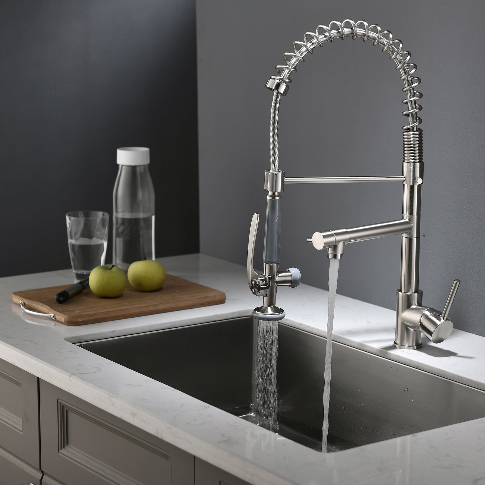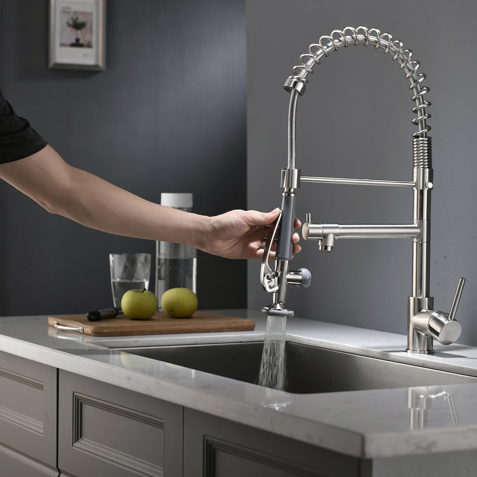 The Contemporary Single-Handle Gooseneck Pull-Down Sprayer Kitchen Faucet in Brushed Nickel features a convenient single-lever design that is safe and durable, a 360-degree swivel spout offering two different spray or stream modes, and easy installation with its quick-connect design and heavy-duty commercial-style spring. Designed with clean lines and sleek looks, this spring single-handle pull-down faucet is an ageless yet fashion-forward masterpiece for any kitchen. With finishes built to last a lifetime and water-efficient, drip-free performance, the spring pull-out spray faucet works seamlessly with modern lifestyles, providing a quick and stylish kitchen upgrade.