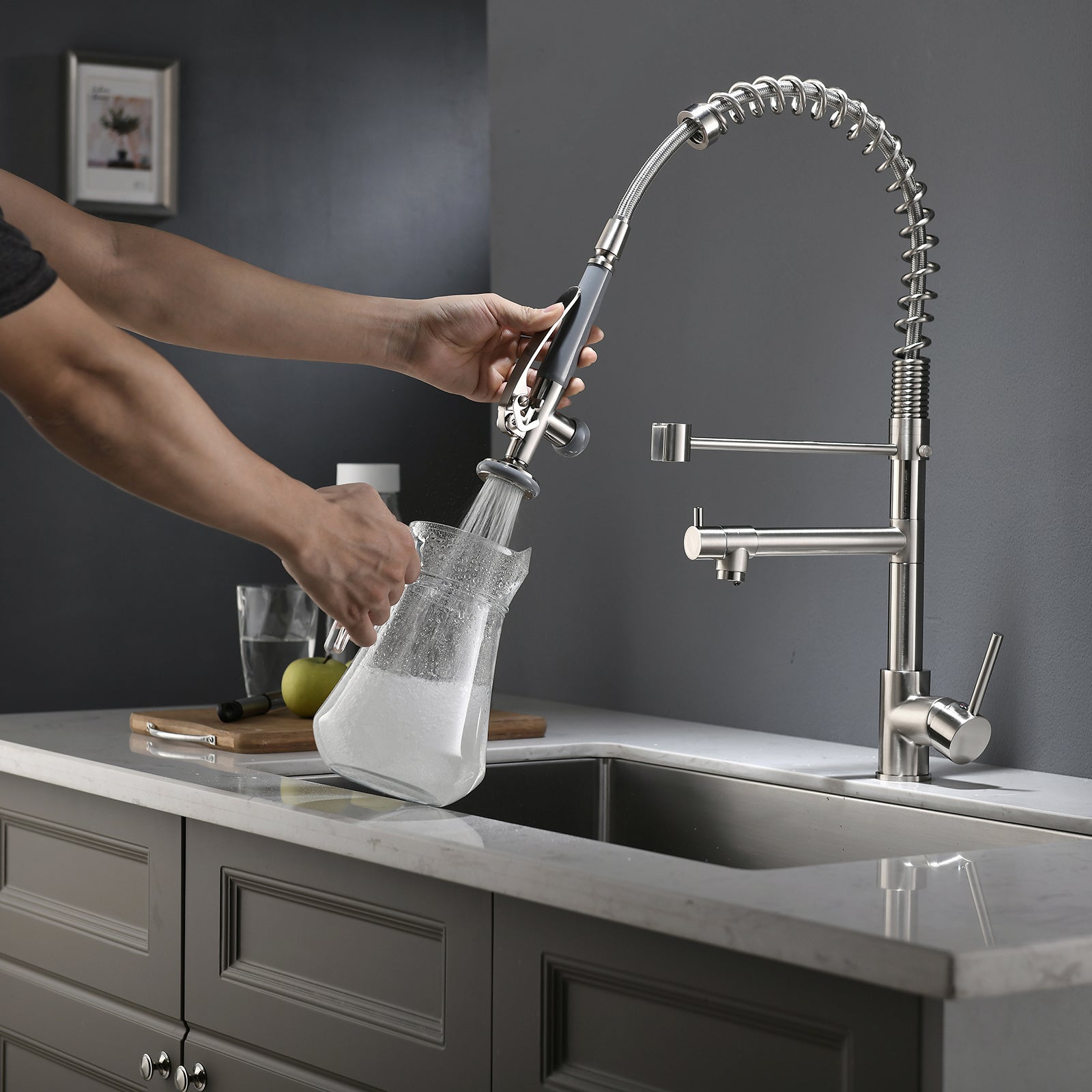 Spring single handle pull down kitchen faucet designed with clean lines and sleek looks creating a timeless yet fashion-forward centerpiece
