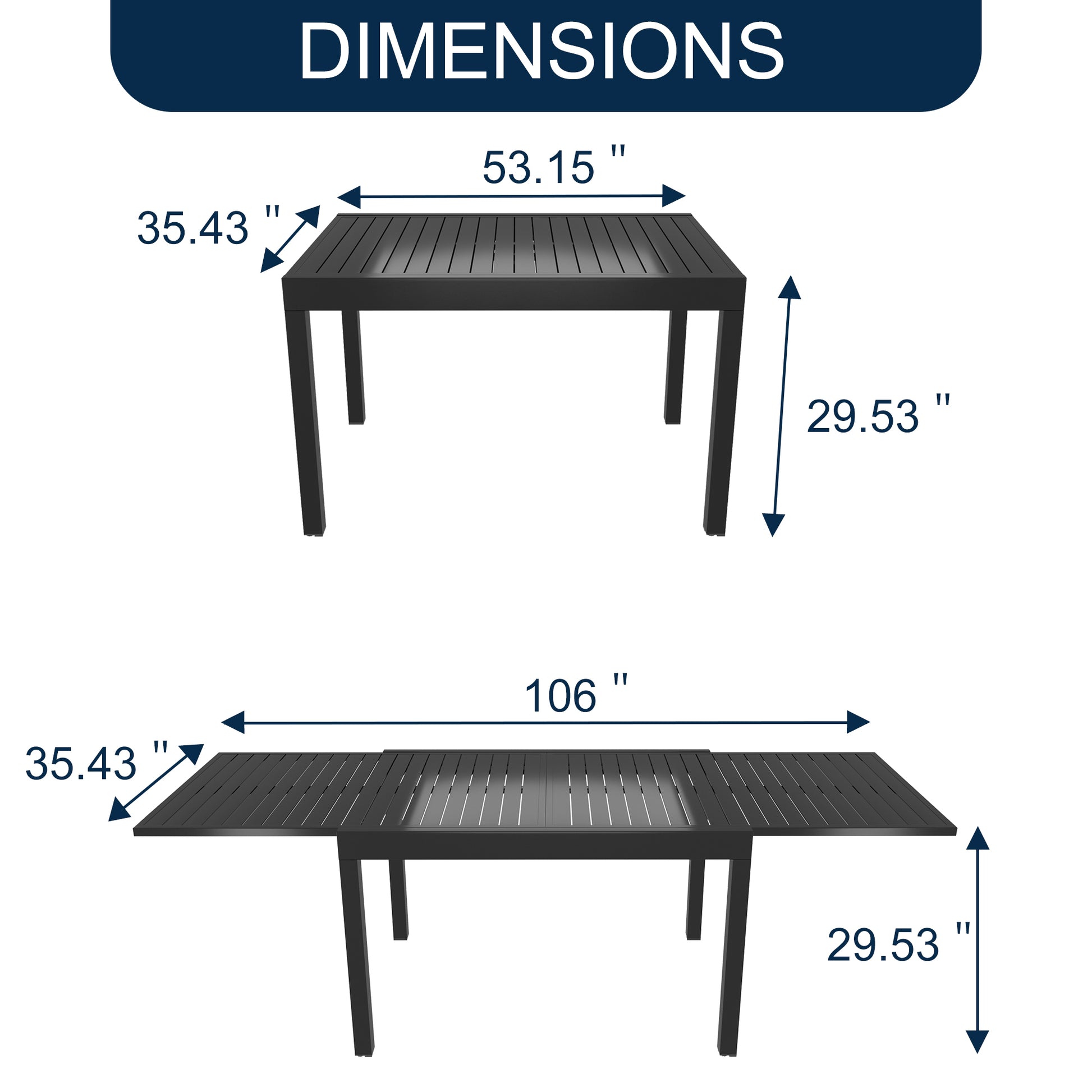 This durable aluminum table features an e-coating for long-lasting use, with a sleek black finish that resists rust and weathering, ensuring years of enjoyment. Its dual-size design folds to 53.1"L x 35.4"W x 29.5"H and expands to 106.3"L, easily accommodating 4-10 people. Perfect for both indoor and outdoor use, the modern leaf-inspired design saves space while adding a stylish touch to any patio, garden, or dining area. Simple assembly required.