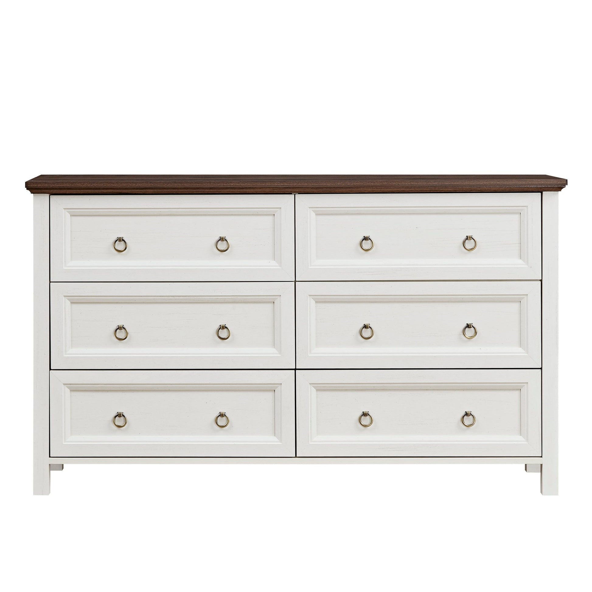 Our Wooden Farmhouse Style Six Drawer Wardrobe beautifully combines modern and rustic elements, adding unique charm to your bedroom or living room. Featuring six spacious drawers, it serves as an excellent clothes organizer, lingerie cupboard, or decorative storage solution. Crafted from durable, scratch-resistant materials, it offers superior stability with wide 2'' x 2'' feet and smooth metal glides for easy access, all accented by vintage brass round pulls that enhance its French country elegance.