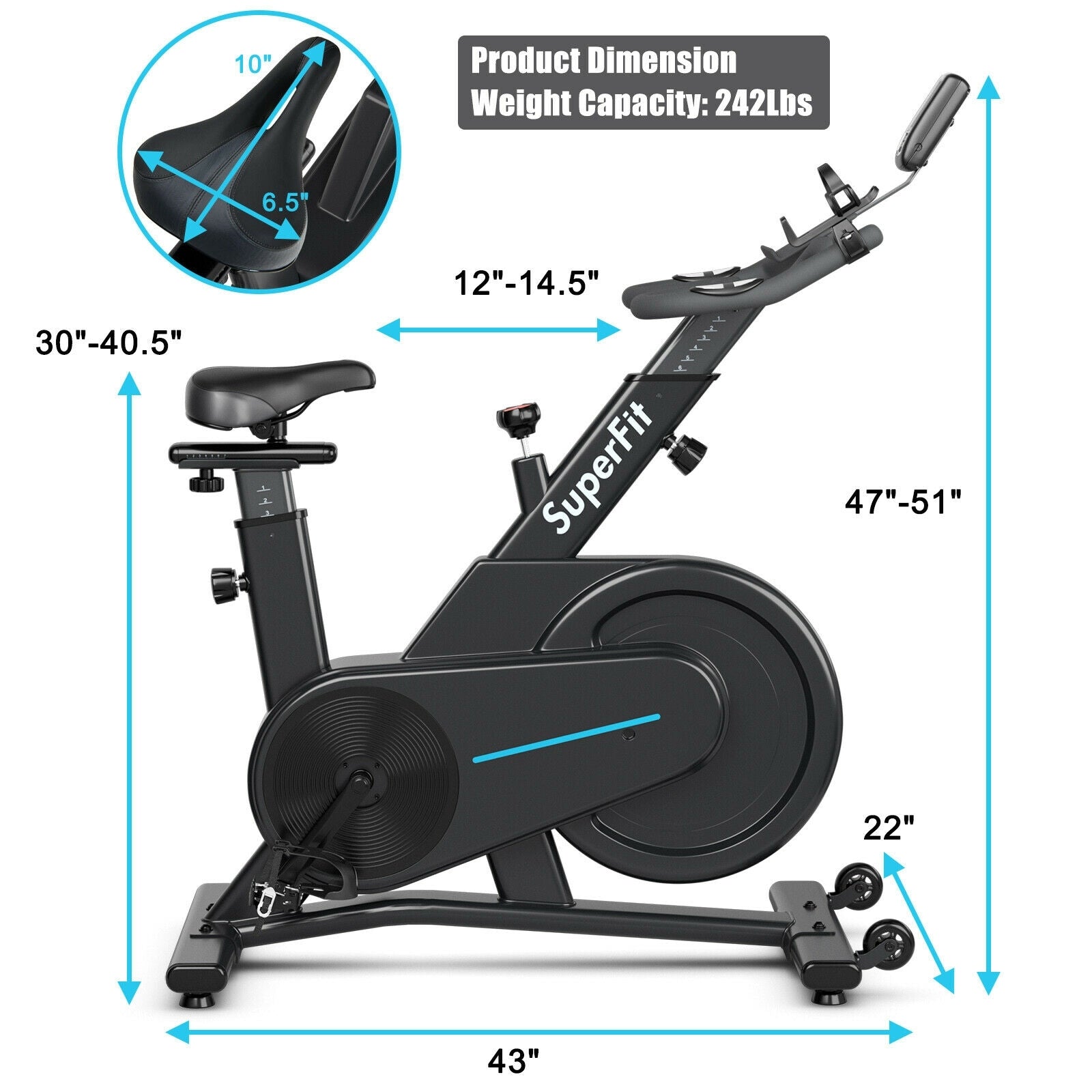 ● Personalized Exercise Bike: This indoor workout bike with adjustable seat and handlebar is suitable for people with different body sizes and cycling postures, which is perfect for various users from 4.9ft to 6.2ft. Besides, the professional fitness saddle is designed for longer periods of training.