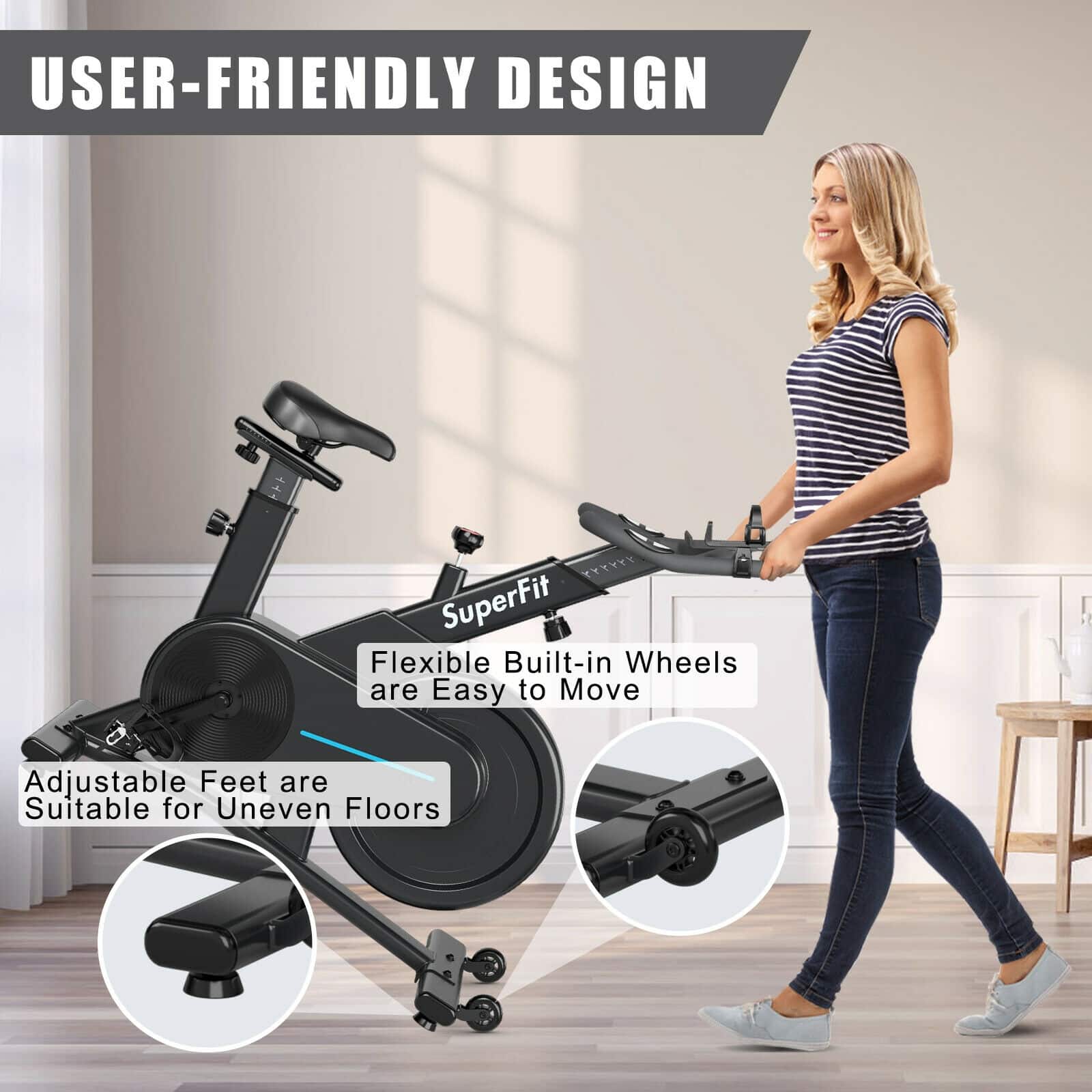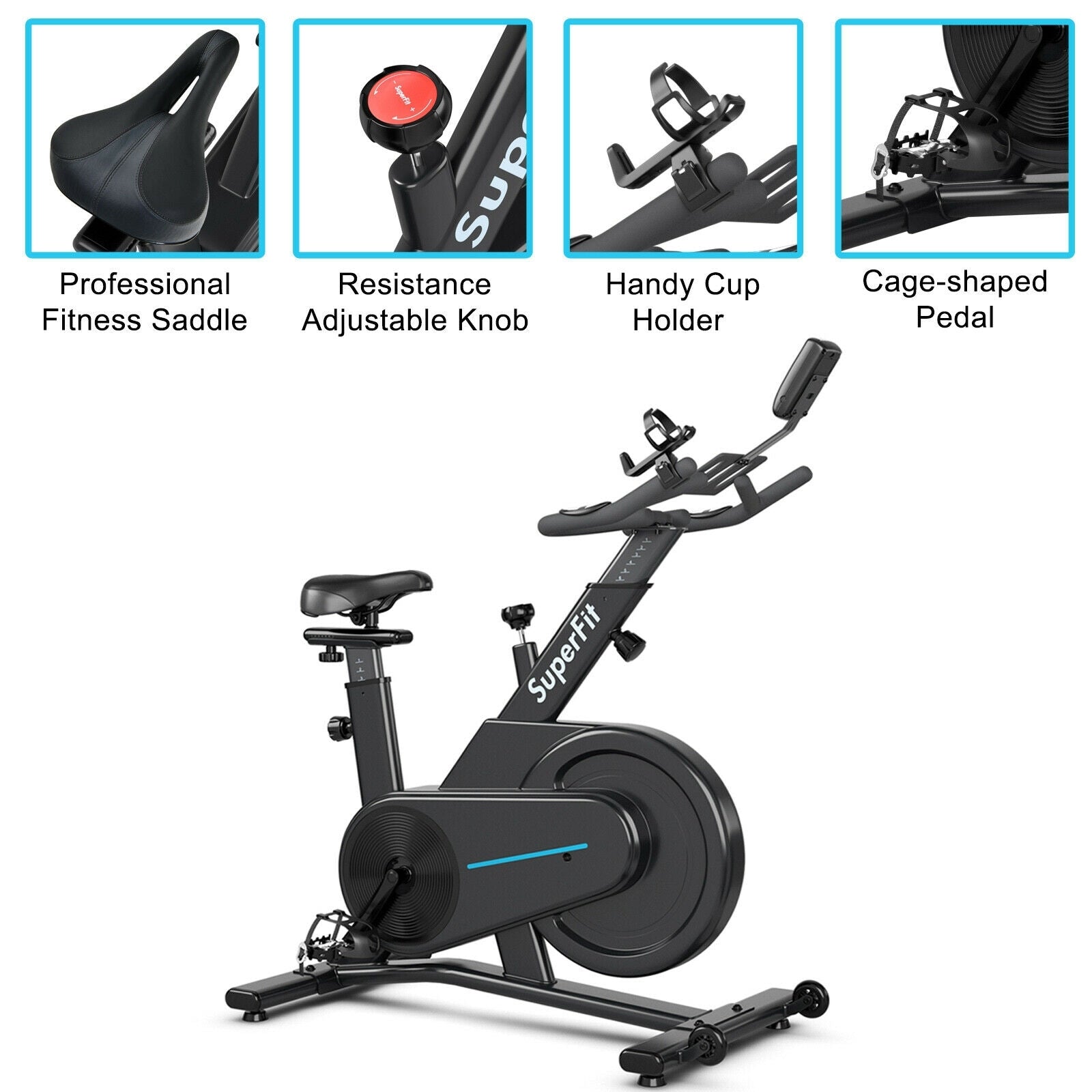 ● Easy and Safe to Operate: There is a load adjustment knob for you to customize your workout levels, which also works as an emergency brake. You can press the knob to stop the flywheel immediately. And the water bottle holder is conveniently located at arms length.