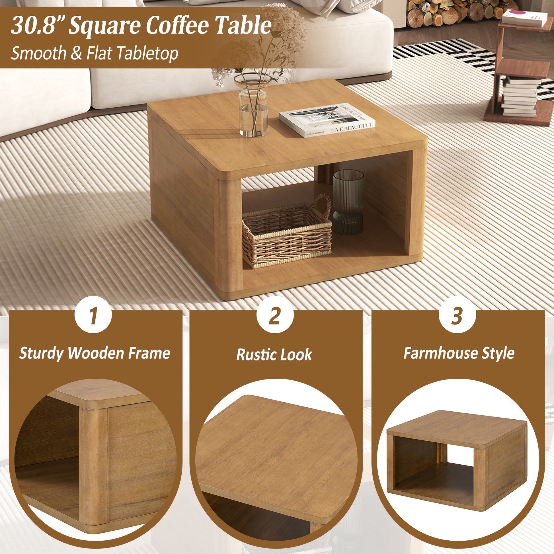 This square farmhouse coffee table brings rustic charm and natural warmth to your living room with its clean lines and natural wood texture. Designed with two tiers of storage and a half open compartment it provides both display space and hidden storage to keep your room organized. Crafted from durable engineered wood and supported by a sturdy frame this table offers lasting stability for everyday use. Measuring 30.8 inches it fits well in both large and small living areas making it a versatile and stylish centerpiece for modern farmhouse homes.