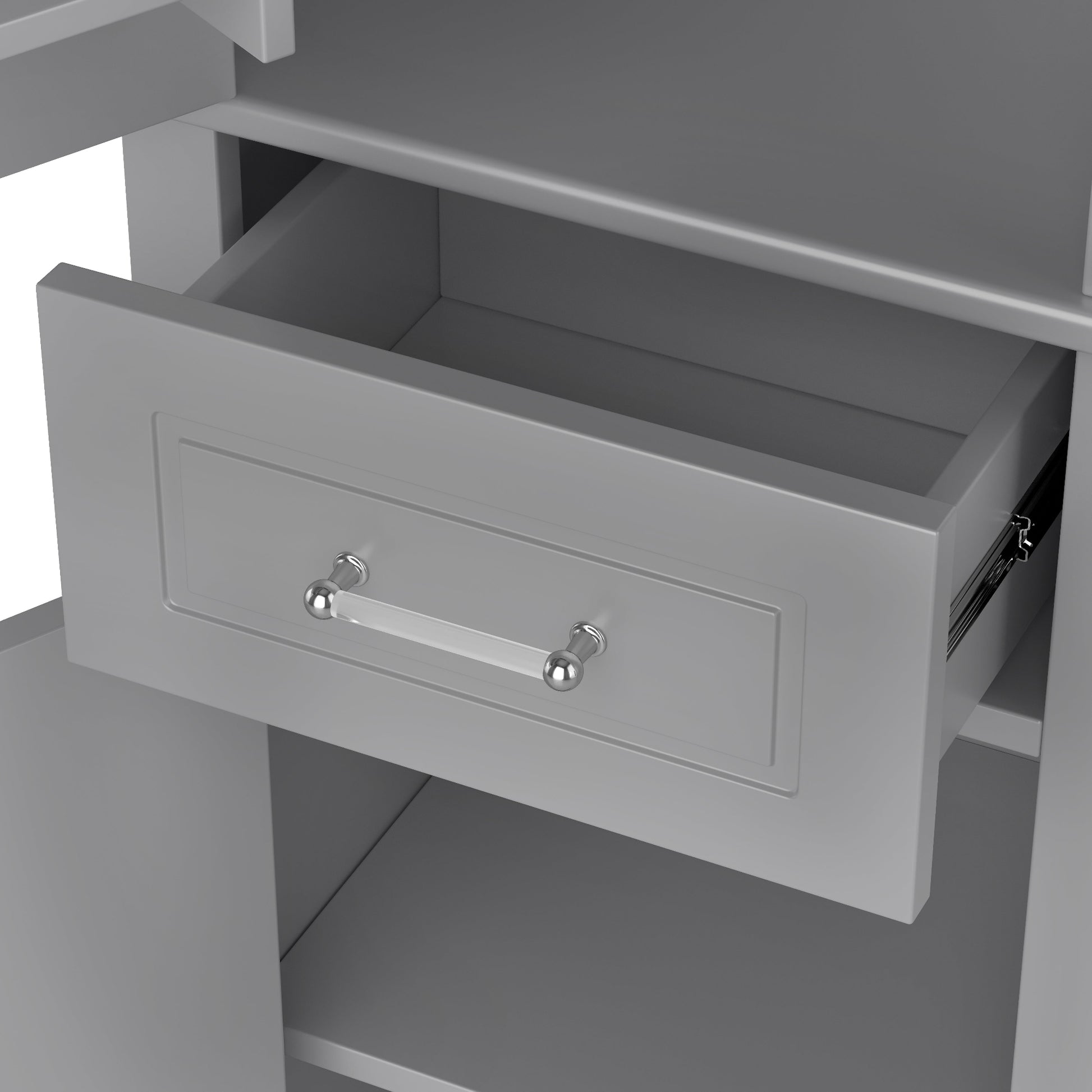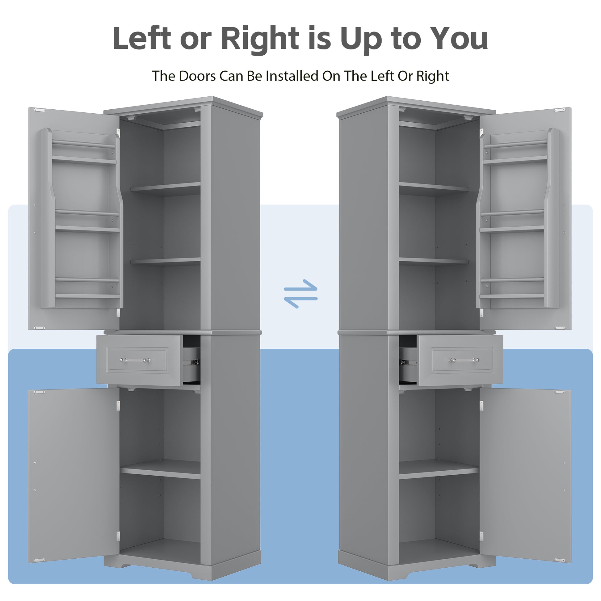 This storage cabinet is crafted from premium MDF boards with a sleek painted finish, offering durability and a smooth, water-resistant surface that is easy to clean. Acrylic bar handles allow effortless access to drawers and doors, combining functionality with stylish design. The second and bottom shelves are adjustable to three heights to accommodate items of various sizes, such as shampoo, towels, body lotion, paper towels, or storage baskets, fully meeting daily storage needs. The cabinet features four closed cabinets of different sizes, multifunctional door shelves, and two additional drawers, providing ample space to organize essentials and keep the room tidy. Smooth-gliding drawers with high-quality rails ensure convenient access. Equipped with an anti-toppling device to secure the cabinet to the wall and prevent accidents, protecting users and children. Package includes all assembly hardware and instructions, with pre-drilled holes in the MDF for easy installation. Rectangular design in grey, total capacity 200 lbs, two drawers, four doors, adjustable shelves, CARB P2 certified, made in Vietnam.