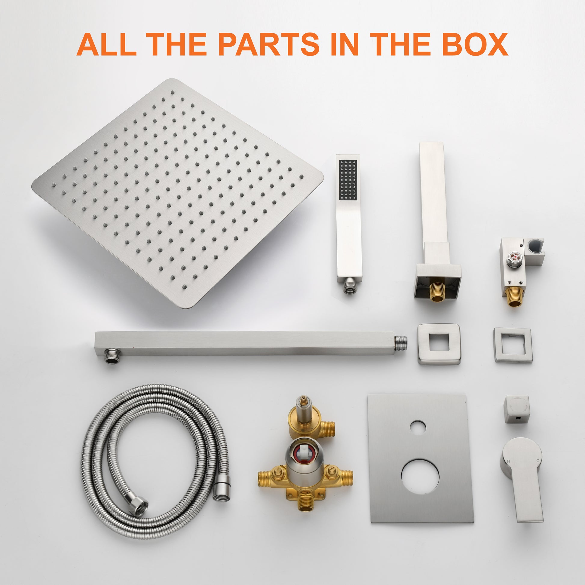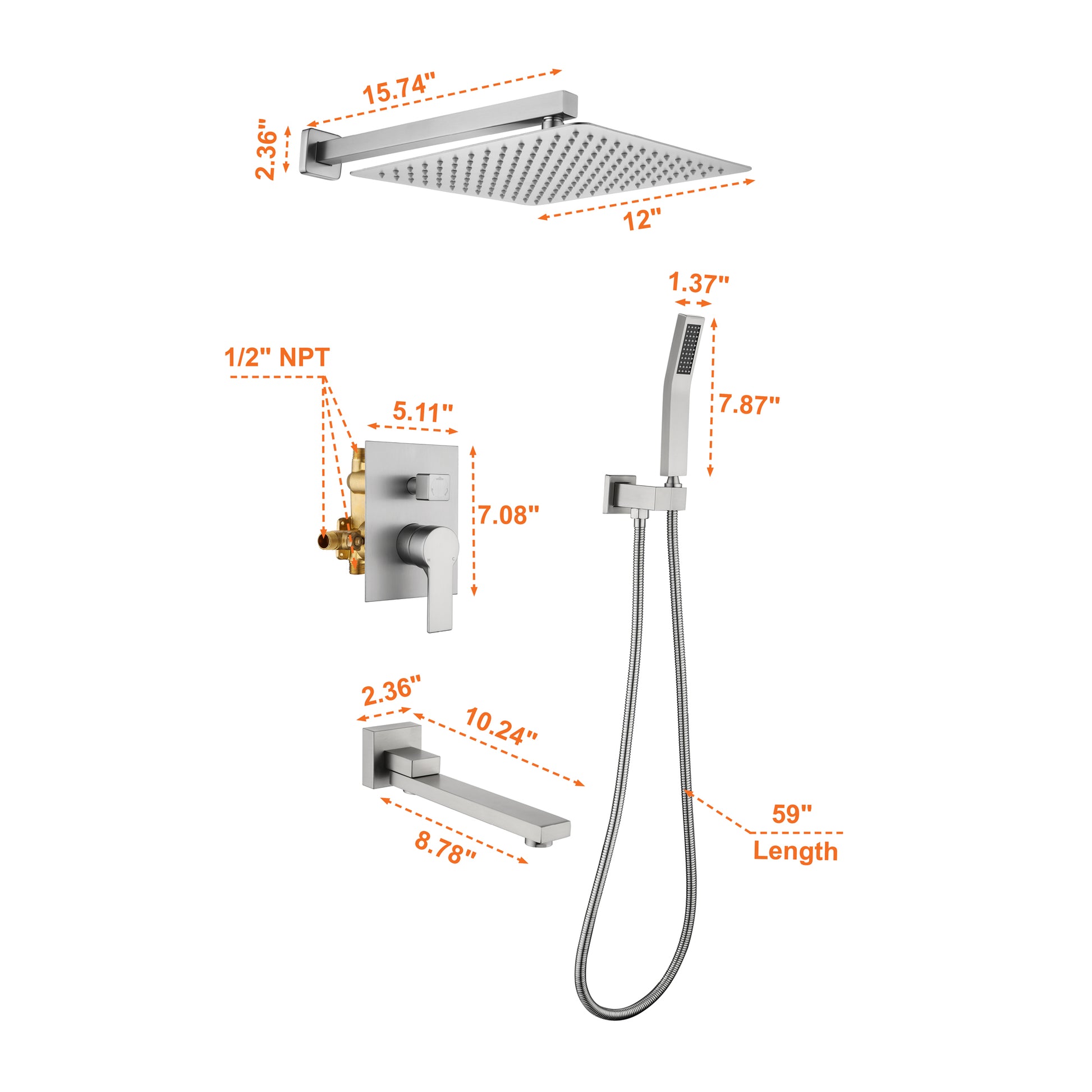 The Wall Mount Single-Handle 1-Spray Tub and Shower Faucet with Fixed Shower in Brushed Nickel-12 in. (Valve Included) features a cUPC certified advanced pressure balance ceramic disc cartridge that effectively prevents scalding injuries caused by sudden changes in hot or cold water pressure, the 3-in-1 switch design allows easy switching between three water modes with one key while supporting the simultaneous use of the fixed shower and handheld shower, the 12-inch fixed shower head can be rotated 360 degrees and the handheld shower angle can be adjusted via the shower holder for customized comfort, equipped with a 1.5-meter stainless steel shower hose that is corrosion resistant for long-term daily use, the 5 GPM tub spout ensures fast filling while the 1.8 GPM handheld shower meets daily rinsing needs, the tub spout can be rotated 180 degrees left or right to save space and prevent accidental bumps when not in use, with both functionality and stylish brushed nickel finish this set enhances your bathroom experience.