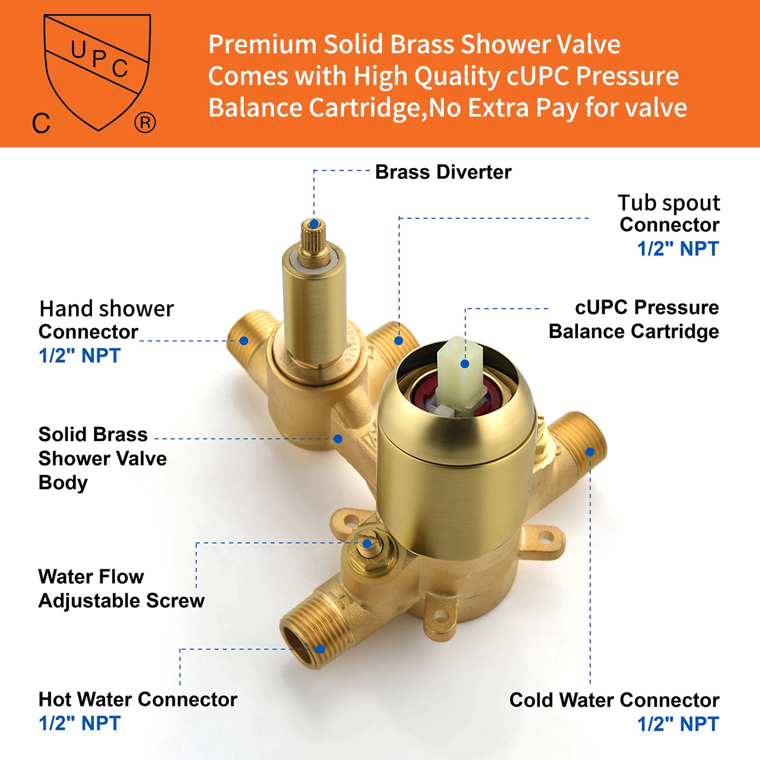 The Wall Mount Single-Handle 3-Spray Tub and Shower Faucet with Handheld Shower Head in Brushed Gold (Valve Included) features a cUPC certified advanced pressure balance ceramic disc cartridge to protect you and your family from scalding caused by sudden changes in water temperature. The adjustable shower holder allows you to set the shower angle according to your needs. The 3-function ABS handheld shower lets you choose the spray mode to suit your personal preference. With a 1 switch 2 control design, the shower and tub spout can be used simultaneously. The uniquely designed tub spout delivers a sufficient flow rate of up to 5 GPM, and the 1.8 GPM handheld shower meets daily rinsing requirements.