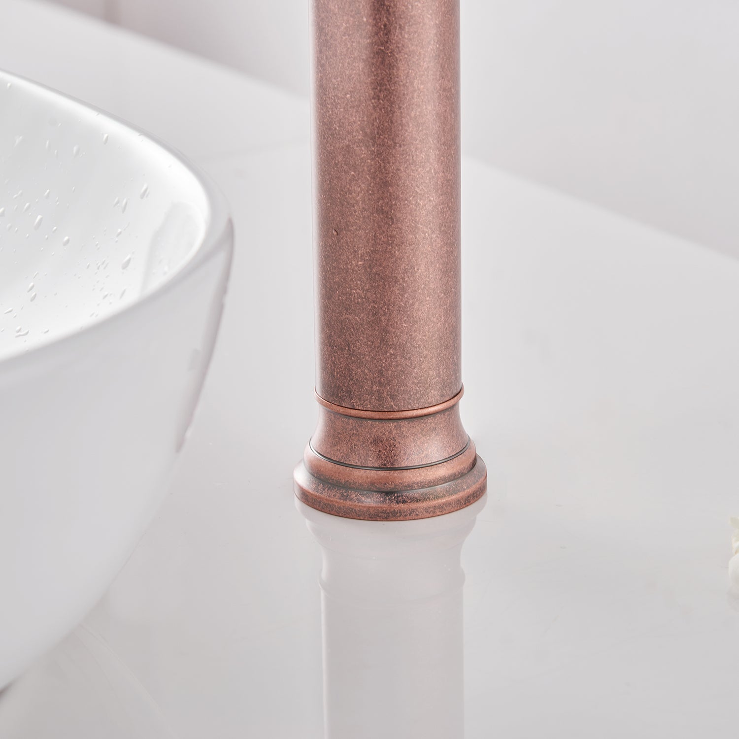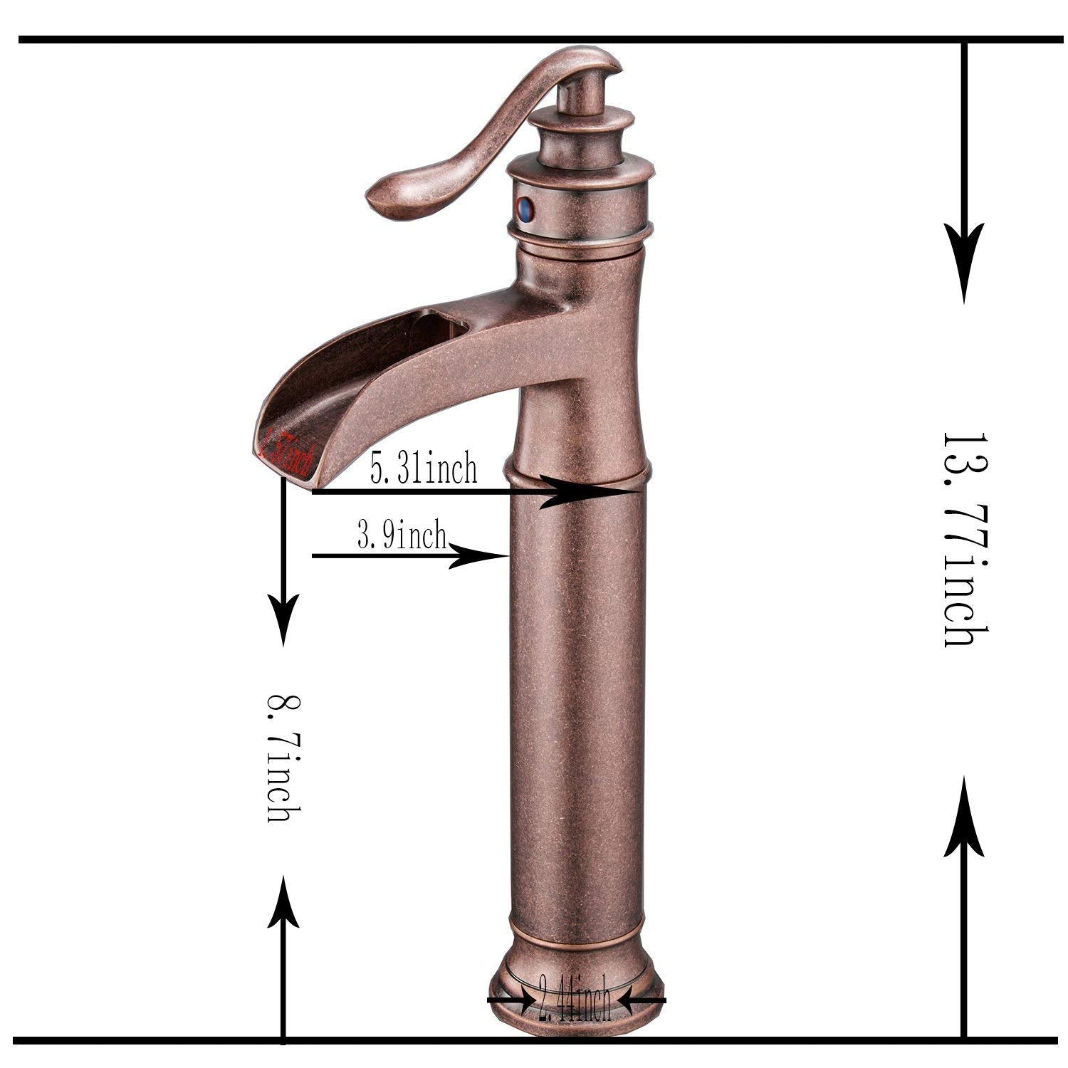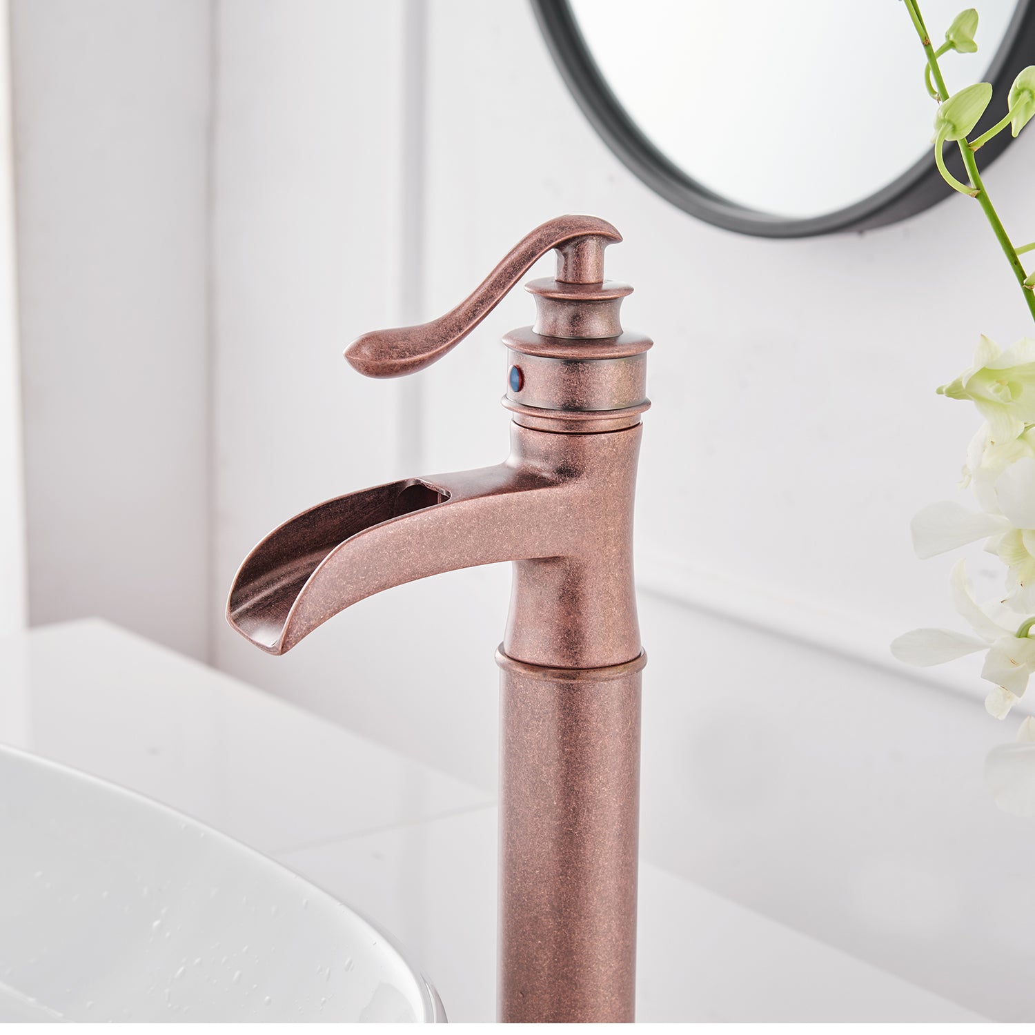 This vessel sink faucet features a single-handle design for effortless flow and temperature control. The spout delivers a clear and steady laminar stream, creating a beautiful waterfall-like presentation. Finished in copper, it offers an antique-inspired look while maintaining a contemporary style, suitable for a variety of bathroom décors. Constructed from low-lead brass, the faucet is durable, safe, and long-lasting. The set includes a pop-up drain (without overflow), hot and cold water supply hoses, and all necessary accessories for convenient DIY installation. Designed for easy installation, it has undergone rigorous corrosion and pressure testing, and foam-padded packaging ensures safe shipping. Its simple and elegant design is perfect for contemporary and farmhouse-style vessel sinks.