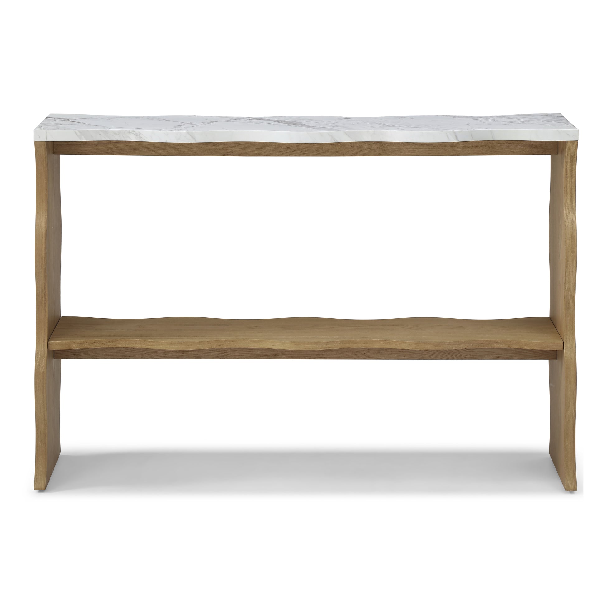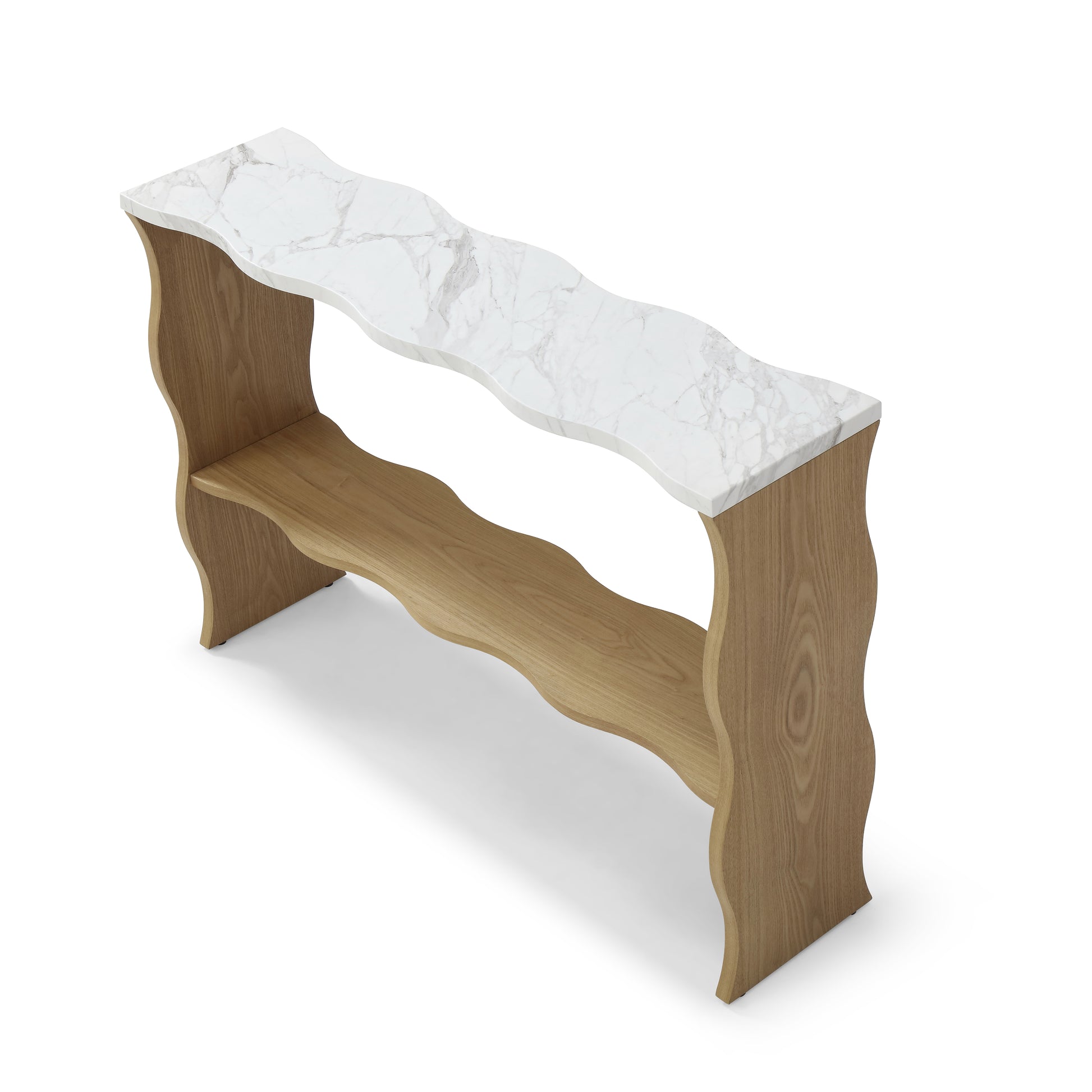 This Whisper of Waves modern console table features an elegant marble pattern top paired with a naturally curved wave inspired lower shelf, bringing a harmonious blend of modern simplicity and artistic flow. Crafted with durable marble pattern laminate and solid wood veneer, the table enhances any entryway, living room, or hallway with refined texture and visual depth. Its two level open shelf structure provides functional display and storage space while maintaining a sleek and contemporary aesthetic.