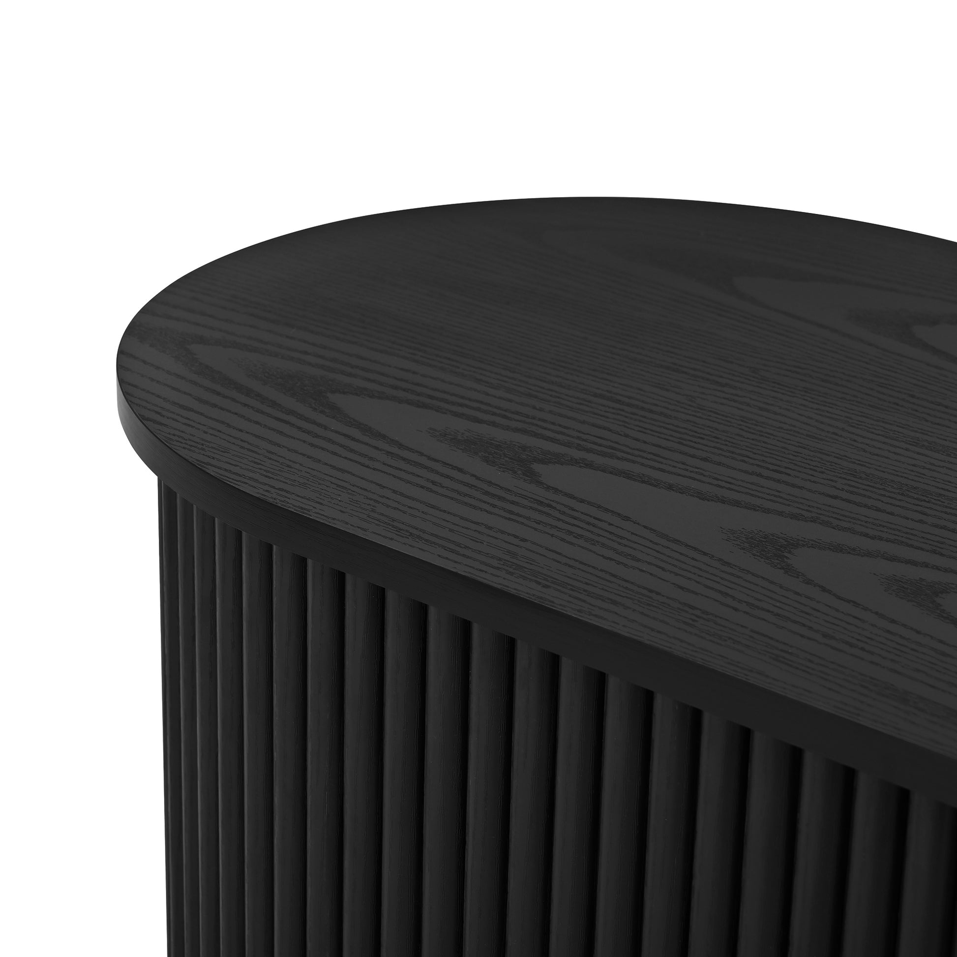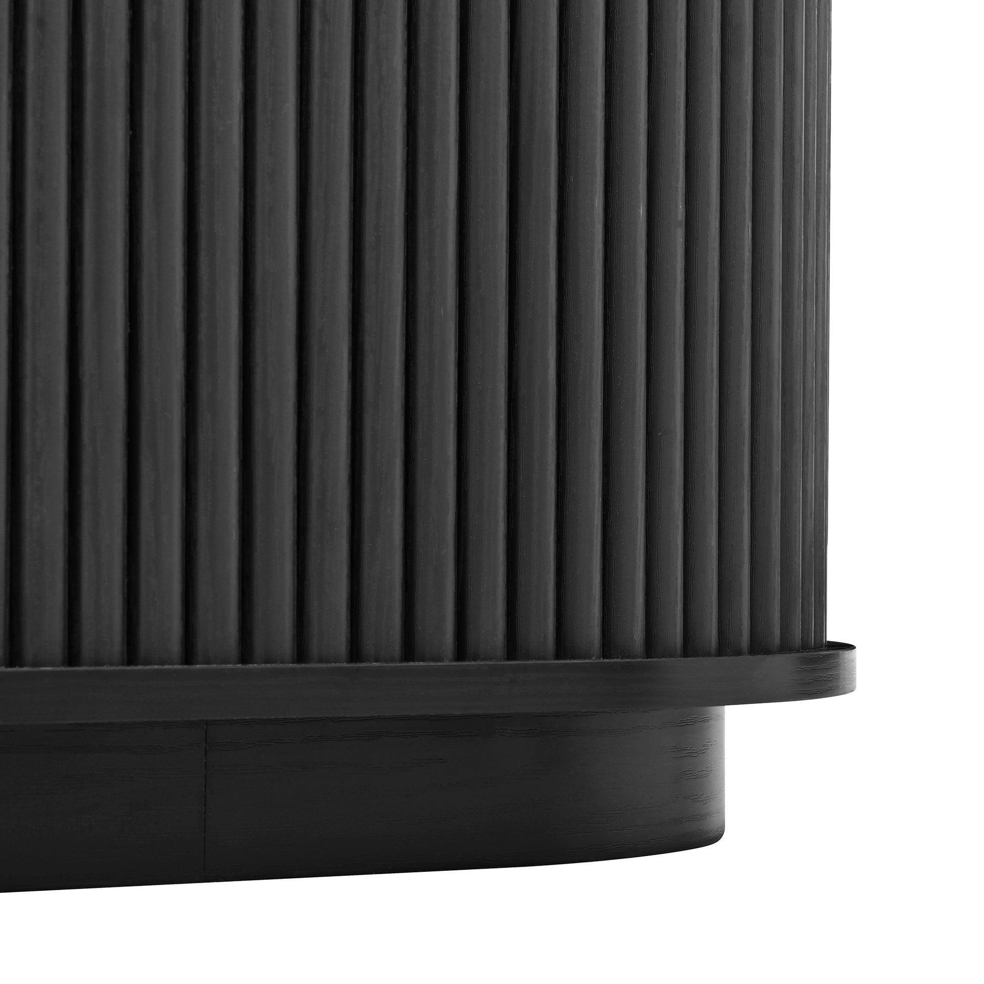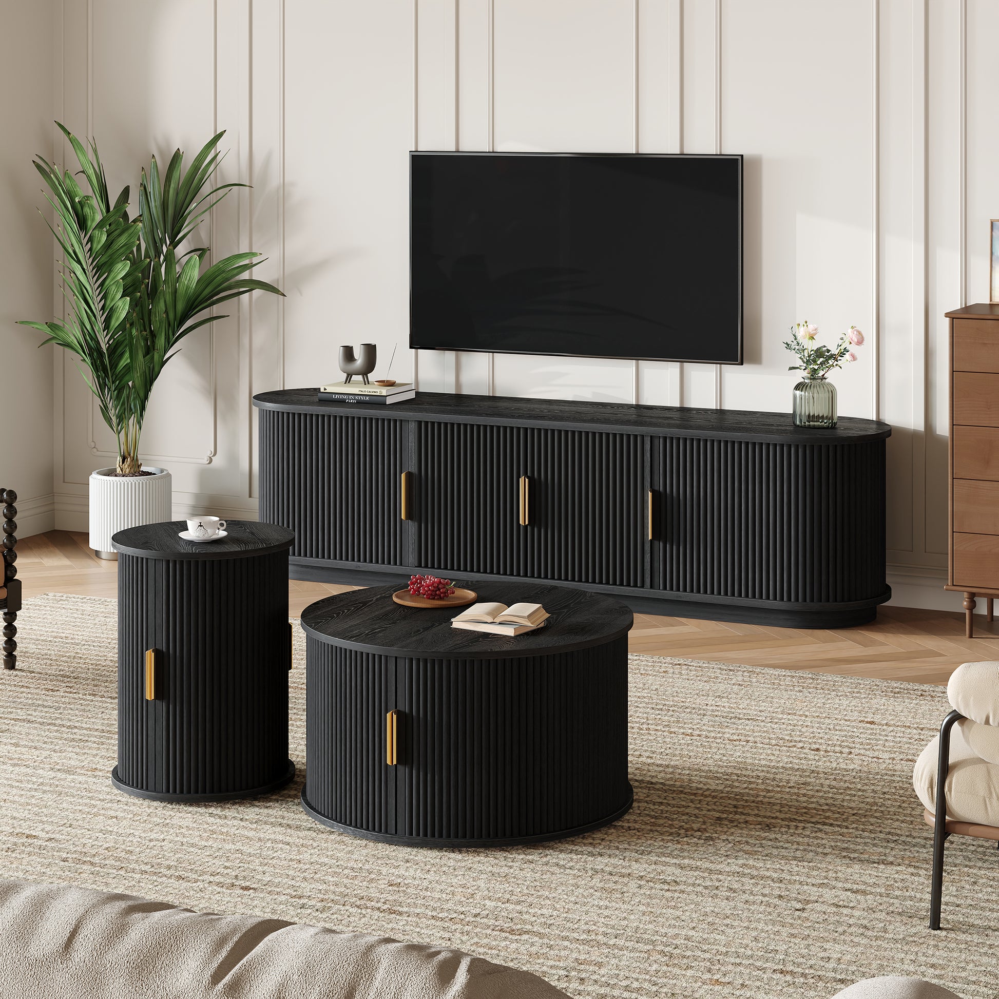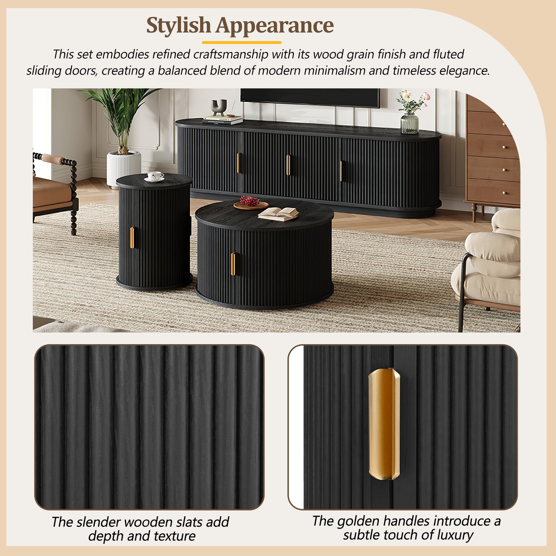 This wooden TV stand and coffee table set showcases a sleek black wood grain finish blended with refined fluted sliding doors for a balanced modern and elegant look. The TV console provides generous storage with multiple compartments, adjustable shelves, and a cable management hole to keep your entertainment area neat. The two piece coffee table set includes a low wide table and a tall slim table that can be used together or placed separately for flexible layout options. Built with durable MDF and smooth sliding mechanisms, this set is designed to deliver long lasting quality, functional storage, and aesthetic appeal to any living space.